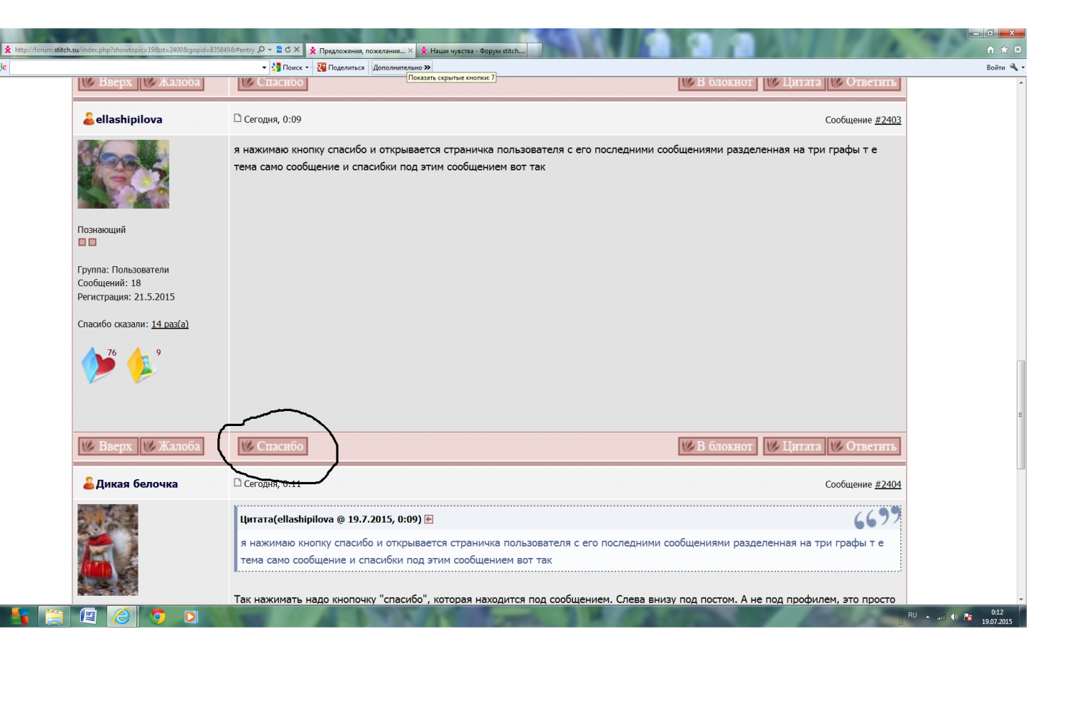 18 июля 2015 я нажимаю кнопку спасибо и открывается страничка пользователя с его последними сообщениями разделенная на три графы т е тема само сообщение и спасибки под этим сообщением вот так Так нажимать надо кнопочку "спасибо", которая находится под сообщением. Слева внизу под постом. А не под профилем, это просто счетчик, сколько раз кому "спасибкнули". Жмите под этим сообщением эту кнопочку, чтобы проверить. ellashipilova, Aleksandra и Wian сказали спасибо Поделиться сообщением Ссылка на сообщение