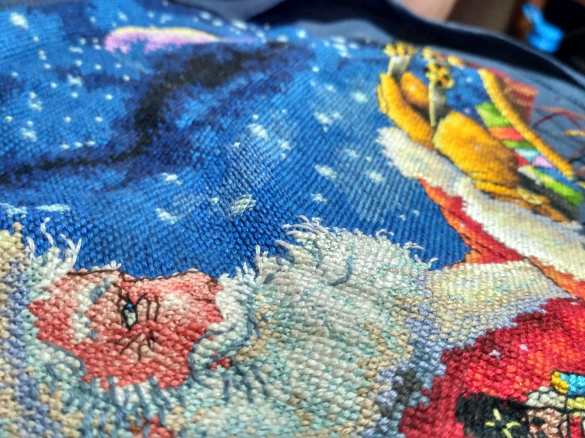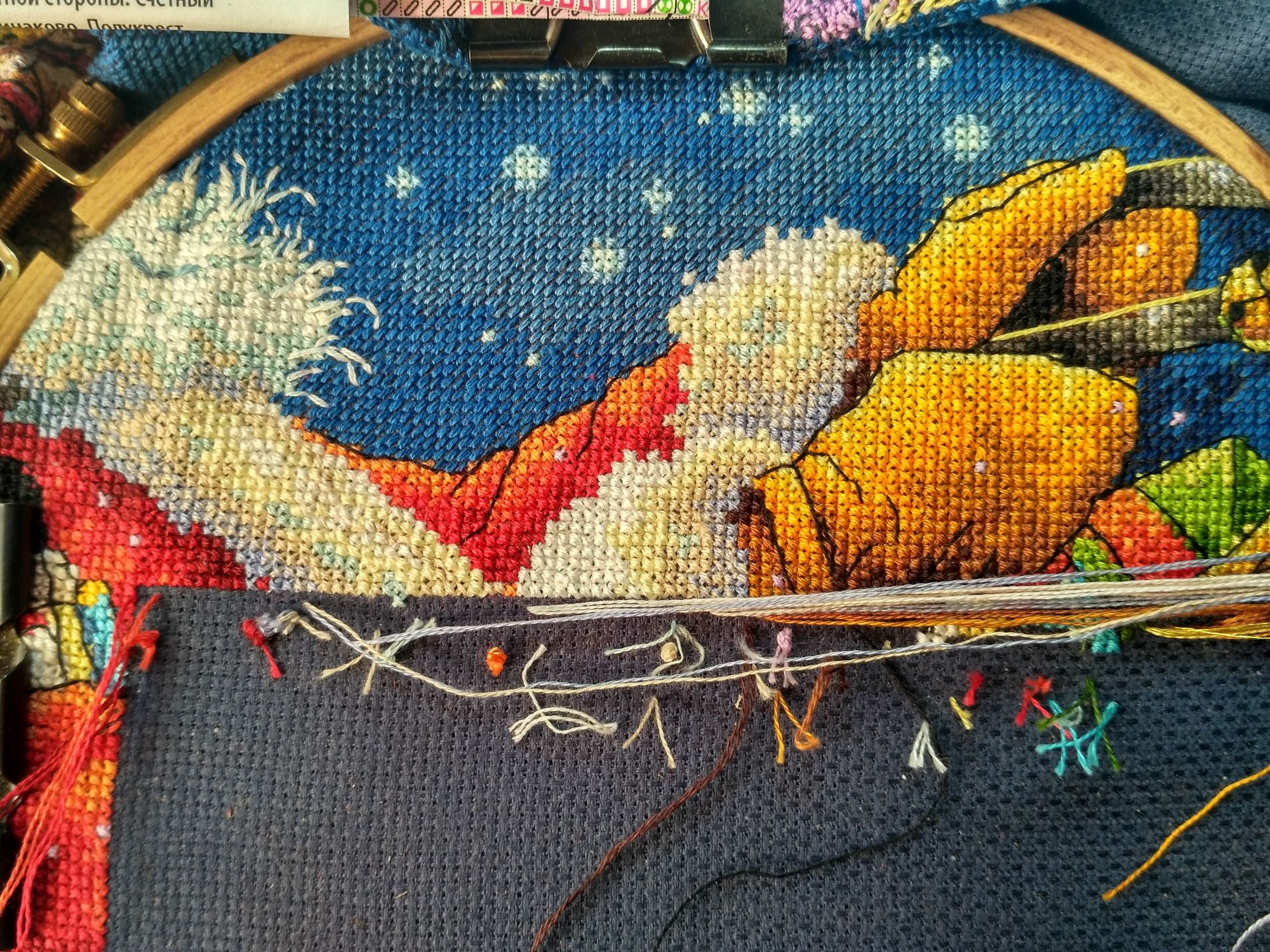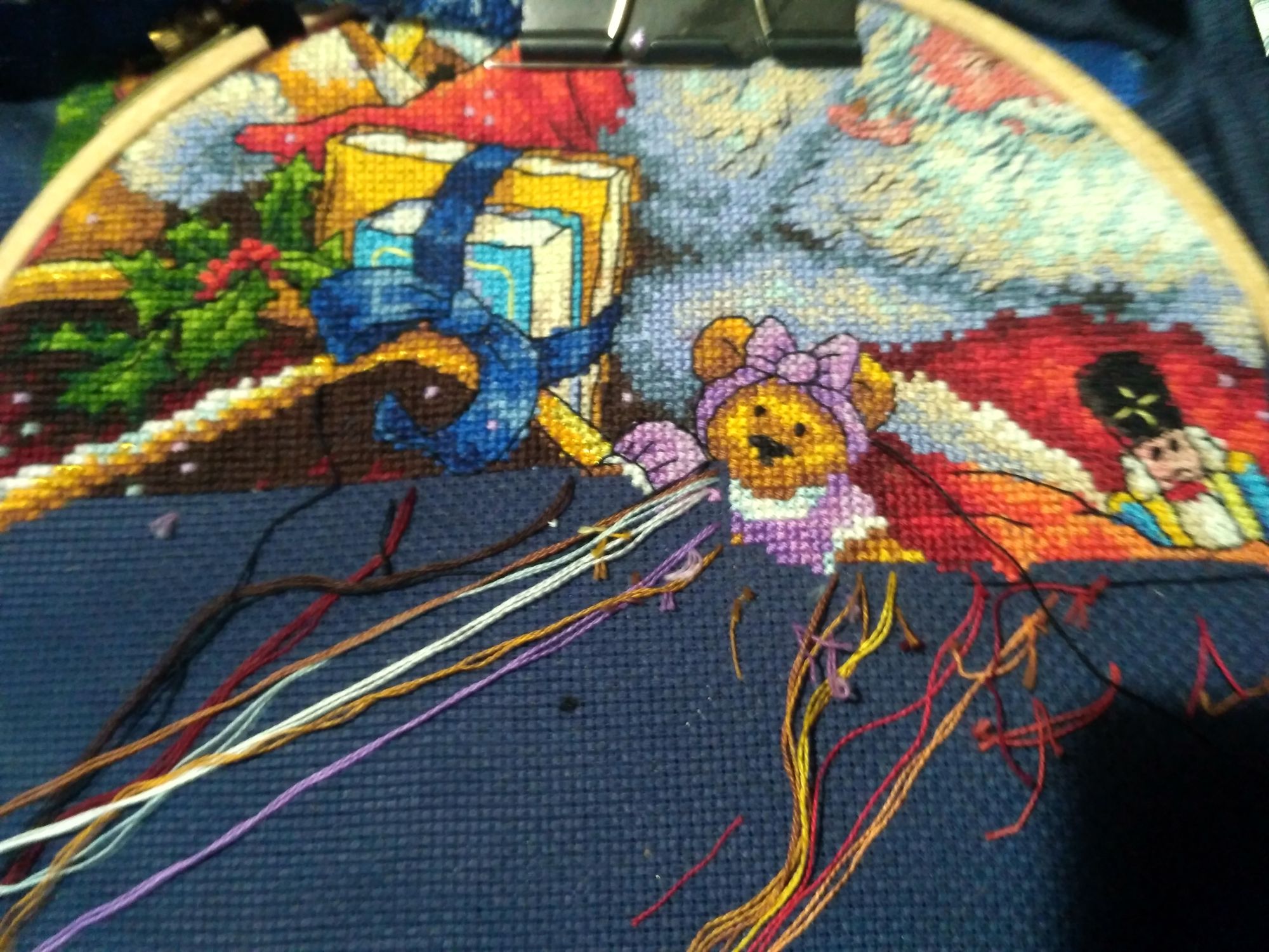 9 мая 2018 День выдался продуктивный! Всех с праздником Великой победы!! У меня появились подарки. Окошки дома это выкладная нить белая, в сбруе лошади уже пошел металлик и узелки. А вот носик обезьяне я переделала, по схеме он состоит просто из двух узелков, как и глаза, но мне очень не нравился такой нос, сделала стандарт - один узел)) Так же появляется лицо Дедушки и волшебный голубой глаз!!! ( как у брата Дамблдора в осколке зеркала). Над беком глаза и лица пришлось попыхтеть, напомню, 18 канва, и рисонок беру в одну клеточку. Но результат как всегда шикарный. И мне очень нравится как смотрится зеленая ветвь на фоне меха шапки (кстати, сюда очень просится мохер для распушки) CherepOlka, татьяна0674, СветланаЛФ и 17 других сказали спасибо Поделиться сообщением Ссылка на сообщение