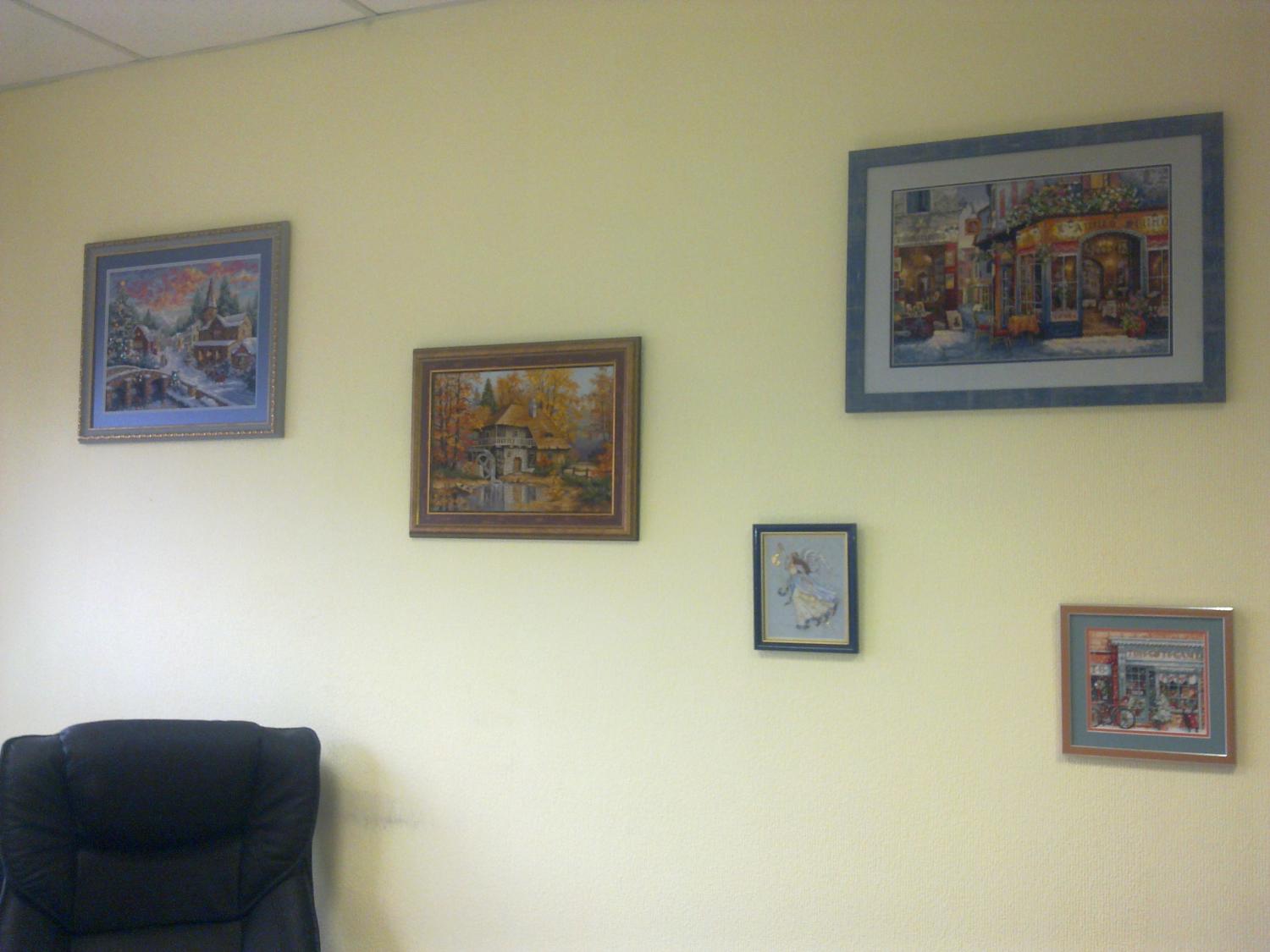19 марта 2014 а вот так смотрятся мои картины на работе в моем кабинете (директор тут же сидит): я, конечно, понимаю, что вместе они не живут, но . Ангел бы вышит оч давно и поселился первым. Потом пришла деревушка (живет возле окна, чтобы со входа было видно как сияют пайетки), Лука-с недавно пришел на ПМЖ) магазинчик уже полгода как. ну и бистро)) Красиво все смотрится... Но мне бы жалко было такую красотень на работе оставить... Мой хомяк сразу же взбунтовался бы. viena сказал(а) спасибо Поделиться сообщением Ссылка на сообщение