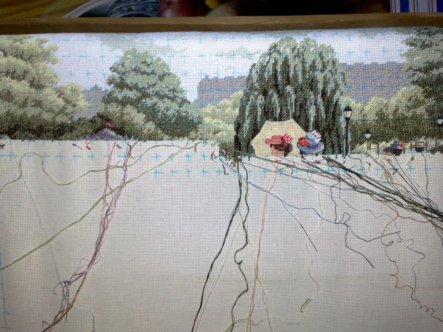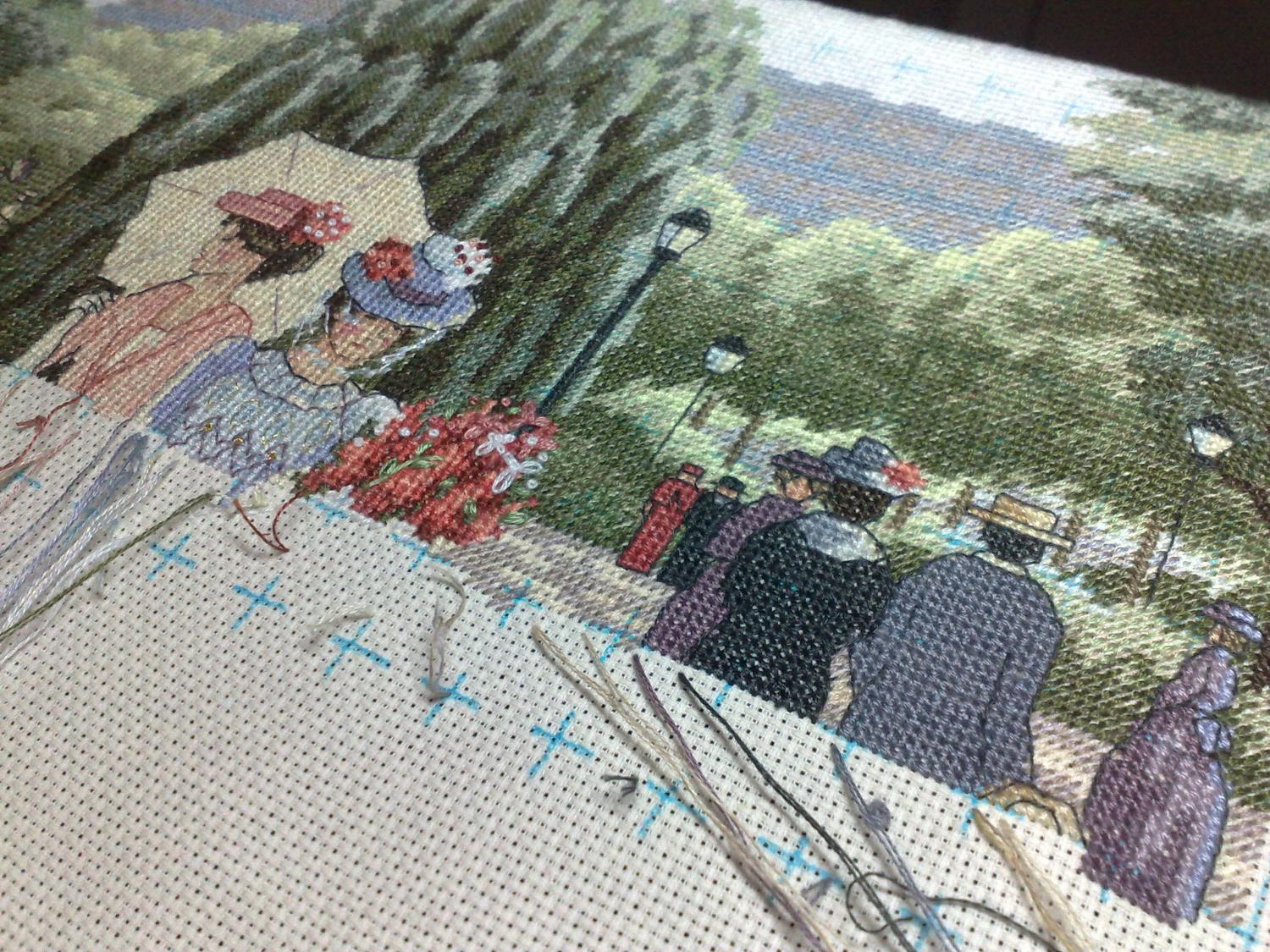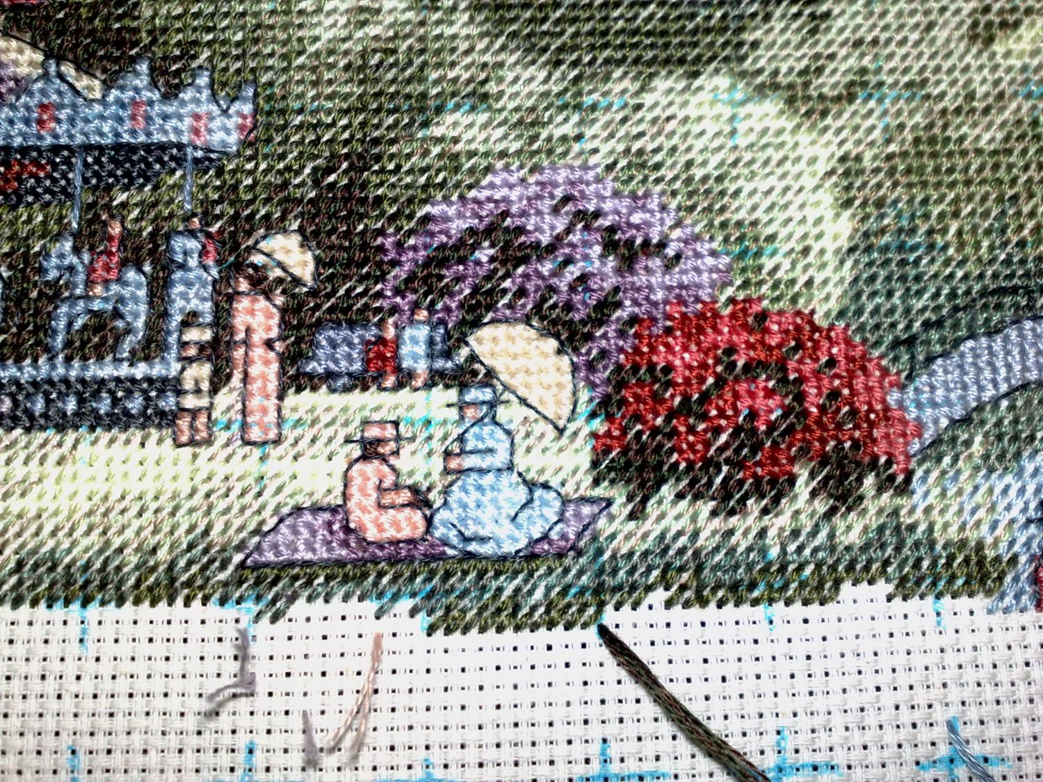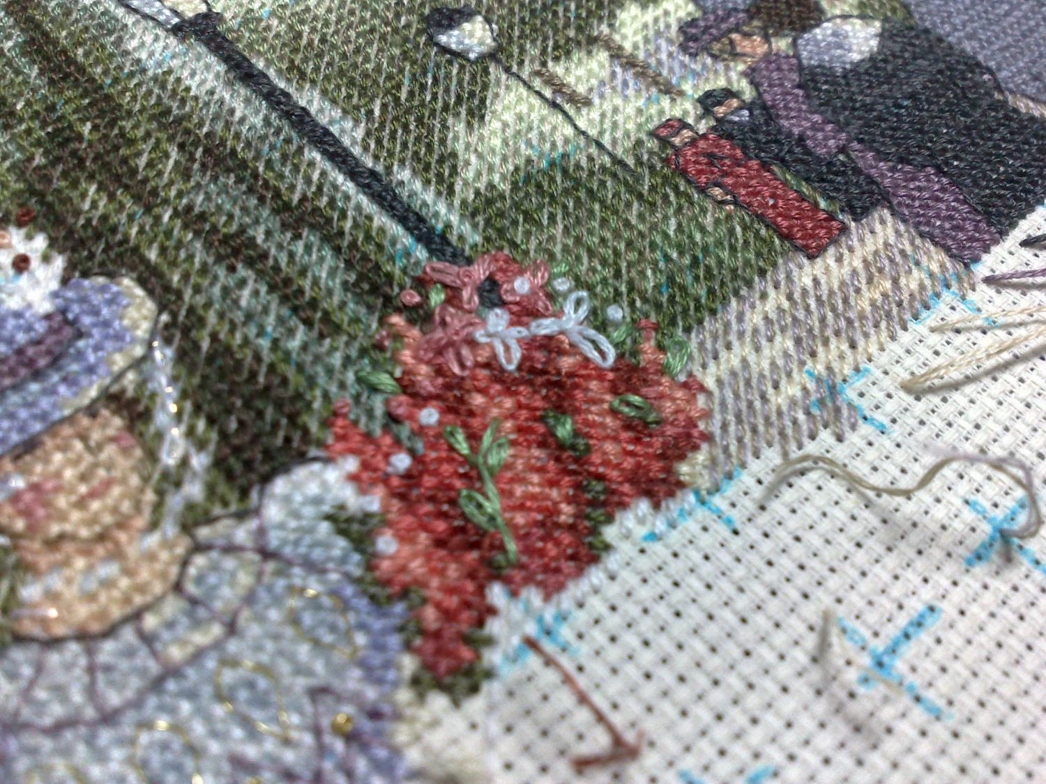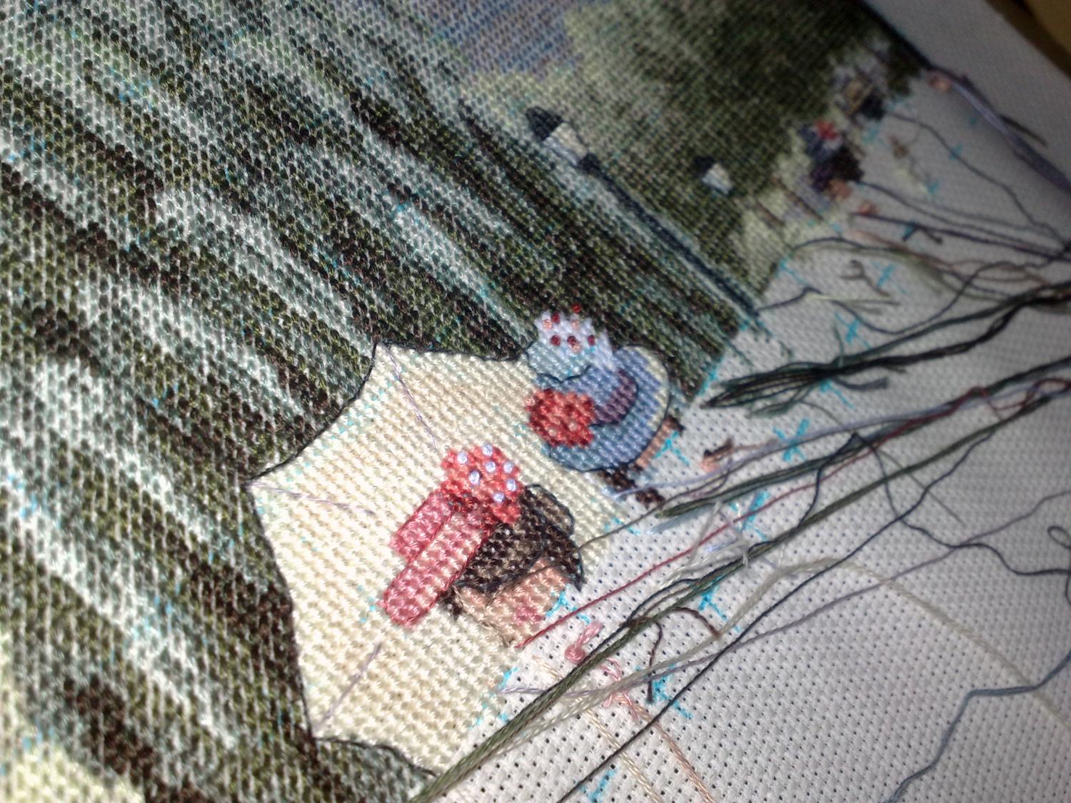 25 августа 2014 а мы растем) еще одна полоса и будет ровно половина! общий вид: а теперь вкусняшки (извините кое-где фото засветились): каруселька и человечки утомили даже меня (дааа, я представляю как я буду пыхтеть над уютным укрытием там одни эти мелочи) (мне кажется, что тут нитки значительно темнее, чем в оригинале), как-то завален левый угол относительно всей картины: пикничок (сидящие тети очень понравились, такие малявки, а так платье хорошо сделаны): мостик, под мостиком недошита лодочка: а теперь барышни. Тут расскажу подробнее. Когда начала вышивать правую даму в голубом платье, никак не могла понять почему на лице голубые вставки, дважды перепроверила не ошиблась ли я, а вот когда начала вышивать бек поняла что эти типа вуали или газовый платок, и меня почему это привело в дикий восторг и я прошлась любимым крейником 032, теперь газовый платок сияет и блестит)), а на платье часть рисунка (капельки) я сделала золотым металликом плюс добавила три фрузика, так же золото планируется на подоле внизу: а вот к букету я вообще подошла творчески максимально) по схеме там только красные узелки. я из лейзи-дейзи сделала цветочки с фрузилами в середке, двух цветов, всего 5 штук, а так же россыпь узелков, из зеленой нити сделала вети травы как вставляют в букеты: ну и прохожие: и еще раз общий вид: magistr, Moloko, Juliay и 13 других сказали спасибо Поделиться сообщением Ссылка на сообщение