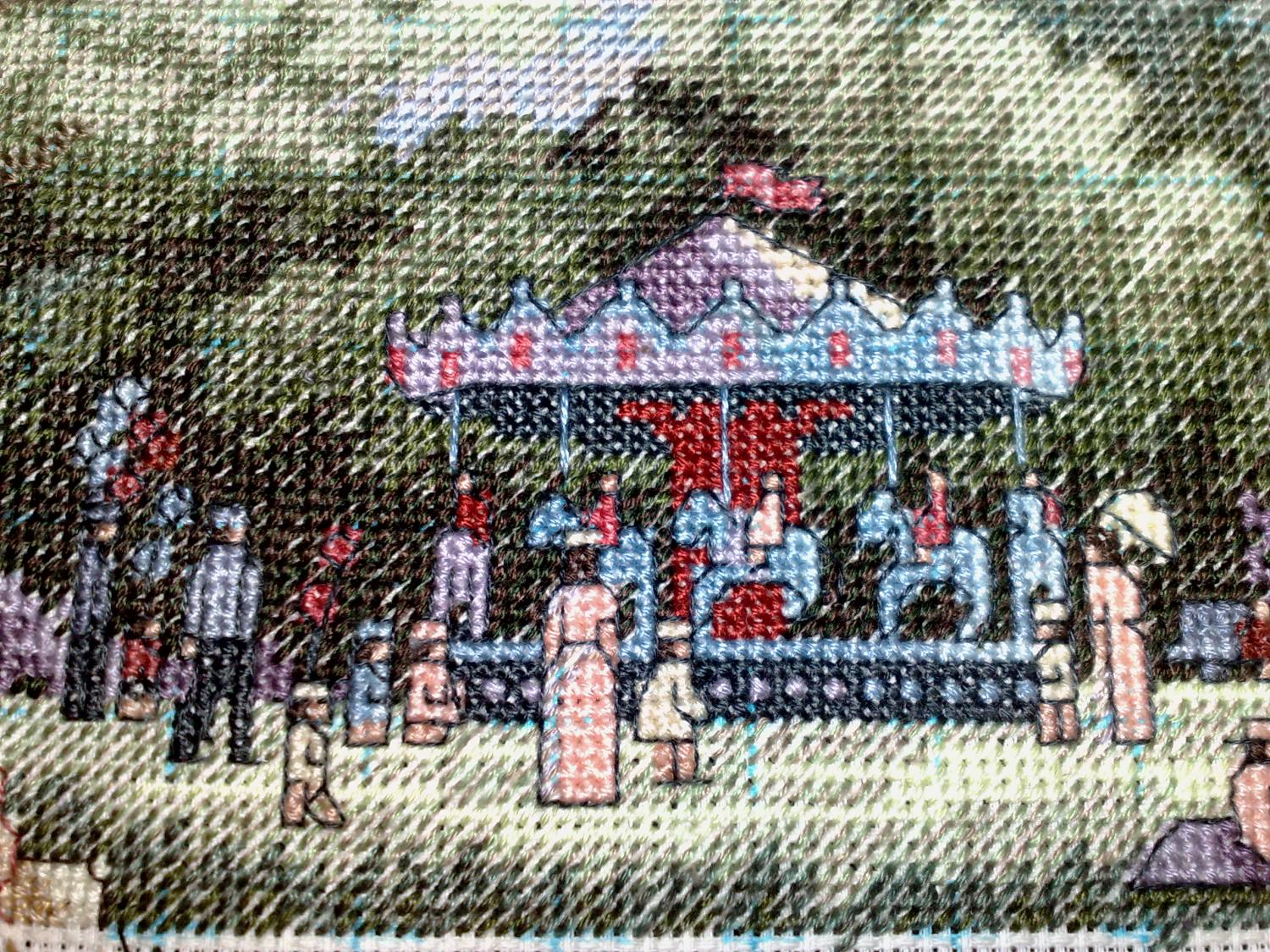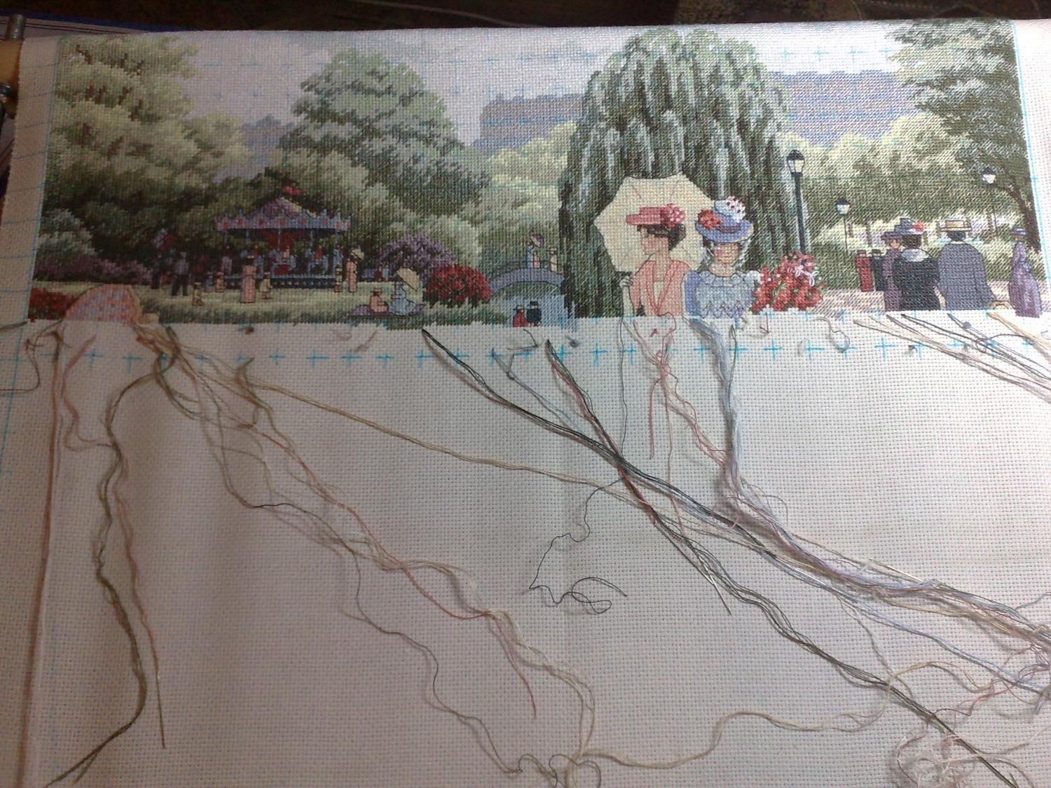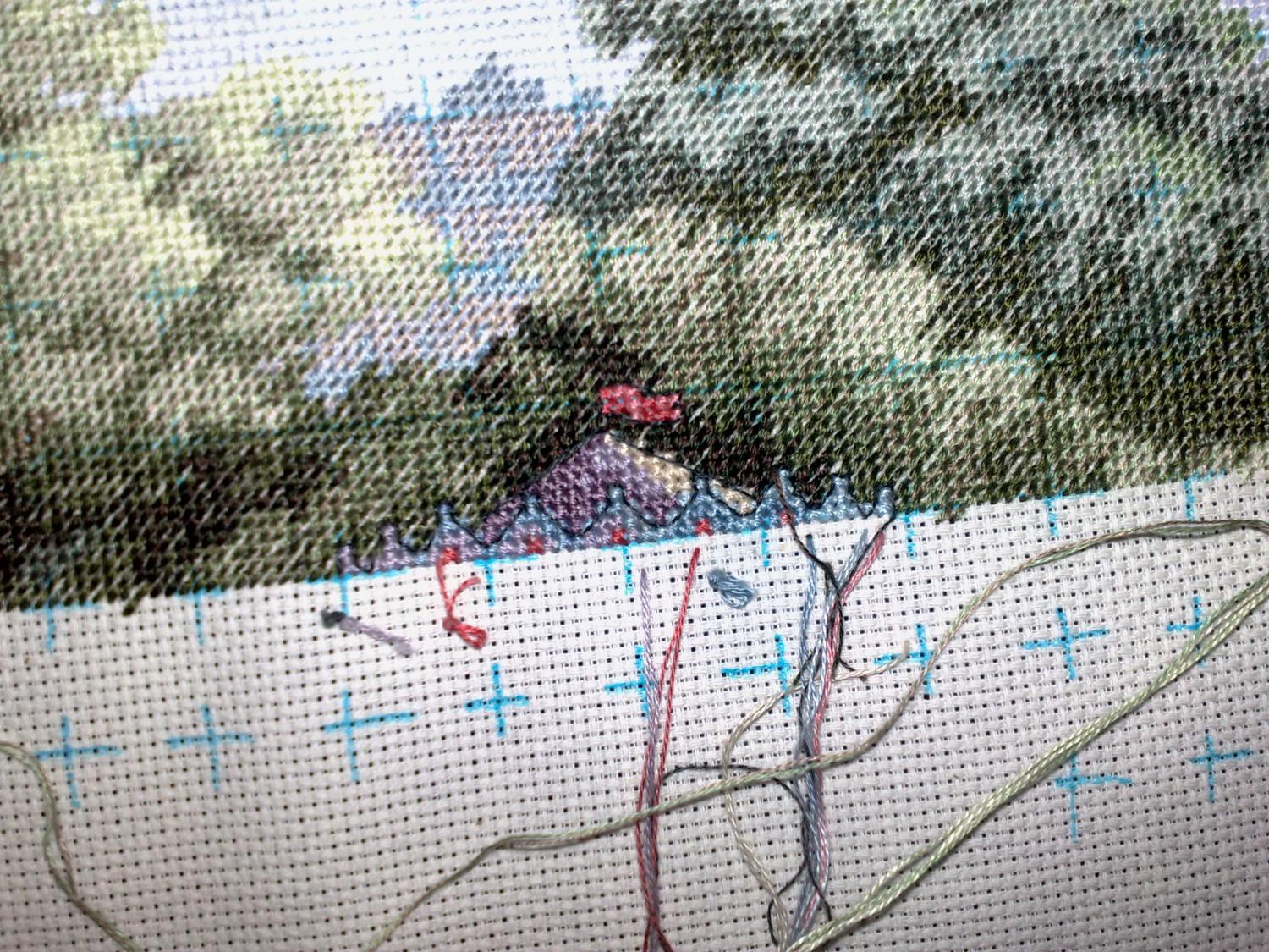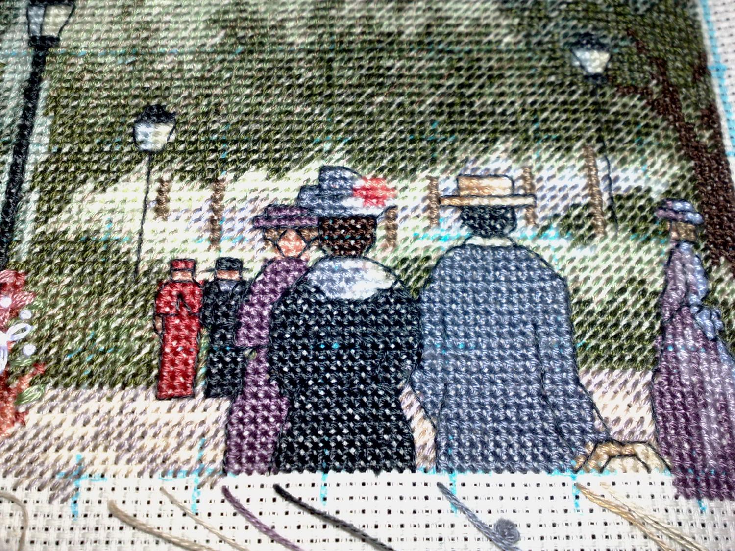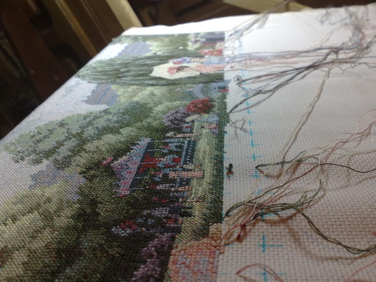 25 августа 2014 а мы растем) еще одна полоса и будет ровно половина! общий вид: а теперь вкусняшки (извините кое-где фото засветились): каруселька и человечки утомили даже меня (дааа, я представляю как я буду пыхтеть над уютным укрытием там одни эти мелочи) (мне кажется, что тут нитки значительно темнее, чем в оригинале), как-то завален левый угол относительно всей картины: пикничок (сидящие тети очень понравились, такие малявки, а так платье хорошо сделаны): мостик, под мостиком недошита лодочка: а теперь барышни. Тут расскажу подробнее. Когда начала вышивать правую даму в голубом платье, никак не могла понять почему на лице голубые вставки, дважды перепроверила не ошиблась ли я, а вот когда начала вышивать бек поняла что эти типа вуали или газовый платок, и меня почему это привело в дикий восторг и я прошлась любимым крейником 032, теперь газовый платок сияет и блестит)), а на платье часть рисунка (капельки) я сделала золотым металликом плюс добавила три фрузика, так же золото планируется на подоле внизу: а вот к букету я вообще подошла творчески максимально) по схеме там только красные узелки. я из лейзи-дейзи сделала цветочки с фрузилами в середке, двух цветов, всего 5 штук, а так же россыпь узелков, из зеленой нити сделала вети травы как вставляют в букеты: ну и прохожие: и еще раз общий вид: magistr, Moloko, Juliay и 13 других сказали спасибо Поделиться сообщением Ссылка на сообщение
