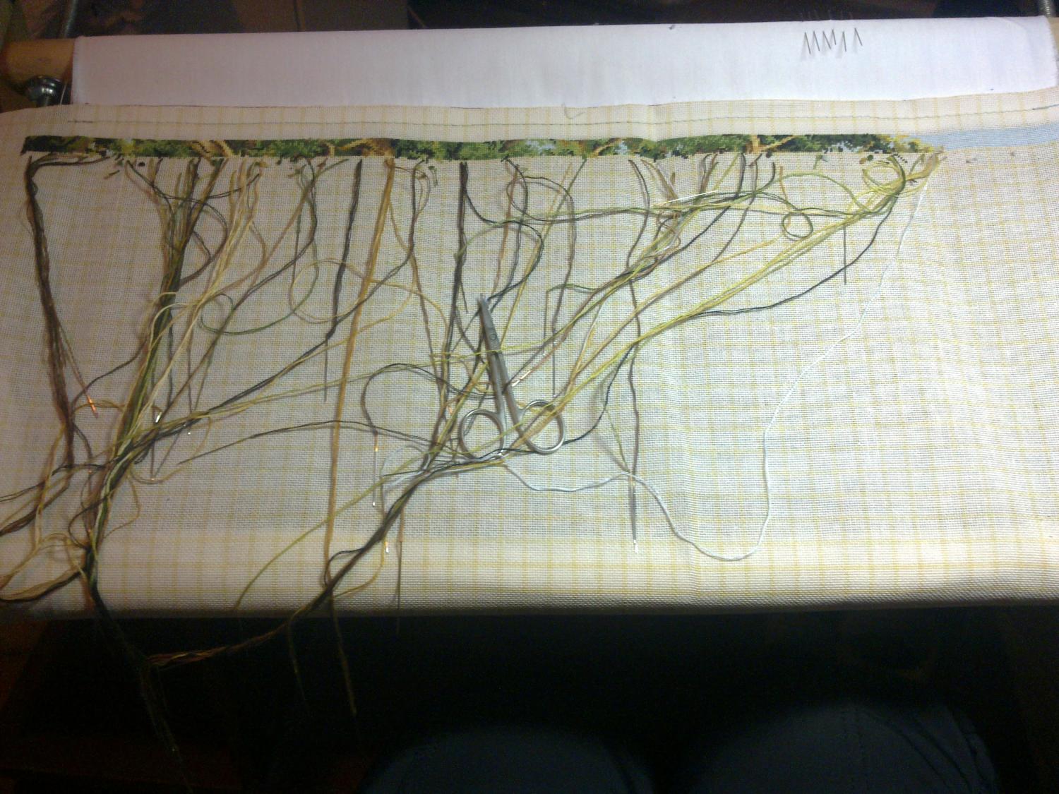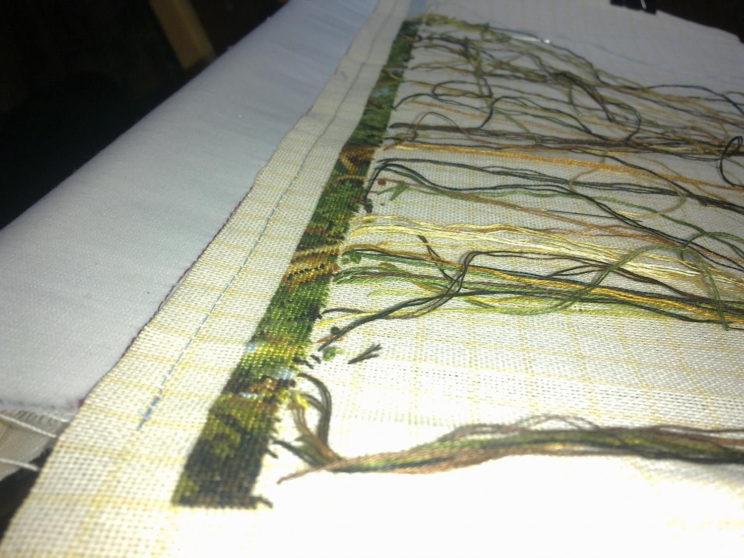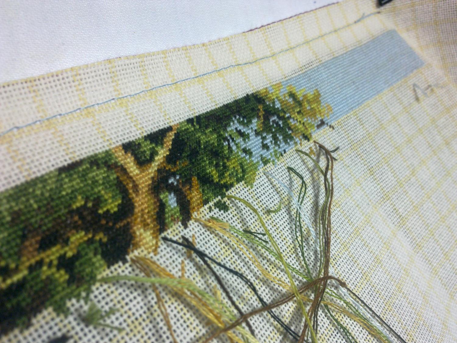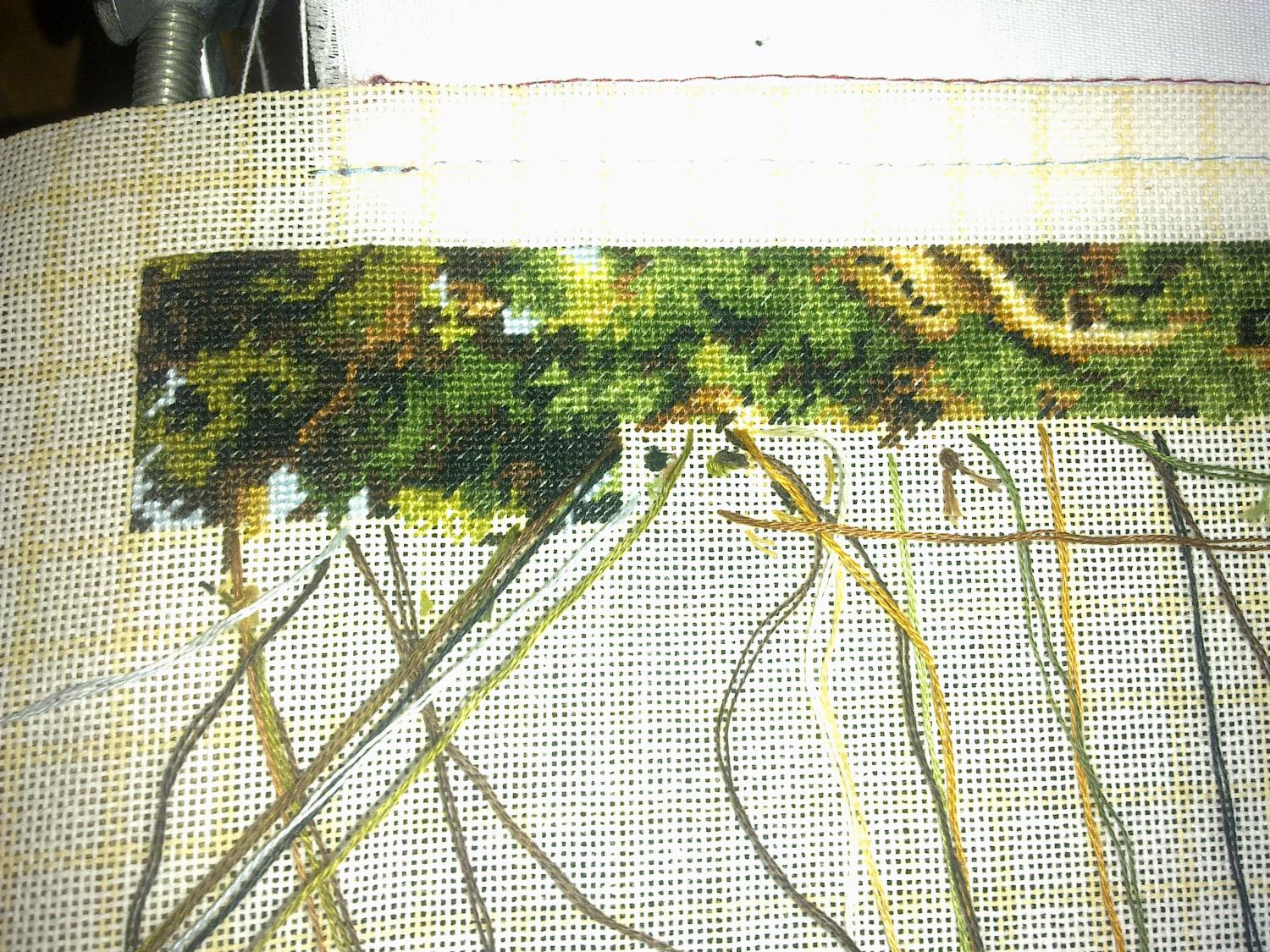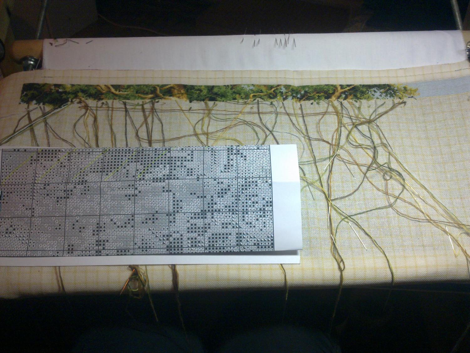 27 января 2015 Показываю небольшое продвижение. Начала третью строчку. Все-таки гобелен это медитация, тык-тык иголочкой... но вышиваю я все равно в дань привычки и, личного для меня, удобства, парковкой по квадратам, дело вцелом пошло быстрее, потому что первую строчку я вводила нитки, а теперь уже ввожу меньше, тем самым трачу время на вышивание, а не тыканье туда-сюда. А вот небо голубое в один цвет я вішивала строчкой в один полукрестик до конца.На прошлом гобелене я сделала ошибку вышивая одноцветность квадратом, в результате и так родная разметка квадратами на канве была подчеркнута еще и моими кривыми ручонками. Поэтому теперь я умнее Немного фоток, общий вид и детальки (уже деревце видно). черные нитки плохие - какие-то тонкие и дырочку не перекрывают полностью. А схема чуток подкачала, два вида черных трехугольников и буква О и D в квадрате очень не читаются... Татуся, Lena_Dm, Бондаренко и 6 других сказали спасибо Поделиться сообщением Ссылка на сообщение