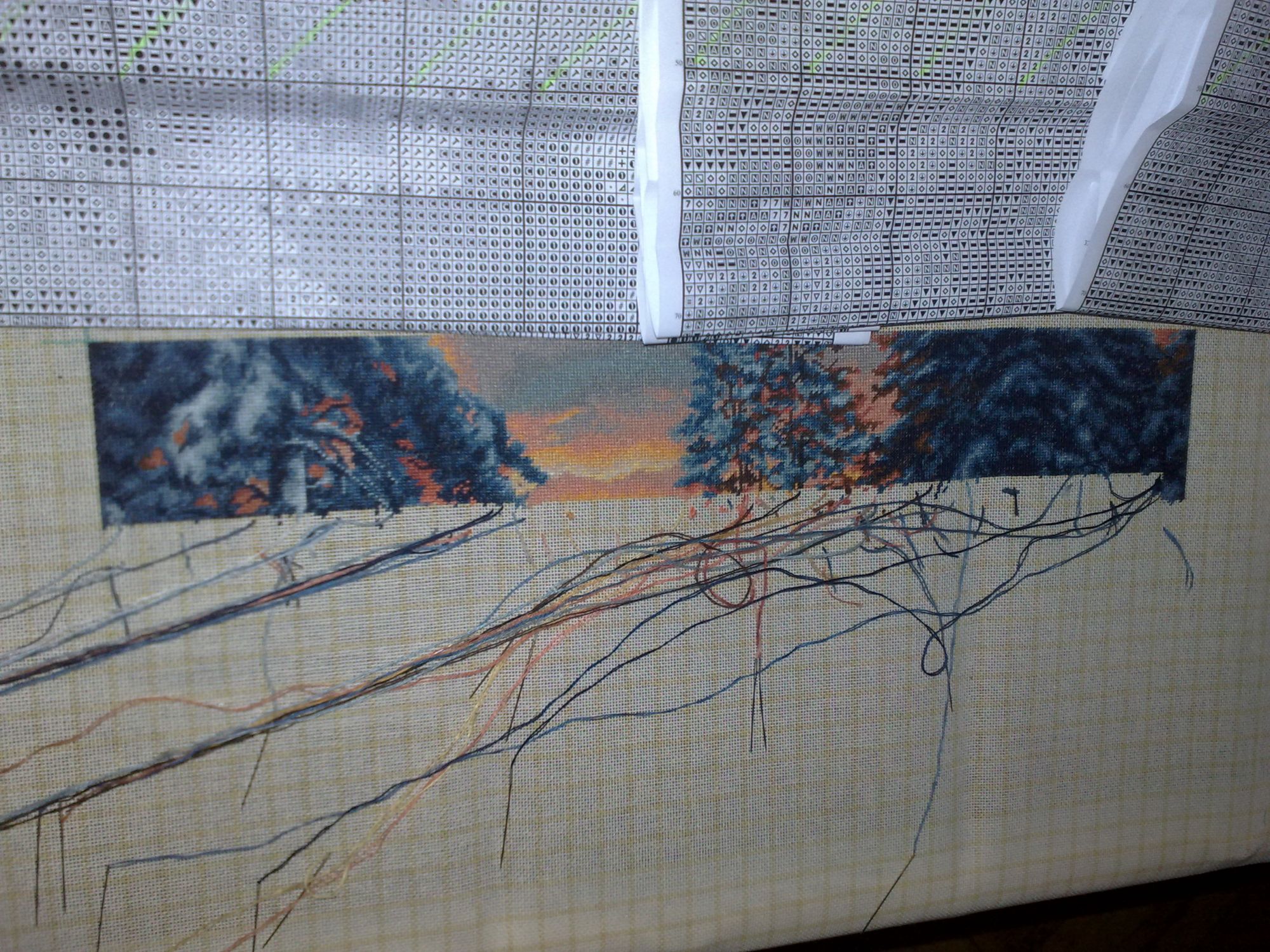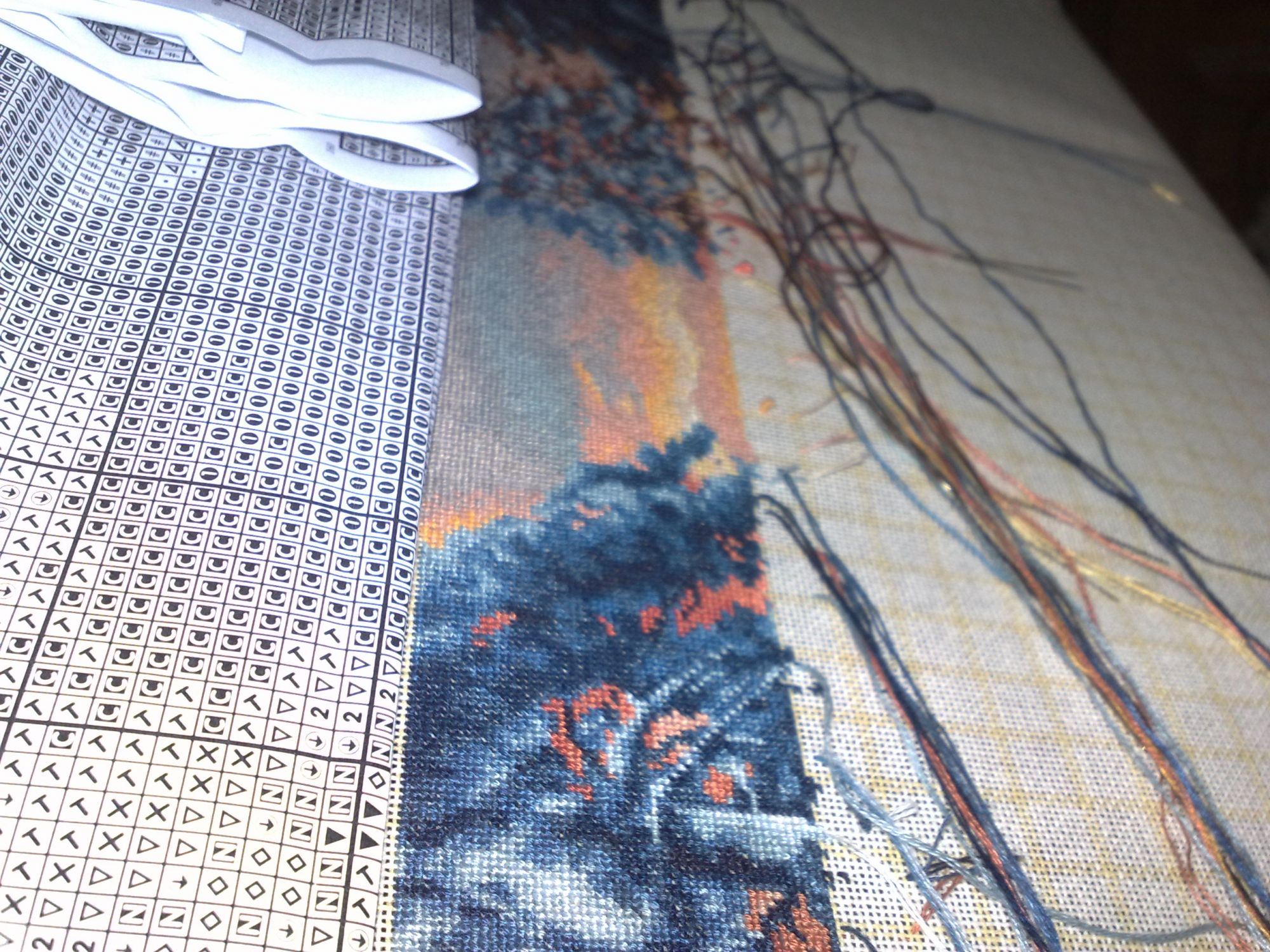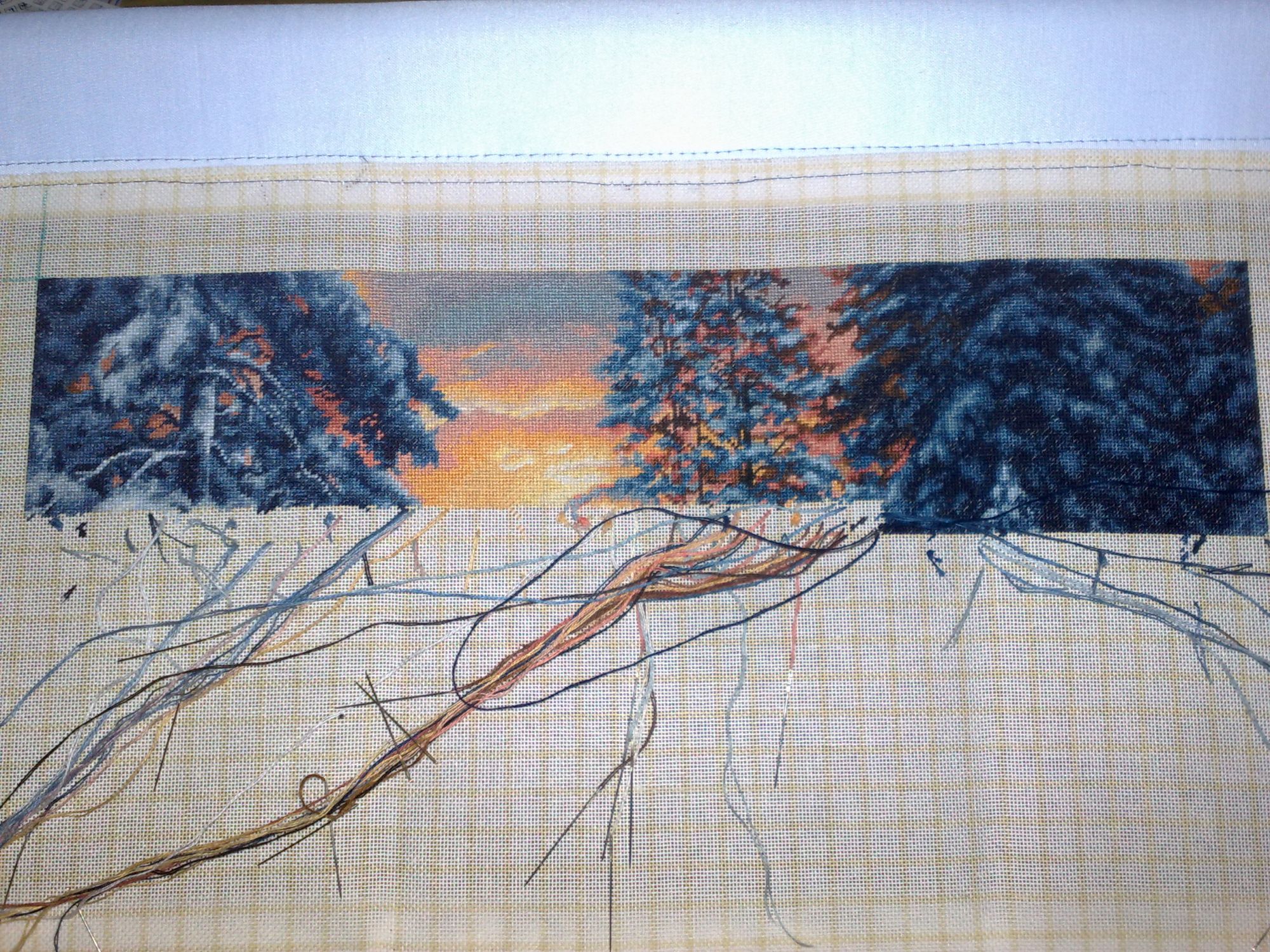 10 января 2016 пока показаться) вот такое у меня "телодвижение". Справа видно верхушку нижней елочки, еще чуть и дойду до домика (самое желанное в этой картине), Небо идет очень легко и красиво - желто-розовое приятное для глаз. Левые елочки тоже немного подросли. Приятно вышивать, но нелегко. Впрочем как и Роща в свое время, одинаковые оттенки конечно накладывают сложность. А вообще очень красиво. Мне нравится. Но после этого пейзажа - никаких синих оттенков)) СветланаЛФ, kreolka, Хозяйка смешных зверей и 13 других сказали спасибо Поделиться сообщением Ссылка на сообщение