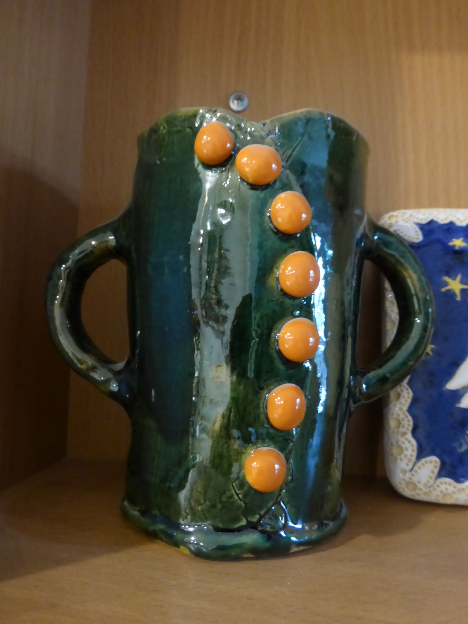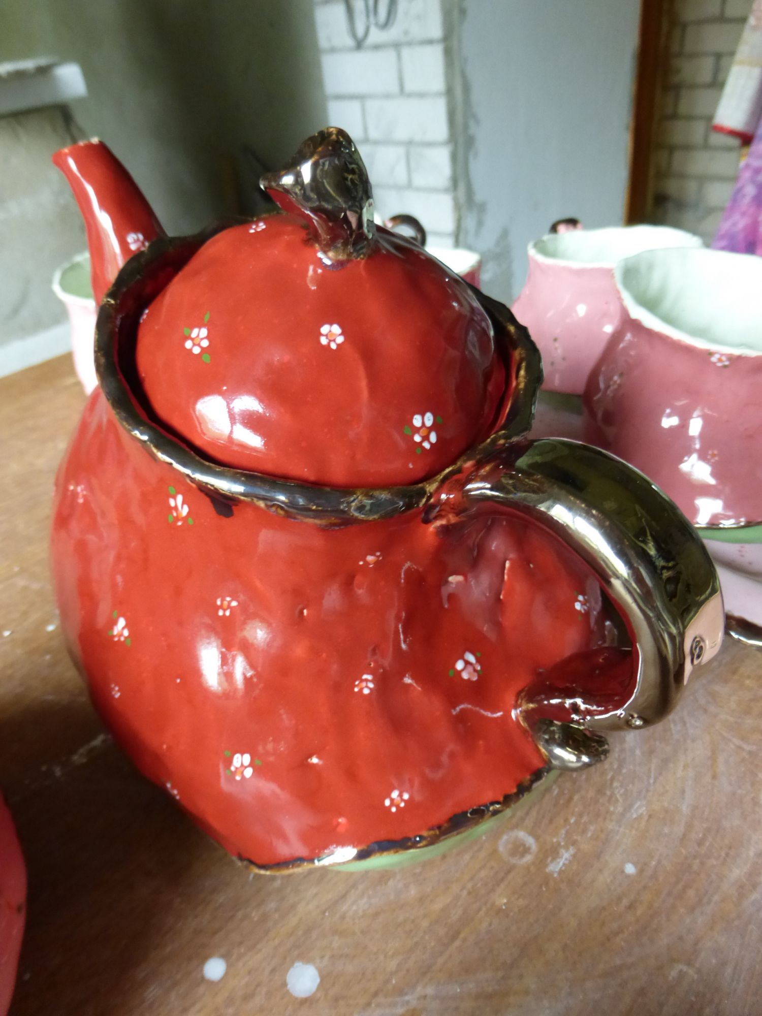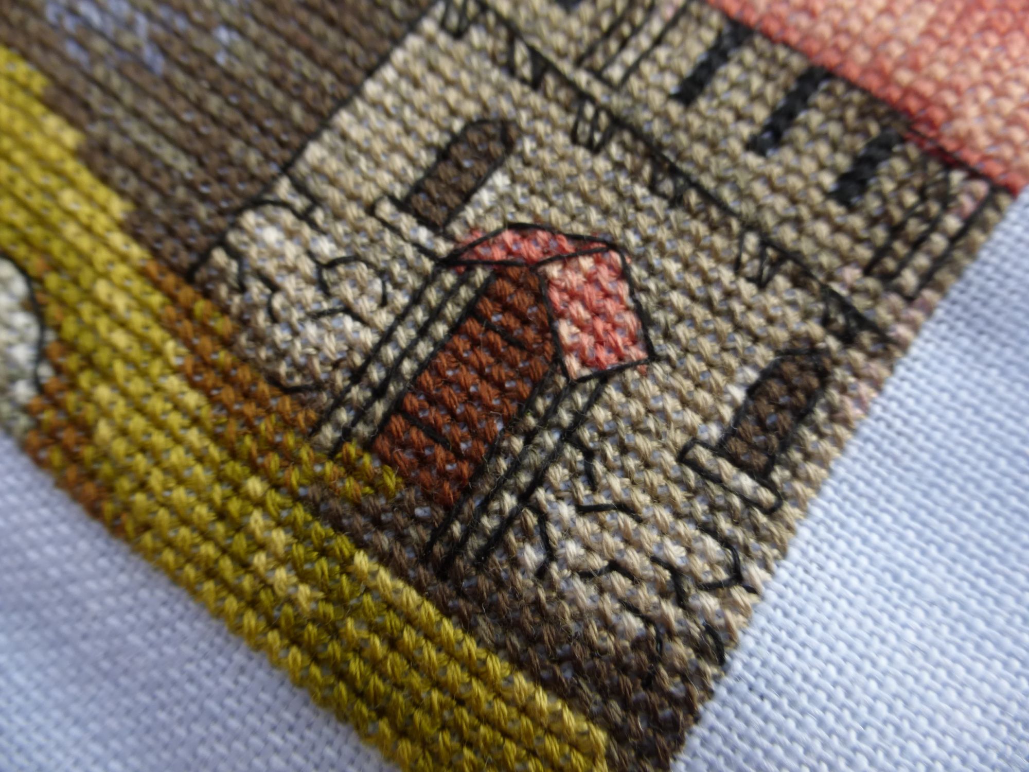 29 сентября 2016 Всем привет! Ждете замков? Будут чуть позже. А пока об интересном событии, произошедшем в моей жизни. Никогда не любила лепить, пластилин - мой страшный сон. И вот занесло меня на МК по лепке из глины в одно замечательное место. МК проходил в доме, где не только живут, но и работают настоящие мастера. Атмосфера их мастерской удивительная, в окружении прекрасных вещей и работать приятнее. Везде лежат, стоят глиняные изделия в разной степени готовности, все можно посмотреть буквально вплотную и подержать в руках. Интересная форма у печи, похожа на большую мультиварку. Их работы удивляют и ошеломляют, в голове вопрос: как? Как такое можно сделать руками. Есть довольно простые, но такое же еще и придумать надо, а есть просто филигранное исполнение. Мои любимцы: кружка-кафтан, заяц на табуретке и дремушки. Я от дремушек вообще в полном восторге, это колокольчики. Недолго думала над дизайном, так как была под впечатлением от лесных мухоморов. Я решила начать с несложного, решила сделать кружку-мухомор и гусеничку вместо ручки. Ага конечно, оказалось, что лепить кружку ни фига не легко. МК делился на три части: 1. Собственно сама лепка. Оказывается делается все не из цельного куска, а постоянно как бы надстраивая кусками все выше и выше. И это тебе не гончарный круг, где все ровненько, нет, все ручками и переделываешь, переделываешь, пока не получается приемлемый результат. А внутри кружки неожиданно появился маленький мухоморчик из трафарета, хотя изначально не задумывался. Незаметно пролетели 4 часа... Оставалось ждать результата обжига, кружка могла треснуть в печи или разлететься на куски, если что-то сделал не так. Волнительно. 2. Роспись после обжига. Виделись мне яркие глазури, красивые рисунки. Ага как же. Непонятного цвета что-то, что должно при повторном обжиге засиять. Мой мухомор стал блекло-розового цвета с непонятной гусеницей на нем. И опять же важно положить глазури именно столько сколько надо, иначе либо светит глина, если мало, либо рисунок идет пузырями, если переборщишь. А уж роспись маленького мухомора это отдельный треш. Кисточки тонюсенькие, а краски не желательно смешивать, так что приходилось выписывать, затаив дыхание. Ожидание еще более волнительно. 3. Итог. Он превзошел все ожидания. Действительно в печи глазурь заиграла всеми красками, мухомор стал красным, а гусеница зелененькой с оранжевыми кружочками, как и обещали. Внутренний грибок тоже не подкачал. Теперь у меня есть что-то неровное, кривенькое, но полностью оригинально и сделанное мной самой, нелюбительницей пластилина. Я влюблена в лепку из глины и результат. Пить чай из нее гораздо вкуснее. Ну а теперь к главному блюду и довольно очевидному: я их закончила Замки Даже немного жаль с ними расставаться, так как в отшиве они были чудесны. Из кучи блендов и немного количества чистого цвета выступали на канву каменные стены средневековых башен, остроконечные и не очень крыши, склоны, покрытые мшистыми камнями и яркой травой. Последний домик мне все время напоминал Реда из angry birds. Не знаю почему, но мне казалось, что он все время шевелил "клювом" и играл бровями ))) Ниток всех хватило по мотку и даже немного осталось, хотя иной раз были сомнения, а хватит ли самых часто используемых. Спасибо Ане еще раз, что швырнула в меня таким замечательным подарком, сама бы еще 