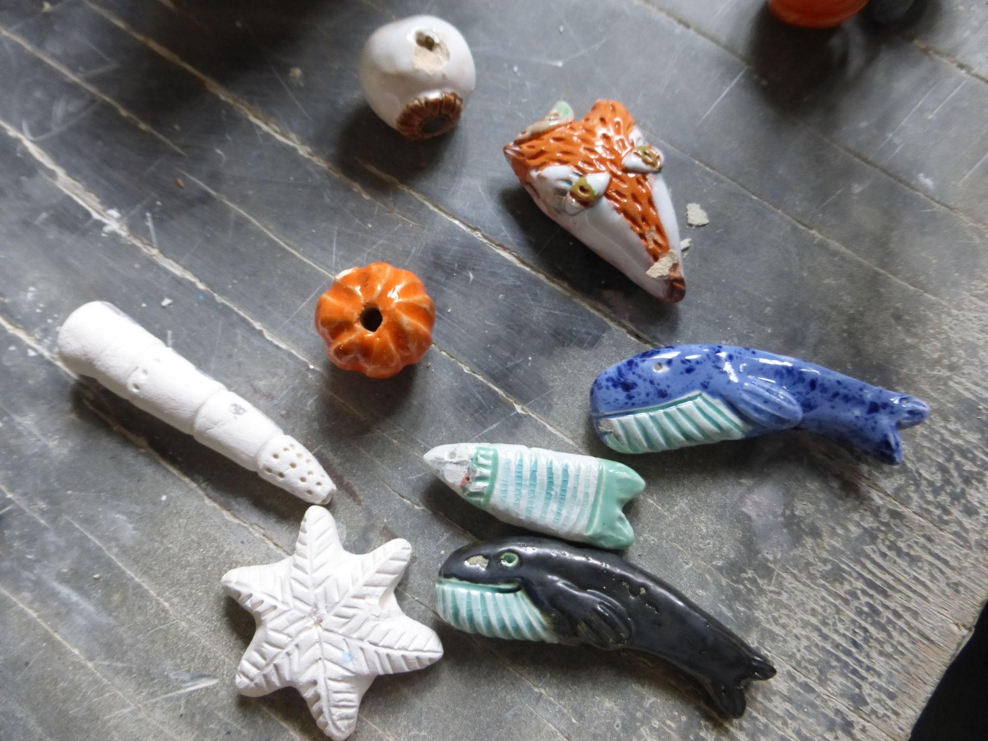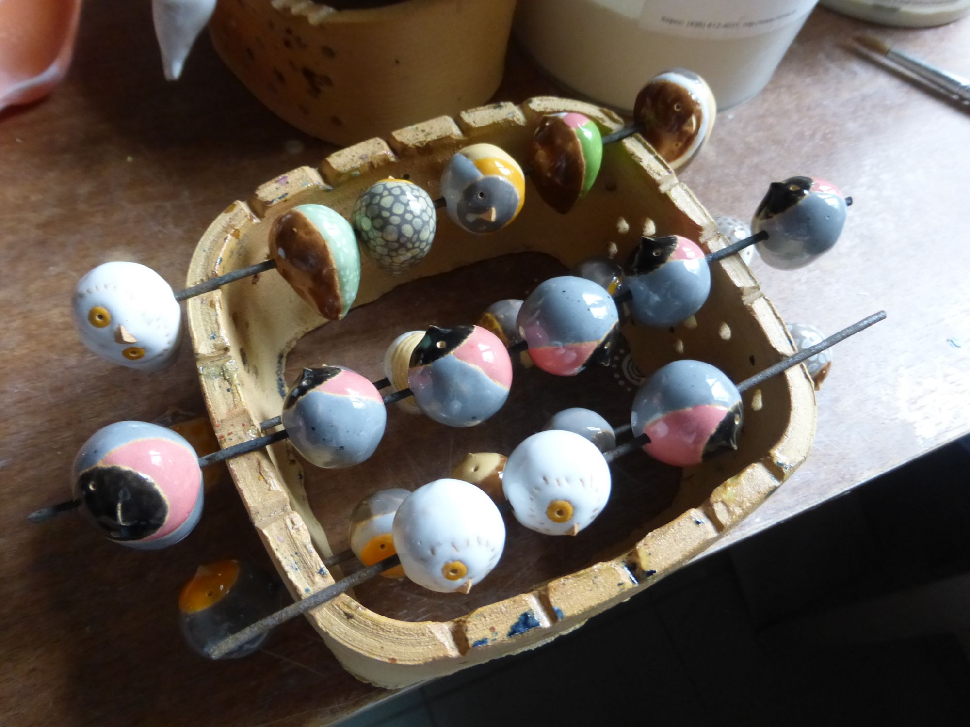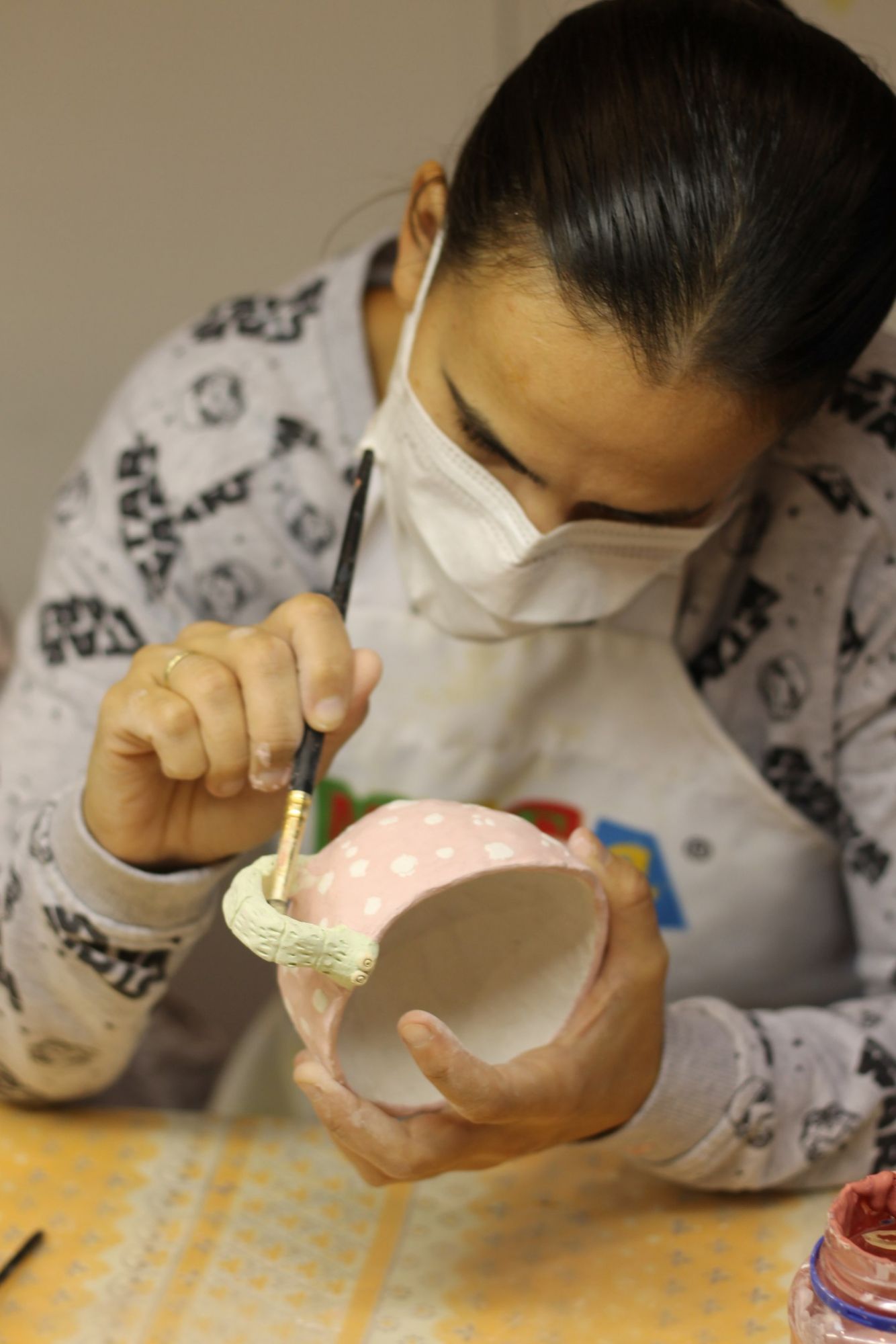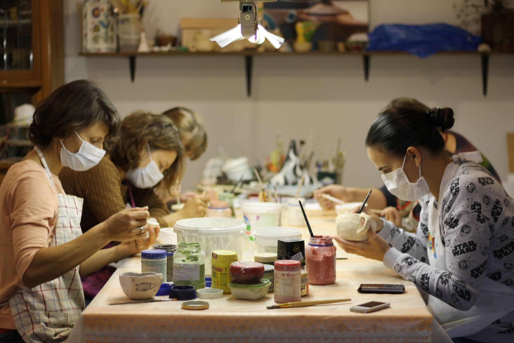 29 сентября 2016 Всем привет! Ждете замков? Будут чуть позже. А пока об интересном событии, произошедшем в моей жизни. Никогда не любила лепить, пластилин - мой страшный сон. И вот занесло меня на МК по лепке из глины в одно замечательное место. МК проходил в доме, где не только живут, но и работают настоящие мастера. Атмосфера их мастерской удивительная, в окружении прекрасных вещей и работать приятнее. Везде лежат, стоят глиняные изделия в разной степени готовности, все можно посмотреть буквально вплотную и подержать в руках. Интересная форма у печи, похожа на большую мультиварку. Их работы удивляют и ошеломляют, в голове вопрос: как? Как такое можно сделать руками. Есть довольно простые, но такое же еще и придумать надо, а есть просто филигранное исполнение. Мои любимцы: кружка-кафтан, заяц на табуретке и дремушки. Я от дремушек вообще в полном восторге, это колокольчики. Недолго думала над дизайном, так как была под впечатлением от лесных мухоморов. Я решила начать с несложного, решила сделать кружку-мухомор и гусеничку вместо ручки. Ага конечно, оказалось, что лепить кружку ни фига не легко. МК делился на три части: 1. Собственно сама лепка. Оказывается делается все не из цельного куска, а постоянно как бы надстраивая кусками все выше и выше. И это тебе не гончарный круг, где все ровненько, нет, все ручками и переделываешь, переделываешь, пока не получается приемлемый результат. А внутри кружки неожиданно появился маленький мухоморчик из трафарета, хотя изначально не задумывался. Незаметно пролетели 4 часа... Оставалось ждать результата обжига, кружка могла треснуть в печи или разлететься на куски, если что-то сделал не так. Волнительно. 2. Роспись после обжига. Виделись мне яркие глазури, красивые рисунки. Ага как же. Непонятного цвета что-то, что должно при повторном обжиге засиять. Мой мухомор стал блекло-розового цвета с непонятной гусеницей на нем. И опять же важно положить глазури именно столько сколько надо, иначе либо светит глина, если мало, либо рисунок идет пузырями, если переборщишь. А уж роспись маленького мухомора это отдельный треш. Кисточки тонюсенькие, а краски не желательно смешивать, так что приходилось выписывать, затаив дыхание. Ожидание еще более волнительно. 3. Итог. Он превзошел все ожидания. Действительно в печи глазурь заиграла всеми красками, мухомор стал красным, а гусеница зелененькой с оранжевыми кружочками, как и обещали. Внутренний грибок тоже не подкачал. Теперь у меня есть что-то неровное, кривенькое, но полностью оригинально и сделанное мной самой, нелюбительницей пластилина. Я влюблена в лепку из глины и результат. Пить чай из нее гораздо вкуснее. Ну а теперь к главному блюду и довольно очевидному: я их закончила Замки Даже немного жаль с ними расставаться, так как в отшиве они были чудесны. Из кучи блендов и немного количества чистого цвета выступали на канву каменные стены средневековых башен, остроконечные и не очень крыши, склоны, покрытые мшистыми камнями и яркой травой. Последний домик мне все время напоминал Реда из angry birds. Не знаю почему, но мне казалось, что он все время шевелил "клювом" и играл бровями ))) Ниток всех хватило по мотку и даже немного осталось, хотя иной раз были сомнения, а хватит ли самых часто используемых. Спасибо Ане еще раз, что швырнула в меня таким замечательным подарком, сама бы еще 