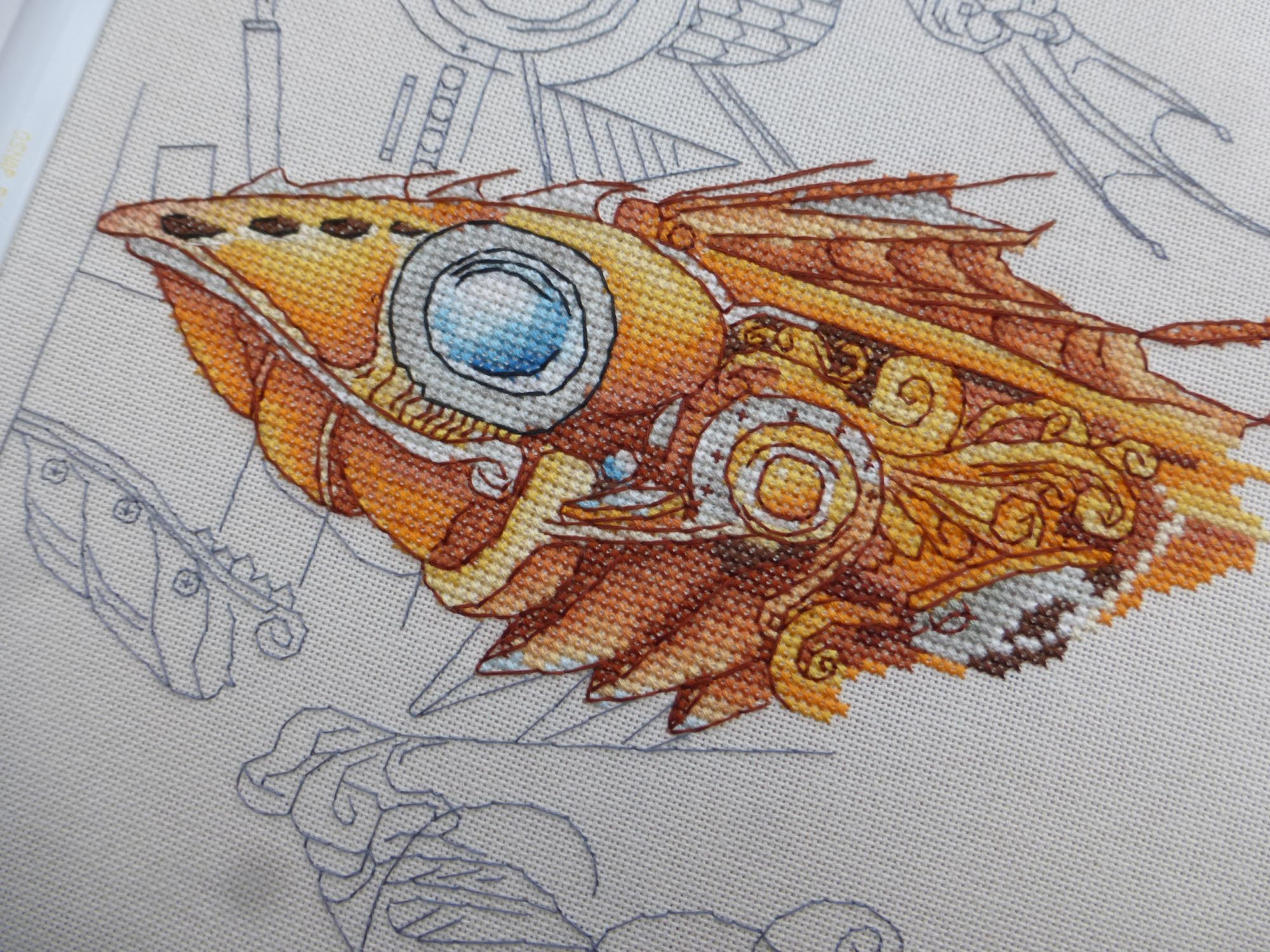 4 марта 2020 Всем привет! Сегодня немного фальшстарт, но лучше так, чем никак, верно? Океанариум финиш! Крестики были весьма простыми, бэк более трудоемкий за счет количества. Есть немного несчетного, но не подавляющее большинство. Первый слой бэка выполняется швейными нитками Мадейра 3799 цвета. Я когда вышивала его, то мне казалось, что это вообще полная ерунда получается. Было ощущение, что фигня какая-то. Но я забыла, что здесь еще будет 2 цвета. В общем, все встало на свои места, когда добавился еще один серый и голубой уже обычными нитками мулине, здесь Роял. Мне очень нравится результат. Океанариум получился даже лучше Кижей, на мой взгляд. У меня есть мысль и я ее думаю: о месяце стартов и в этом апреле. Но также я себя убедила в том, что если я хочу так сделать, то надо максимально закончить старты того апреля. Тем более их осталось незавершенными всего-то 5 штучек, из которых 3 довольно легко закончить или продвинуть намного ближе к финишу. Поэтому достала следующий процесс. Царевна-лягушка И надо сказать, что он идет очень бодро. Я в этот раз довольно быстро переключилась на закрывание каждого крестика. Заметила интересную вещь. Я беру 2 ниточки, чтобы краска ниток была расположена параллельно, но через какое-то время они все равно смещаются и в некоторых местах листьев кажется, что вышито блендом. Это в основном характерно для мест, где темный резко переходит в светлый. Сюжет мне не разонравился до сих пор, кайфовый он. Осталось решить, хочу ли я лицо и руки вышивать петитом, но до этого времени у меня впереди еще один блок орнамента, а значит есть время подумать. Рыба Моя великолепная детка. Столько удовольствия приносит, не передать словами. Она великолепна и крута. Причем настолько прут всякие эмоции, что хочется ей делиться и делиться. Я Олю Путешественницу достала наверное восторгами, хотя она каждый раз со мной соглашается, что да хороша. Потому что не надо сумасшедших шьюх расстраивать. А бэк какой чудесный. Серый чертежный непростой в плане внимательности, чуток отвлекся и распускать. Сама рыбина вся в 2 нити коричневым - настолько легко идет, как по маслу. И она оживает, чувствую себя создателем-механиком из стимпанк романов. Ее оценил Степка особенно, сказал, что я вышиваю ее ему. Мне кажется, что такое происходит впервые, что он так проникается дизайном. На этом все, прощаюсь на неделю. Очень хочется в это верить ))) kolpluna, Маса, Millanka и 67 других сказали спасибо Поделиться сообщением Ссылка на сообщение