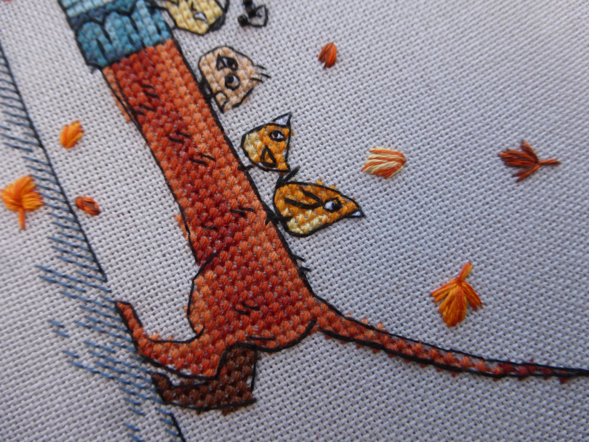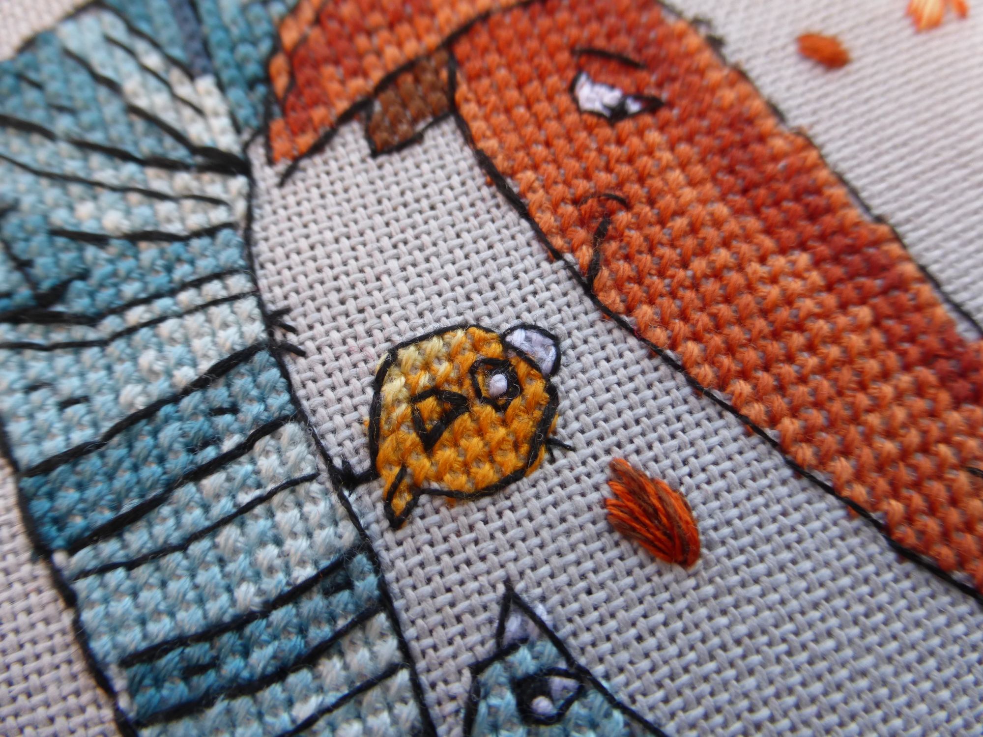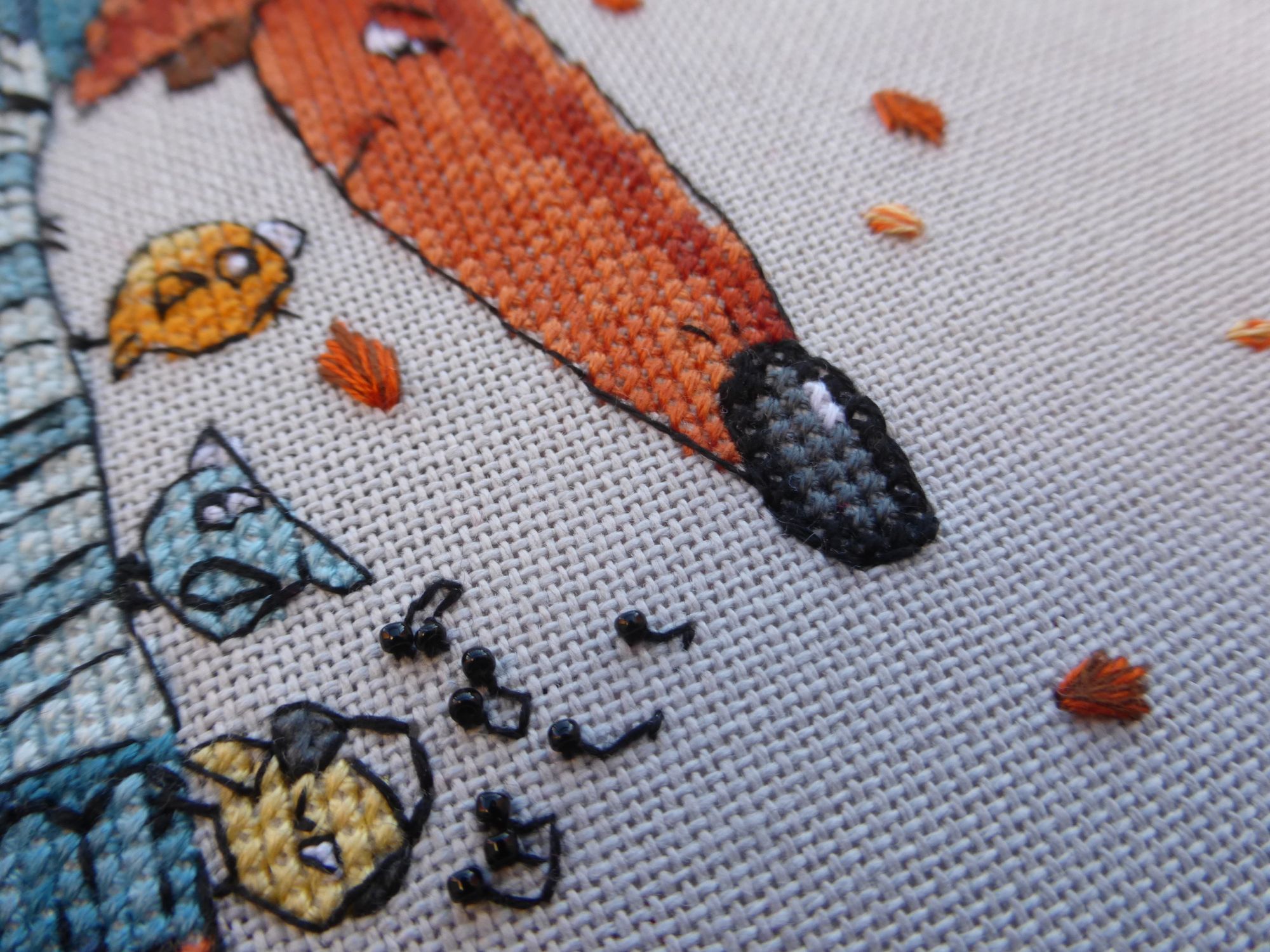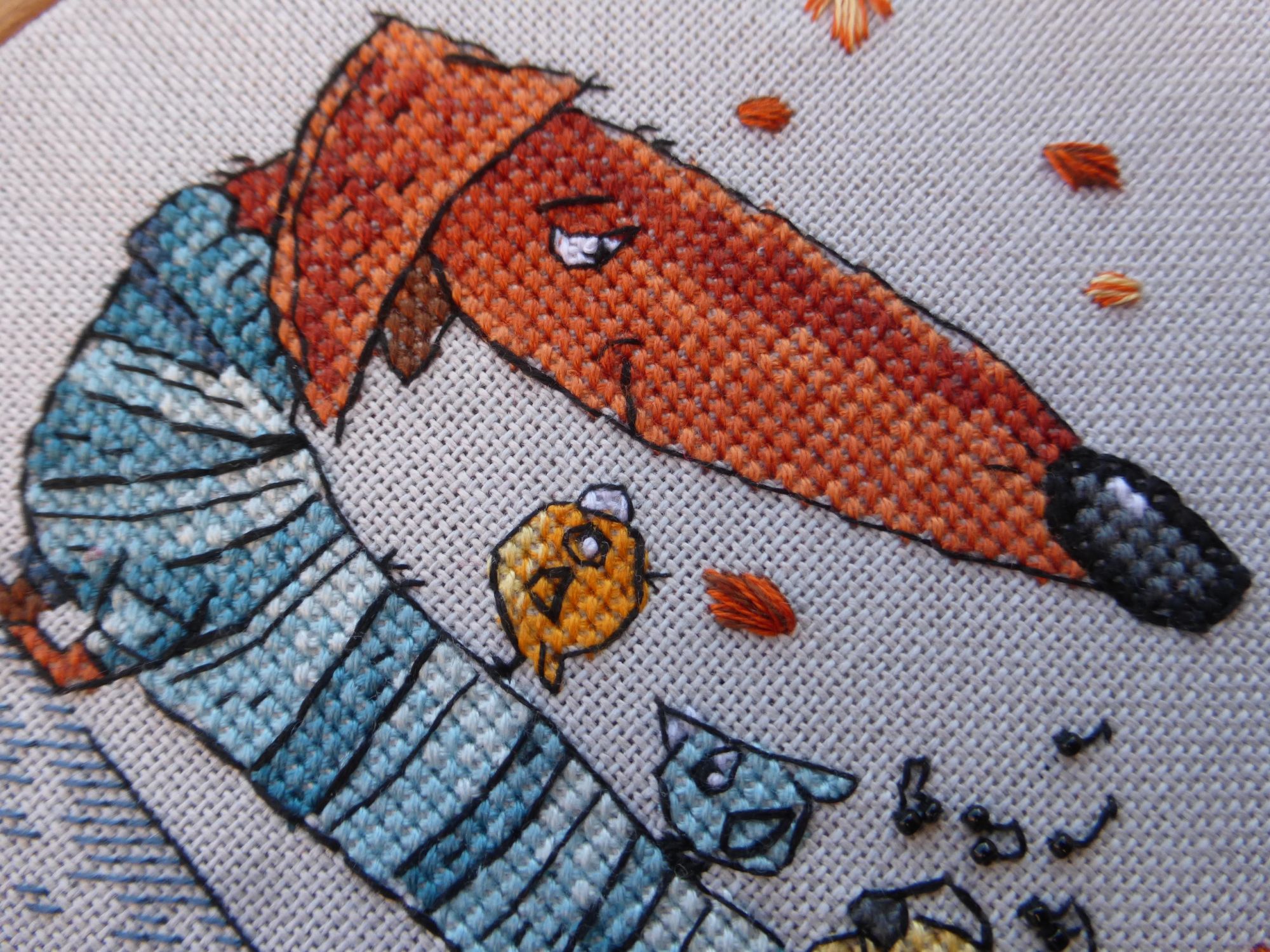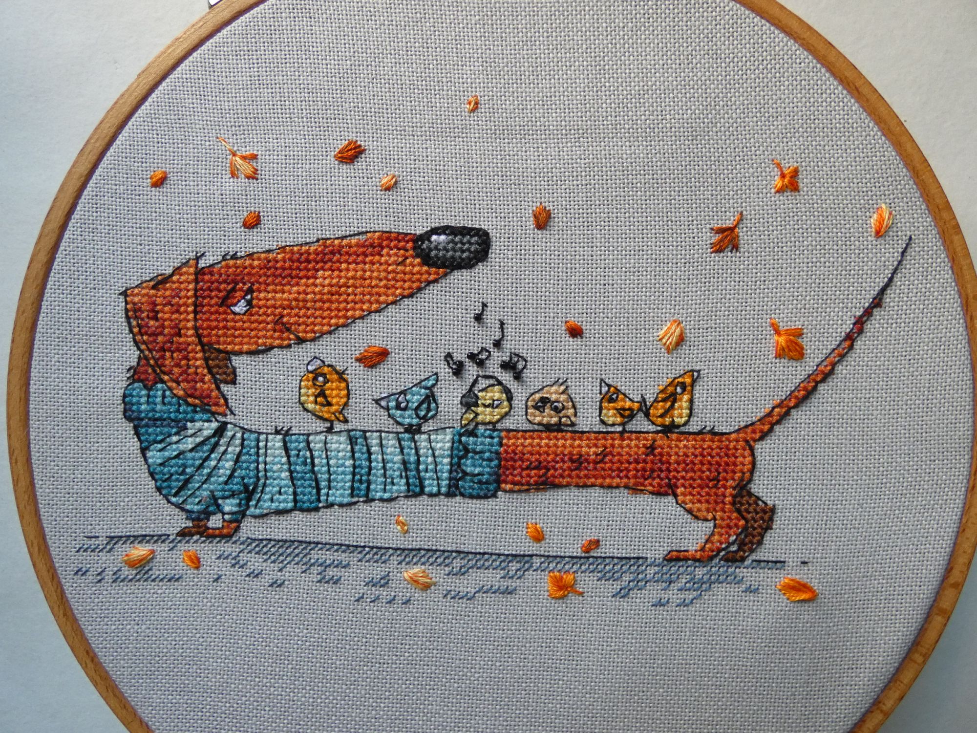 22 октября 2020 Всем привет! Пора домой финиш! Закончился мой уютный процесс. И осень золотая закончилась. Стала холодной, дождливой и ветреной. Самое время укрыться пледом, а тут их полно на любой вкус. Процесс был несложным совсем, особенно в крестиках. Никаких тебе одиночек, никаких мелких группок. Нитка длится и длится. Сам он небольшой, так что смена цветов происходила вовремя. Не успевал надоесть красный, вот тебе синий. Бэк чуть посложнее. Легче шить постоянную линию, чем всякие закорючки разрозненные. Но в целом тоже без особых проблем вышился. Не могу сказать, что схемы Гафенко прям любовь-любовь, но и дальше буду для себя их рассматривать, как возможные. Кстати, чемодан похож на чемодан пилотов, которых мы с Олькой шили раньше. Листопад старт и финиш! по схеме Екатерины Тарасовой, размер 101х64 крестика, 18 цветов А потом я поняла, что соскучилась по своим дурашкам, и мне срочно нужен кто-то новый в процесс. Так вот появился таксик. И так получилось, что процесс сразу стал финишем. Катя - тот же дизайнер, что нарисовала моего мишку-авиатора. Это я к чему, а к тому, что шилась она у меня быстро и с большим удовольствием. Я сначала подумала, что просто вышью пса и птах, а листья - ну зачем они здесь. Вышила, посмотрела, пустовато. Дай, думаю, попробую. Если что, распустить недолго. И не смогла оторваться. Листья здесь чуть ли не главная изюминка, один из основных компонентов гармоничности картинки. Они делаются блендом в три нити, я кое-где сделала в две. Сложно крепятся из-за этого, но результат стоит того, хоть и не сильно передается на фотках. Нотки тоже не стала делать фрузелками, добавила объема за счет мелкого бисера. Довольна страшно. А у Кати еще полно всяких забавных схем. На этом прощаюсь до следующей недели. Всем удачи и настроения творить )) IrnKA, Кисуля, vasilisa-1977 и 62 других сказали спасибо Поделиться сообщением Ссылка на сообщение