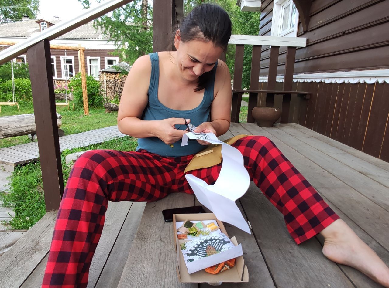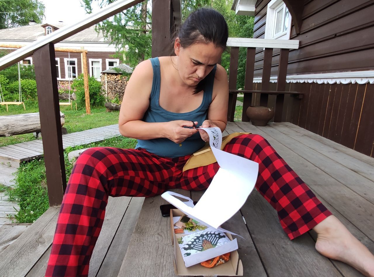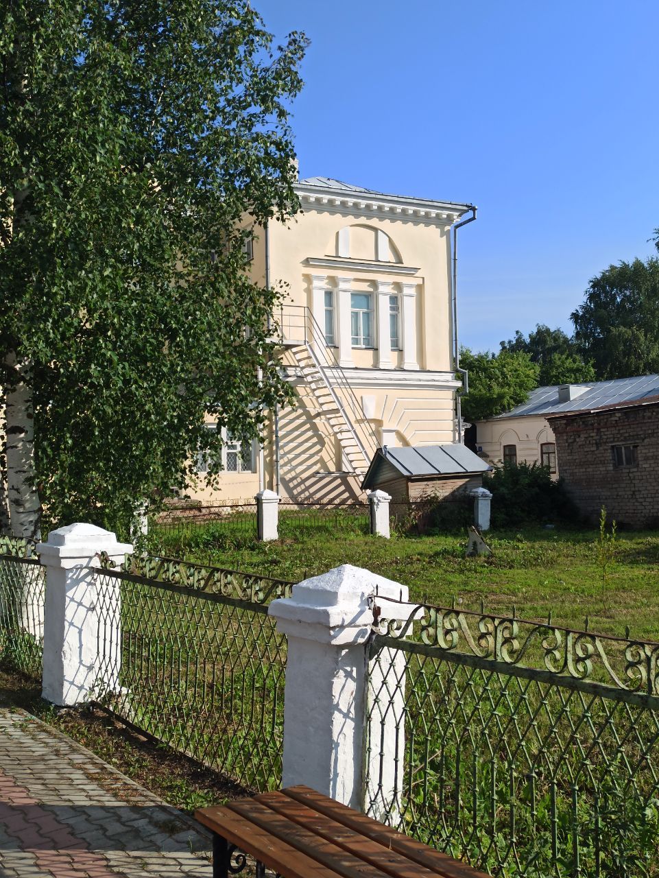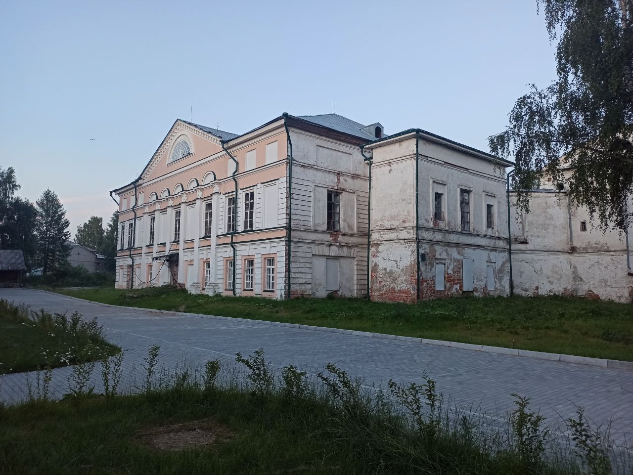 8 августа 2022 Сольвычегодск Паромная переправа до Сольвычегодска живо мне напомнила нашу отмель у Шуховской башни на Оке, даже железка какая-то из деревьев торчала. У меня вообще на протяжении путешествия были различной тяжести флэшбэки из прошлого. )))) Вообще здесь так интересно устроены переправы, что те разы, когда мы переправлялись через реки, все машины магическим образом утрамбовывались на паром. Ну кроме той, кто вдруг решила переправится в самый последний момент. Плывешь, а навстречу тебе идеальная картина дорожного тупика и прекрасной жизни. Тепло, закатное солнце освещает пристань, и дети прыгают в Вычегду с конструкций для весенней высокой переправы. Остановились мы в Сольвычегодске на 2 дня. Нужна была дневка, чтобы чуток перевести дух и настроиться на следующие забеги. Местом дислокации был выбран во всех смыслах чудесный гостевой дом. Как-то несколько лет назад замечательная девушка Екатерина решила в городке своего детства развивать туризм. И ей это на 100% удалось. За основу взяты здание старой земской больницы, гостевой дом и бараки. И это классное сочетание старины и новодела. Она в содружестве с деревянных дел мастером создала здесь шикарную и гостеприимную атмосферу. Просто посмотрите на эти интерьеры и детали, благодаря которым и возникает то самое впечатление старинного уюта. Все подобрано просто идеально. Столовая находится в бывшем операционном кабине. Большое количество кафеля наводило на мысли, что это не зря, а чтобы легко было что-то отмывать. Собственно предположение подтвердилось. Очень понравилось с какой любовью в углах сделана плитка, повторяя закругленные стены. Они таким образом сделаны для тепла, так как угол закругленный хуже промерзает. Ели непривычную для меня еду. Ребята вечно потешаются надо мной, когда я пробую что-то новое для себя и просто ем в незнакомом месте. С большой осторожностью. И да, мне не стыдно, что щавелевый суп или фарш в листах крапивы я впервые попробовала вот только что. Не очень впечатлило. Еда как еда. И еще варенье из ревеня. Оно было потрясающим. И еще немножечко о лицах. Когда едешь куда-то с подружкой, которая любить фотографировать, то бэкстейджа практически невозможно избежать. Эти фотки называются "с каким лицом я готовлюсь вышивать новый процесс / как мне кажется, с каким лицом я это делаю". Когда мы собирались ехать в Архангельскую область, то прогноз погоды обещал нам разумные для жизни 20-22 градуса. Но безбожно врал. ))) В Сольвычегодске было 28 градусов. Жара удушала. Гуляли в основном после ее закрытия по вечерам, любуясь окрестностями. Вот стоят деревенские домики, а за поворотом Введенский монастырь в стиле "строгановского барокко", а следом купеческие каменные домики. На улицах народу совсем немного. В основном отдыхающие в санатории и вездесущая молодежь, обрывки разговоров которой поднимали настроение. Работник местного магазина, бравый кассир значительного размера, который берет деньги за фотографии с ним. По крайней мере так написано на его коробке. И дом, который особенно меня впечатлил. Вот совсем такое не ожидаешь увидеть. Практически дворец в стиле классицизма с историей. Итак, дом купцов Пьянковых. Построен в начале 19 века, в 1810 году купчихой Агриппиной Сергеевной для своих старших сыновей. Получается огромная по меркам города усадьба с портиком с 6 к
