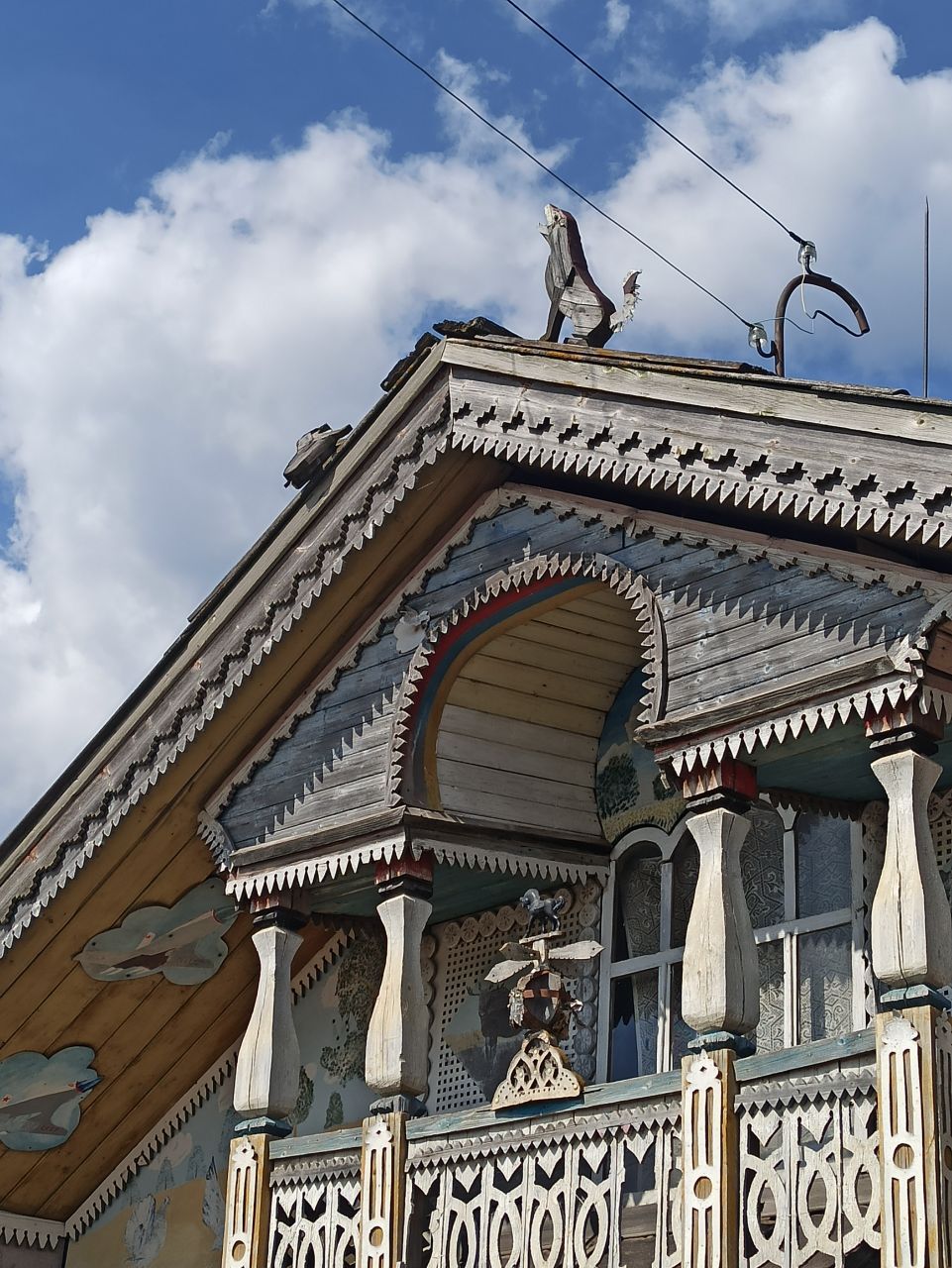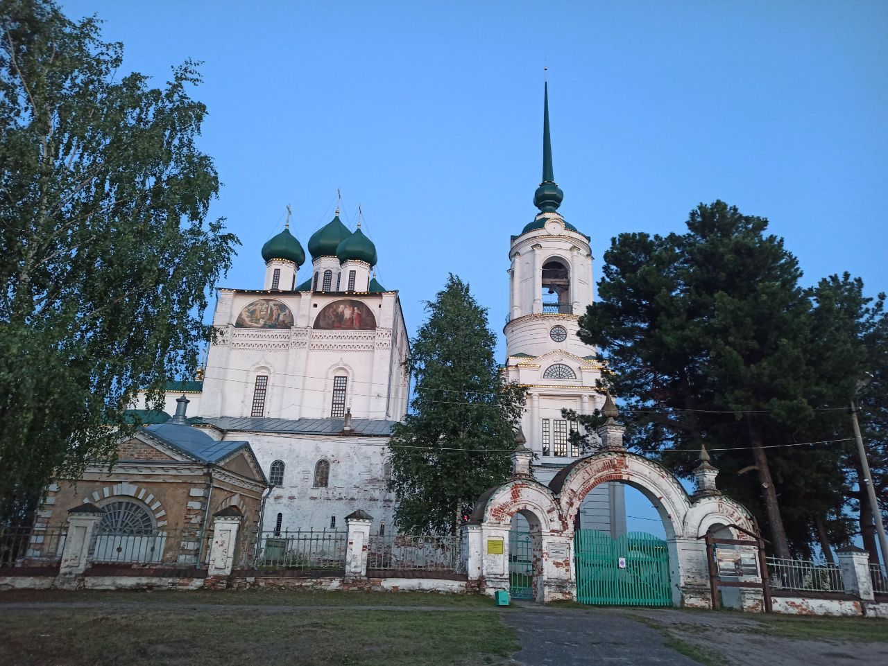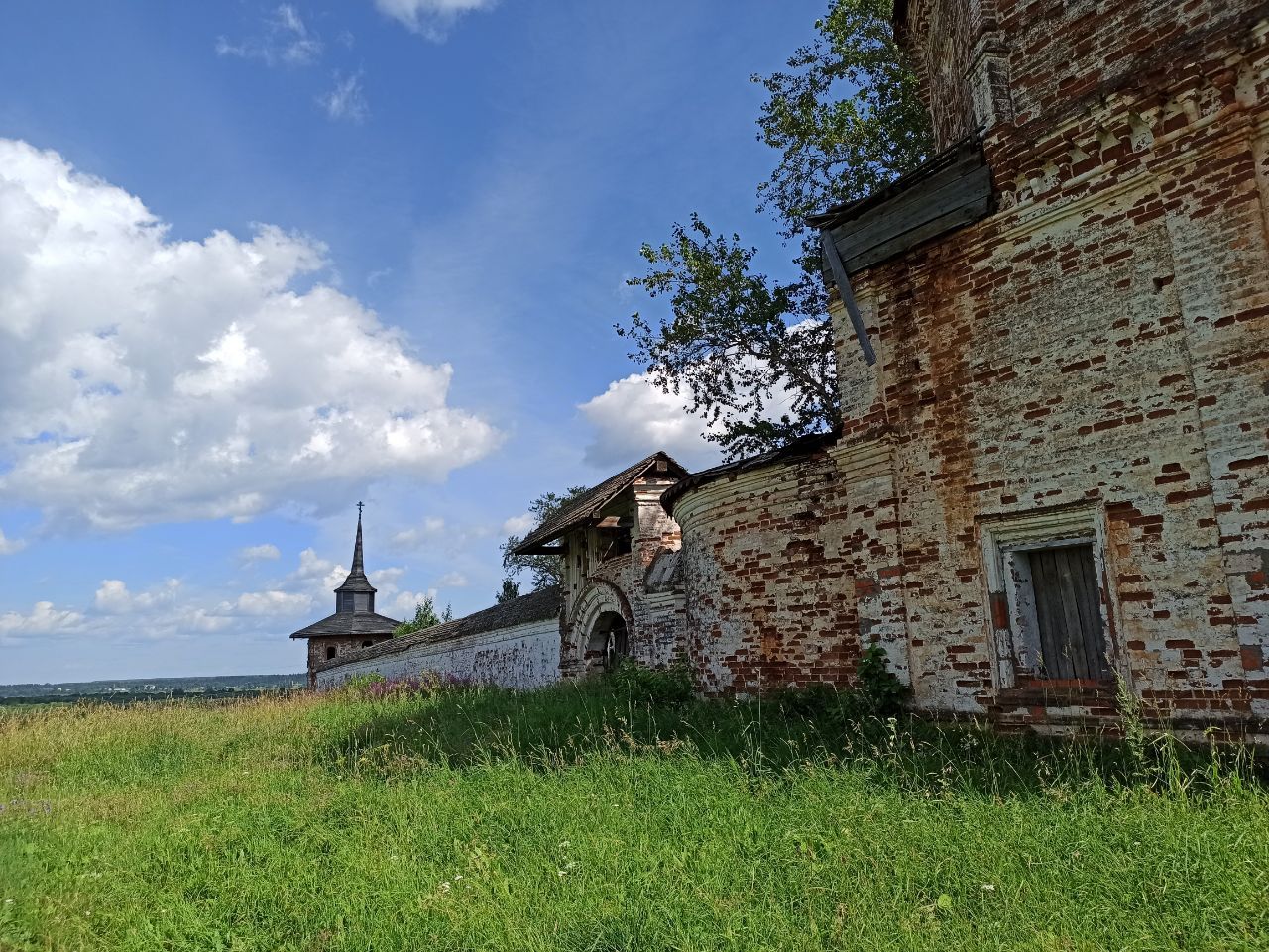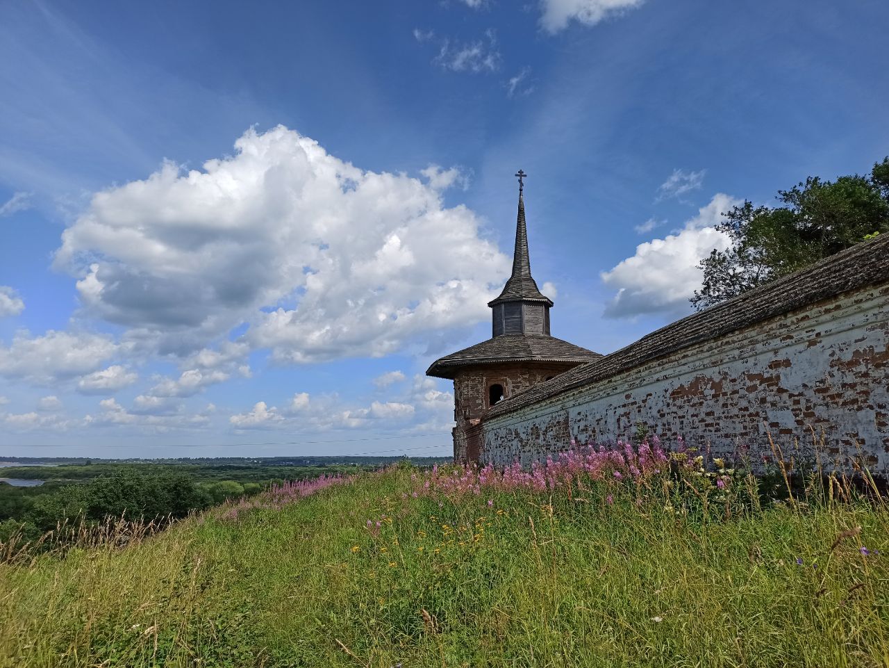 8 августа 2022 Продолжаем разговор )) Не сказать, что у нас в области, особенно на даче, ощущается нехватка иван-чая, как класса, но чем дальше на север, тем его больше. В разы больше. Он буквально заполоняет пространство вдоль дороги, делая ее обочину девчачьей - розовенькой. И это незабываемое впечатление. Окружающее реально начинается запечатляться именно через призму иван-чая. И это прекрасно! Еще мох и лишайники. Как тут не влюбиться?! Едем мы в Устюг, глазеем по сторонам, и внезапно Оля спрашивает: "Как у нас со временем? Тут точка стоит на карте - церковь, которую мы из Устюга видим все время, да и еще я хотела бы на исток Северной Двины глянуть." Просто у нас впереди паром до Сольвычегодска, который был точкой ночевки, а мы, девочки, не очень посмотрели, что там и сколько там до него. Такое всегда немного подбешивает Женю. После быстрого обмена мнениями о недостатках друг друга )))), сворачиваем с маршрута и едем смотреть Троице-Гледенский монастырь. А посмотреть есть на что. Основан он очень давно в 12 веке и назван в честь города Гледена, предшественника Великого Устюга, который исчез с лица земли еще в 15 столетии. Город, не монастырь. Как и все церковные общины того времени, он долгое время имел большое хозяйство, занимался торговлей и был довольно богат. Но нет ничего постоянного - грянула церковная реформа Петра, и жизнь монастыря пошла под уклон. Забавный факт из истории: за время своего существования он был сначала мужским, а потом женским. Позже в нем были и больничные дела, и даже держали заключенных пересыльных. Сейчас здесь музей, а значит можно зайти внутрь и за скромную плату посмотреть своими глазами на уникальный барочный иконостас, который ожидаешь увидеть скорее где-то в католической Европе. И там действительно есть на что подивиться. Деревянный, резной, позолоченный, да еще и с зеркалами. Удивительной красоты резьба, выполненная мастерами из Тотьмы, Вологды и Устюга на народные пожертвования. Долгое время комплекс был закрыт, окна выбиты, крыша прохудилась. Внутри обосновалась колония голубей со всеми вытекающими последствиями. Но потом было решено привести его в порядок. Так вот по словам бабулечки, которая продавала билеты на вход, как отмыли иконостас от помета, так и ахнули: повреждения были минимальными. И это ли не чудо, как тогда умели строить. Надо сказать, что стоит он в прекрасном месте. Церковные постройки в принципе всегда "забивали" себе зачетные локации, за редчайшим исключением. И тут высокий пригорок - вокруг просторы, и вниз убегают деревья с иван-чаем наперегонки. Плюс погода была абсолютно открыточная с облачками, которые как специально вставали в кадр выгодным ракурсом. Мы eще на пути до монастыря приметили интересную резьбу на домах деревни под боком. Обратно поехали немного другой дорогой по ней и не прогадали. Вдруг вырос перед глазами вот такой дом. Я подобное видела у нас в Пурехе, показывала здесь в том году. И не сразу замечаешь все детальки. А кое-что вообще только Женя увидел - как первый этаж прячется внутри резной фальшстены. Очень симпатичный домик. Впрочем, как и пурехские, лично для меня такое to much, перегружено сильно. Дальше было слияние рек Юг и Сухона, а также начало прекрасной Северной Двины. Я вообще очень нежно отношусь к речным слияниям. Они у меня в крови по территориальной принадлежности, ра