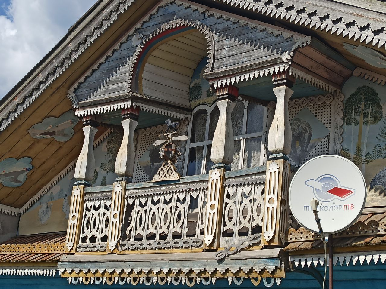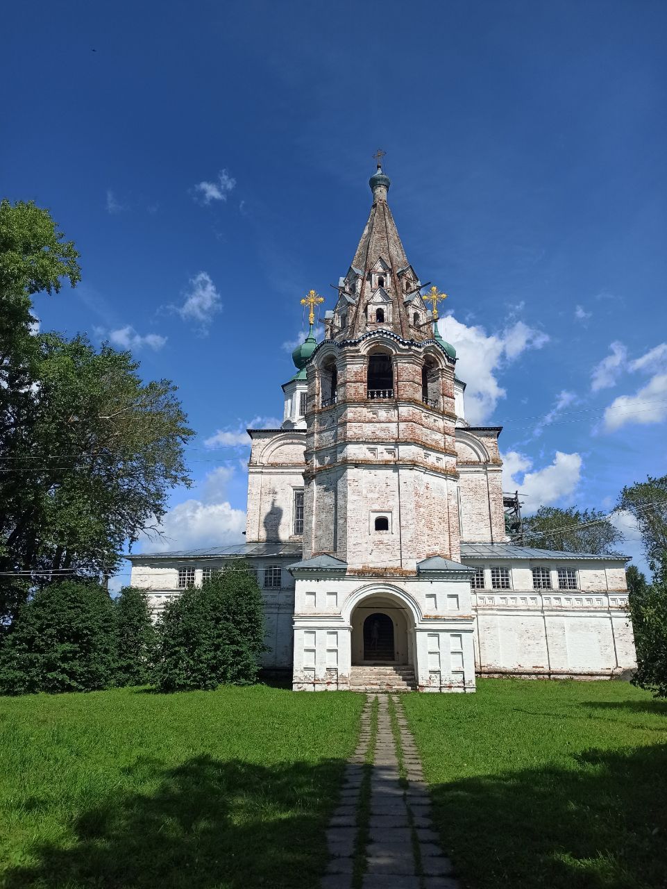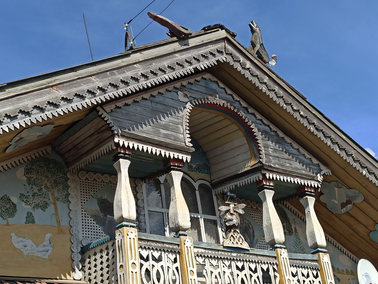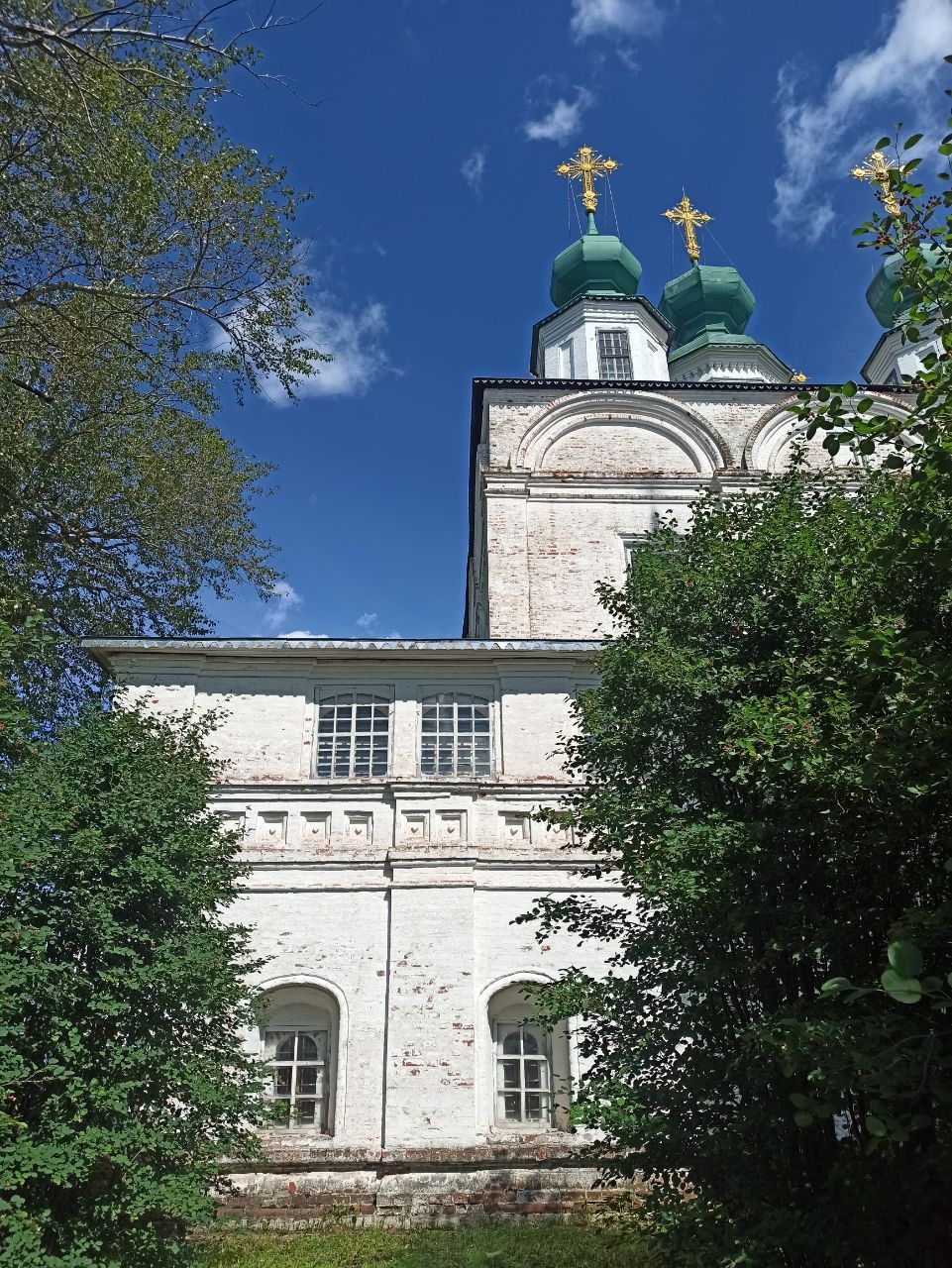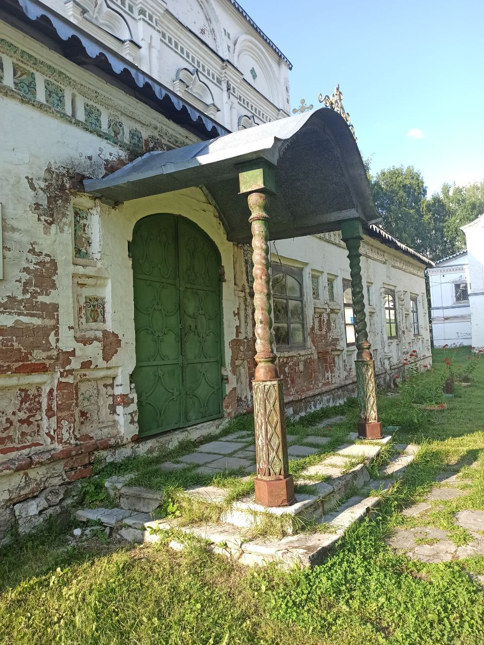 8 августа 2022 Продолжаем разговор )) Не сказать, что у нас в области, особенно на даче, ощущается нехватка иван-чая, как класса, но чем дальше на север, тем его больше. В разы больше. Он буквально заполоняет пространство вдоль дороги, делая ее обочину девчачьей - розовенькой. И это незабываемое впечатление. Окружающее реально начинается запечатляться именно через призму иван-чая. И это прекрасно! Еще мох и лишайники. Как тут не влюбиться?! Едем мы в Устюг, глазеем по сторонам, и внезапно Оля спрашивает: "Как у нас со временем? Тут точка стоит на карте - церковь, которую мы из Устюга видим все время, да и еще я хотела бы на исток Северной Двины глянуть." Просто у нас впереди паром до Сольвычегодска, который был точкой ночевки, а мы, девочки, не очень посмотрели, что там и сколько там до него. Такое всегда немного подбешивает Женю. После быстрого обмена мнениями о недостатках друг друга )))), сворачиваем с маршрута и едем смотреть Троице-Гледенский монастырь. А посмотреть есть на что. Основан он очень давно в 12 веке и назван в честь города Гледена, предшественника Великого Устюга, который исчез с лица земли еще в 15 столетии. Город, не монастырь. Как и все церковные общины того времени, он долгое время имел большое хозяйство, занимался торговлей и был довольно богат. Но нет ничего постоянного - грянула церковная реформа Петра, и жизнь монастыря пошла под уклон. Забавный факт из истории: за время своего существования он был сначала мужским, а потом женским. Позже в нем были и больничные дела, и даже держали заключенных пересыльных. Сейчас здесь музей, а значит можно зайти внутрь и за скромную плату посмотреть своими глазами на уникальный барочный иконостас, который ожидаешь увидеть скорее где-то в католической Европе. И там действительно есть на что подивиться. Деревянный, резной, позолоченный, да еще и с зеркалами. Удивительной красоты резьба, выполненная мастерами из Тотьмы, Вологды и Устюга на народные пожертвования. Долгое время комплекс был закрыт, окна выбиты, крыша прохудилась. Внутри обосновалась колония голубей со всеми вытекающими последствиями. Но потом было решено привести его в порядок. Так вот по словам бабулечки, которая продавала билеты на вход, как отмыли иконостас от помета, так и ахнули: повреждения были минимальными. И это ли не чудо, как тогда умели строить. Надо сказать, что стоит он в прекрасном месте. Церковные постройки в принципе всегда "забивали" себе зачетные локации, за редчайшим исключением. И тут высокий пригорок - вокруг просторы, и вниз убегают деревья с иван-чаем наперегонки. Плюс погода была абсолютно открыточная с облачками, которые как специально вставали в кадр выгодным ракурсом. Мы eще на пути до монастыря приметили интересную резьбу на домах деревни под боком. Обратно поехали немного другой дорогой по ней и не прогадали. Вдруг вырос перед глазами вот такой дом. Я подобное видела у нас в Пурехе, показывала здесь в том году. И не сразу замечаешь все детальки. А кое-что вообще только Женя увидел - как первый этаж прячется внутри резной фальшстены. Очень симпатичный домик. Впрочем, как и пурехские, лично для меня такое to much, перегружено сильно. Дальше было слияние рек Юг и Сухона, а также начало прекрасной Северной Двины. Я вообще очень нежно отношусь к речным слияниям. Они у меня в крови по территориальной принадлежности, ра