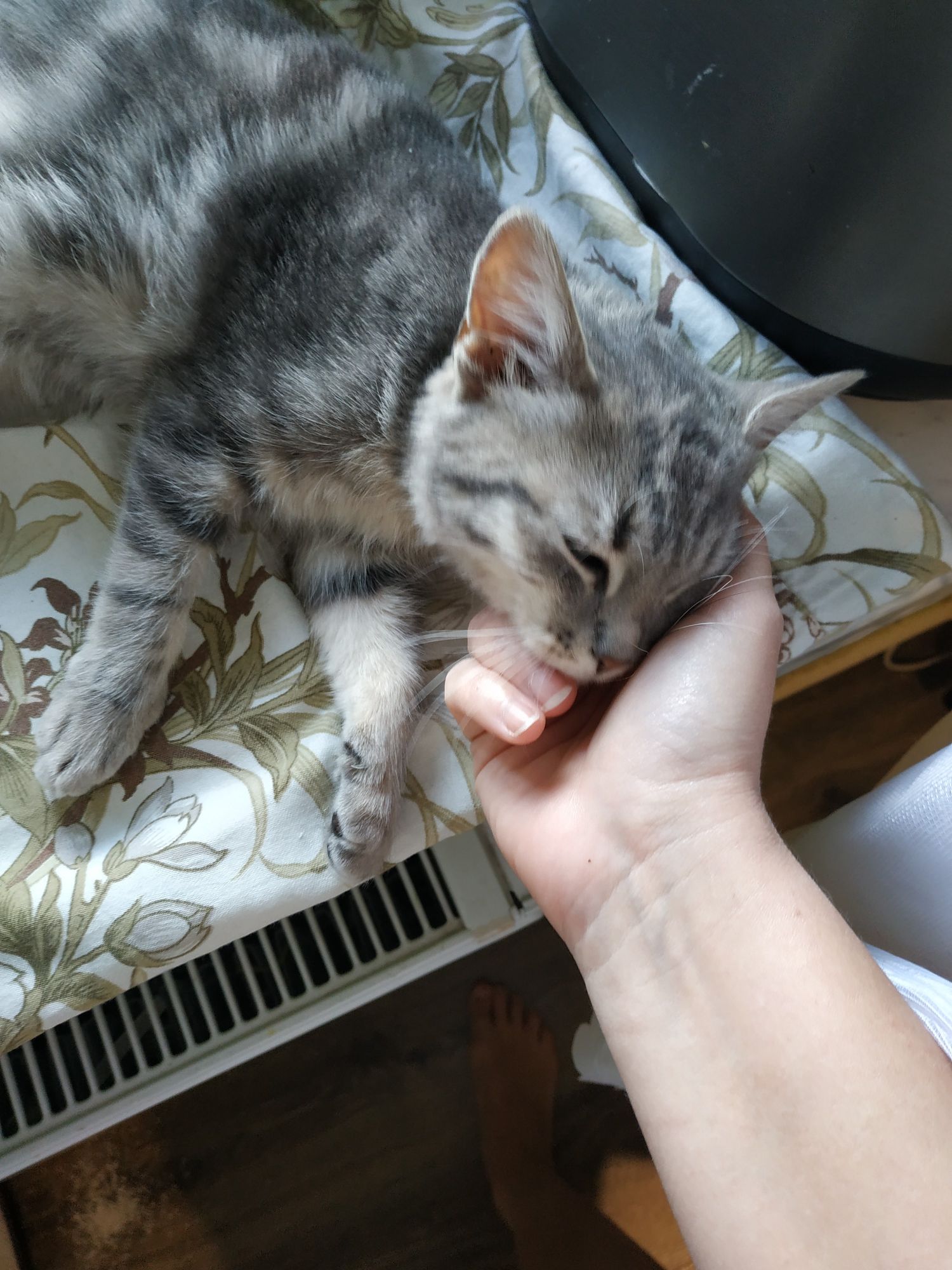 23 ноября 2021 А у меня неделю назад появился новый хвостик. До этого много лет в семье жили две кошечки - Мила старшая, черная и "дворянка", и Кнопа, младшая, на три четверти перс и на четверть гималайская. Особой любви между ними не было, так, сосуществовали на одной территории. Прошлой осенью Кнопа ушла на радугу... Я не хотела брать еще кошку, боялась реакции 15-летней Милы. Но мама на даче нашла этого малыша, ручного, домашнего, голодного! Себе взять не смогла, у нее трое зверей, и кот и псом очень нервничали. А я не выдержала. Сейчас котик карантинит на кухне, Мила его пару раз увидела, обшипела . Стараюсь кормить рядом через дверь, глажу постоянно, чтобы к запахам привыкали, но все равно волнуюсь - как моя старушка новенького выдержит. А отдать некому. Вот Мила, поела и дрыхнет А это кошачий ребенок, пока безымянный: Г@лина, Nina A, snowflake и 27 других сказали спасибо Поделиться сообщением Ссылка на сообщение