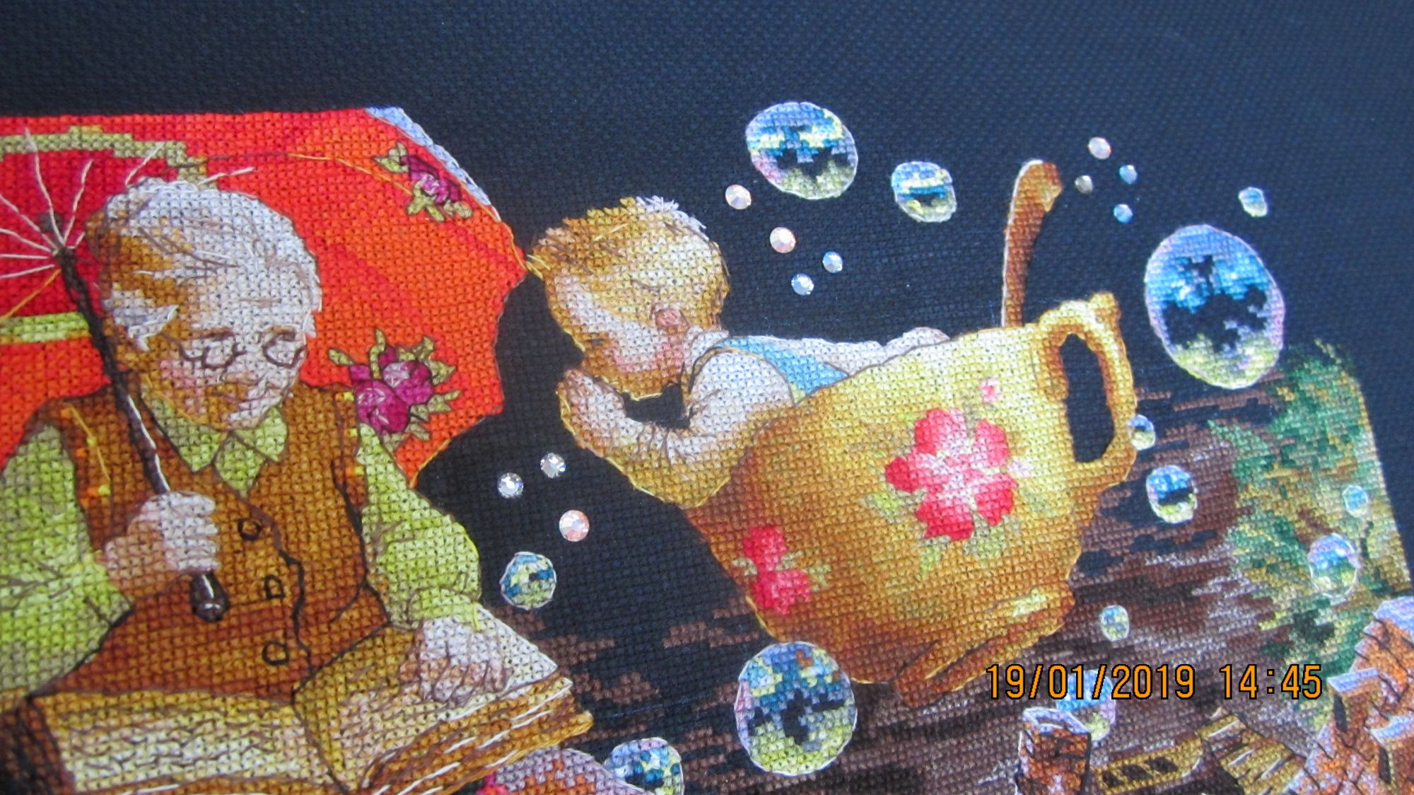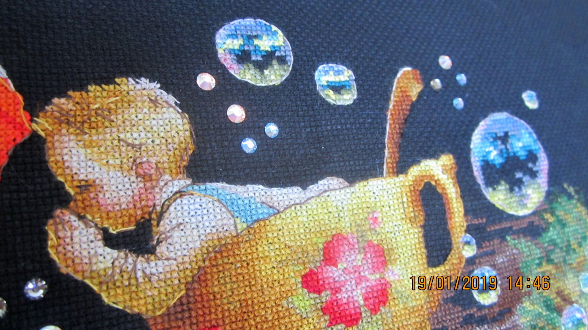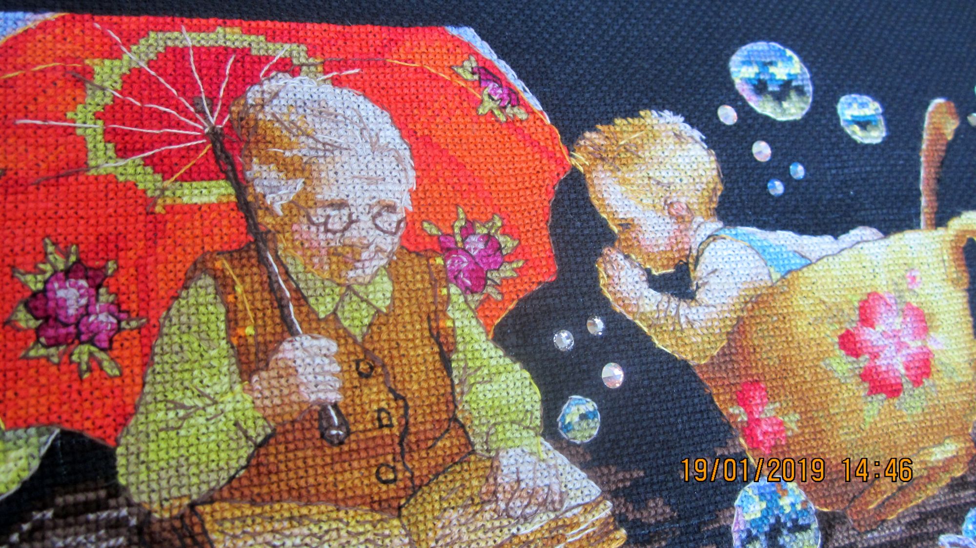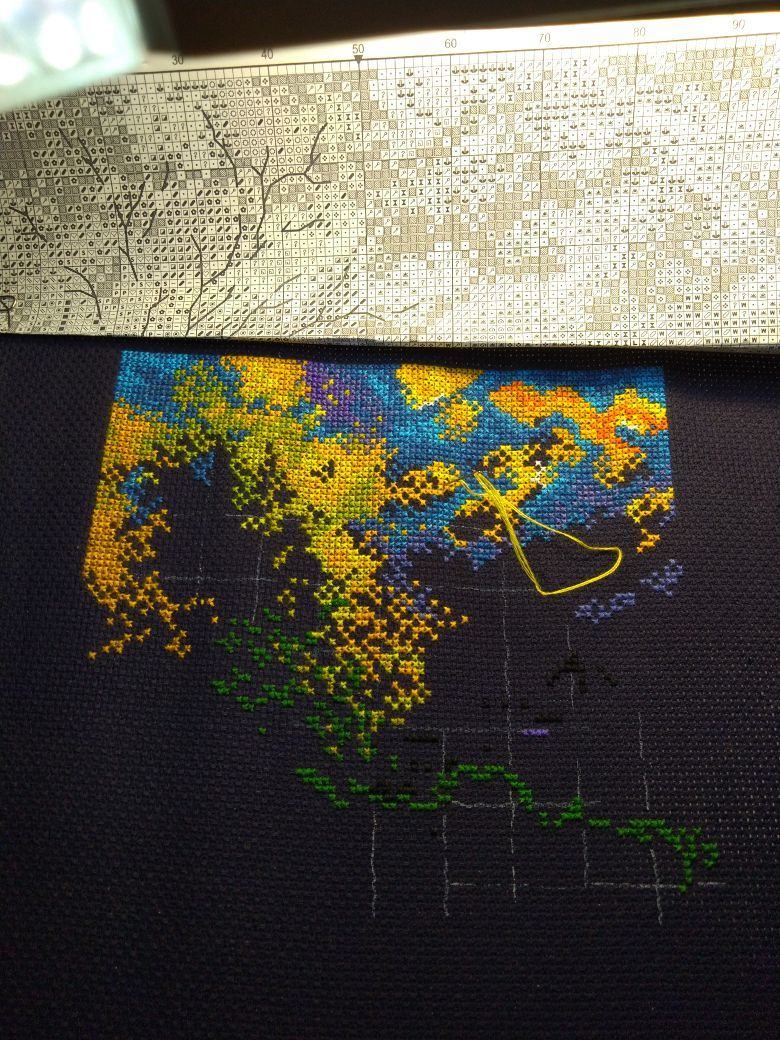 19 января 2019 Вот и закончился очередной процесс :(. Вместо фр.узелков приклеила стразы. В вечернем освещении они сияют, как настоящие звезды. В процессе вышивки использовала маркер белого цвета для разметки. Как обычно, по завершении, постирала готовую вышивку в холодной воде. Маркер смылся, но.... после того как все высохло...о ужас! ...он появился вновь :(. На помощь пришла смекалка :), закрасила проявившиеся белые полосы карандашом для подводки глаз. Он мягкий и на черной канве он не виден. Повезло :)! maria7909, nogres, sunny981 и 3 других сказали спасибо Поделиться сообщением Ссылка на сообщение