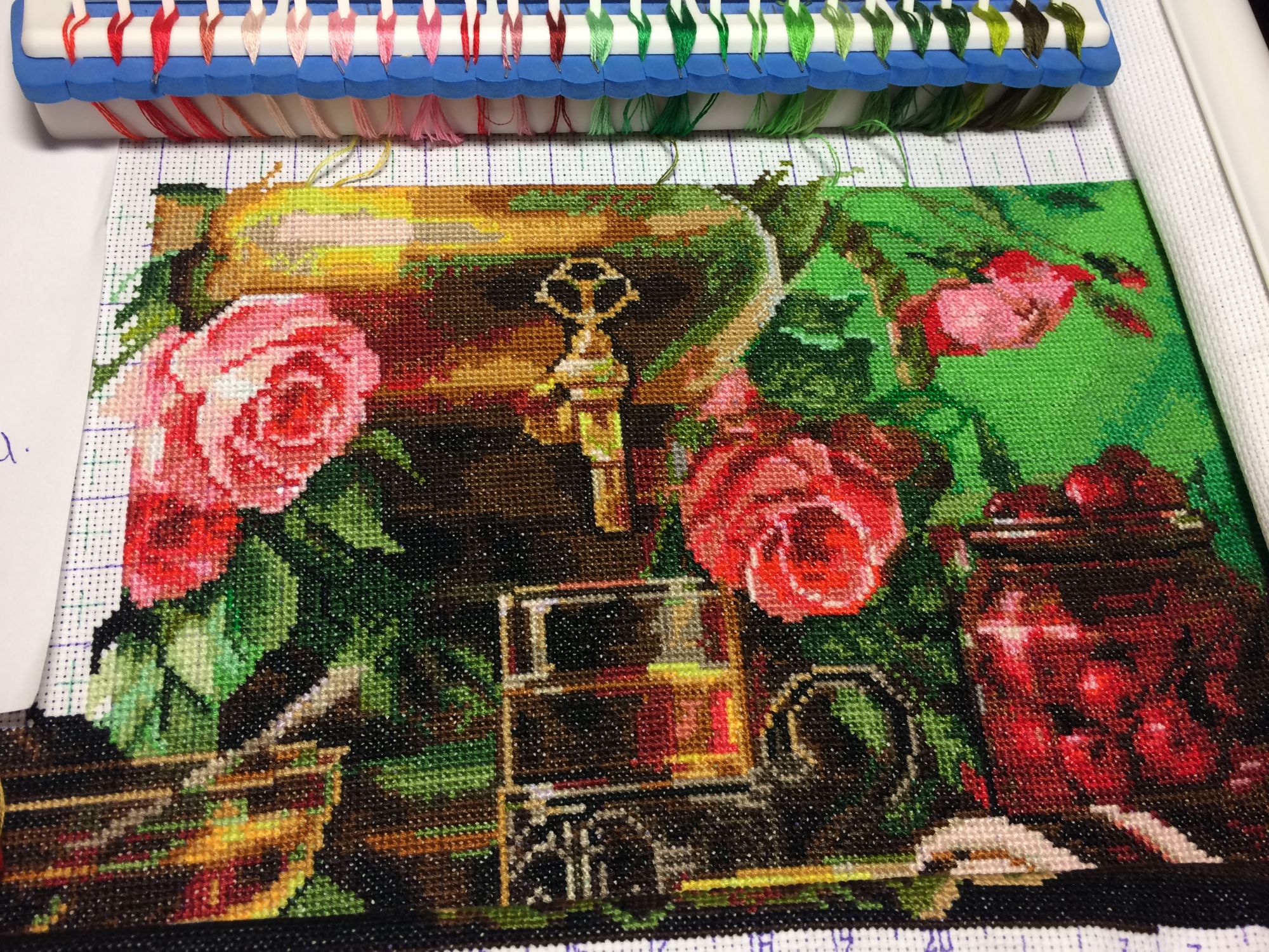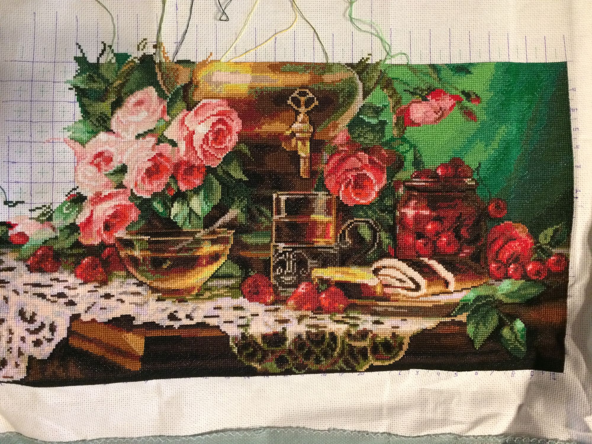 14 апреля 2021 Никак самоварчик не нарисуется, только еле угадываемый бочок-серый волчок.. Зато носик-краник во всей красе, стакан в подстаканнике и банка с вишенками теперь выступили практически на первый план. А я принялась за розовые розы, что высунулись из корзинки, которая стоит за самоваром. Только недавно это рассмотрела, хотя нет, больше догадалась, когда вышилась какая-то плетеная палка справа от самовара. Из оперы, догадайся, мол, сама. Пришла к выводу, что букет роз принесли из сада в плетеном лукошке, просто оно осталось за кадром. татьяна0674, Графиня, Хельга и 25 других сказали спасибо Поделиться сообщением Ссылка на сообщение