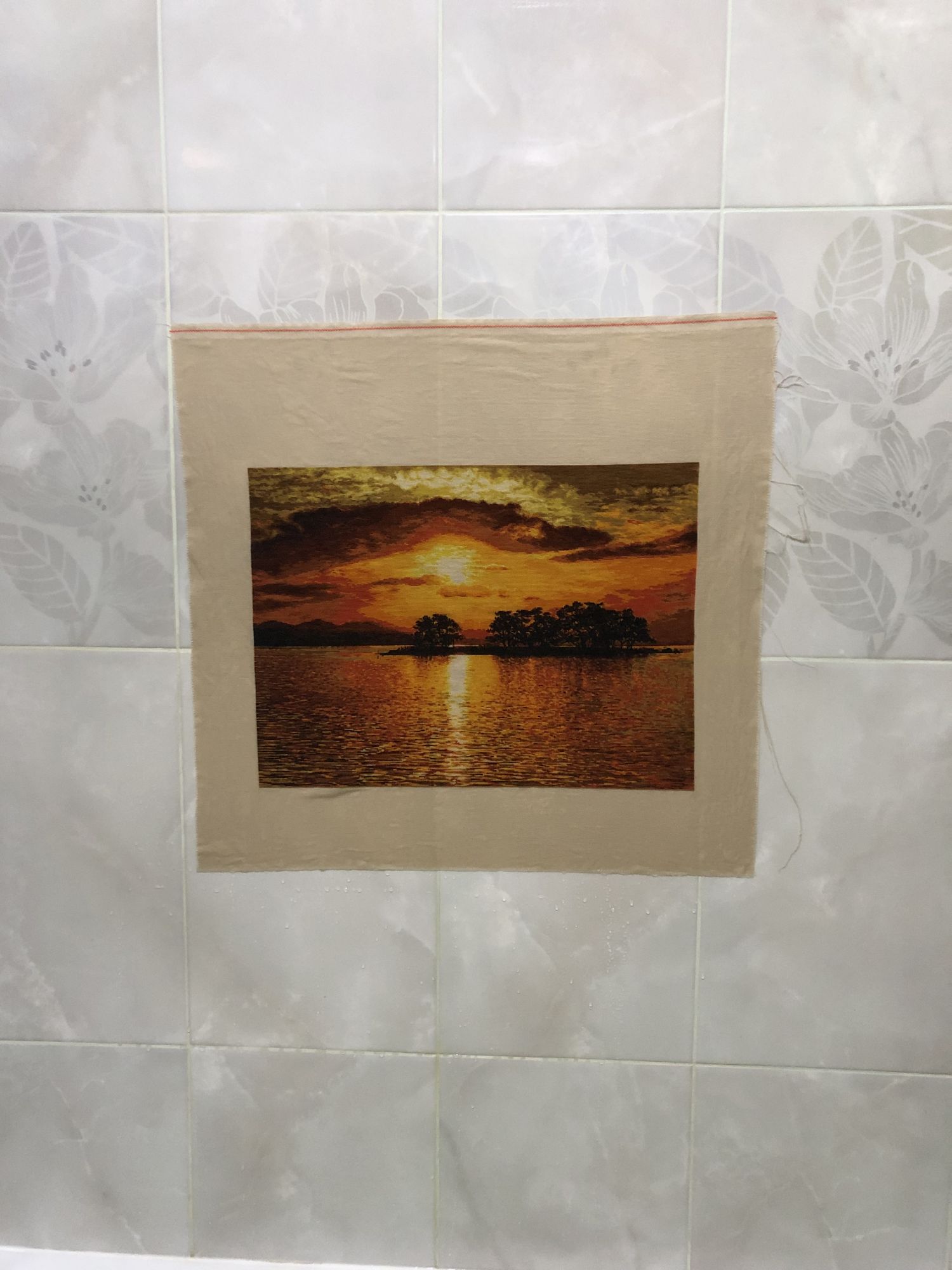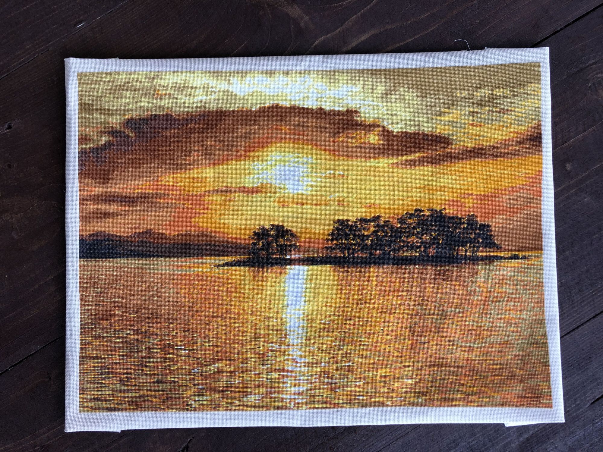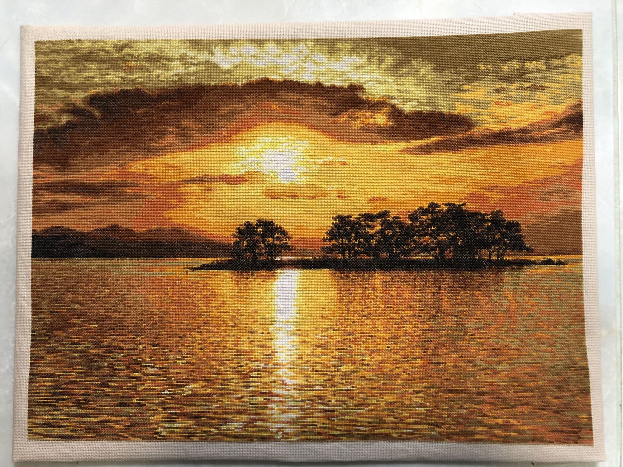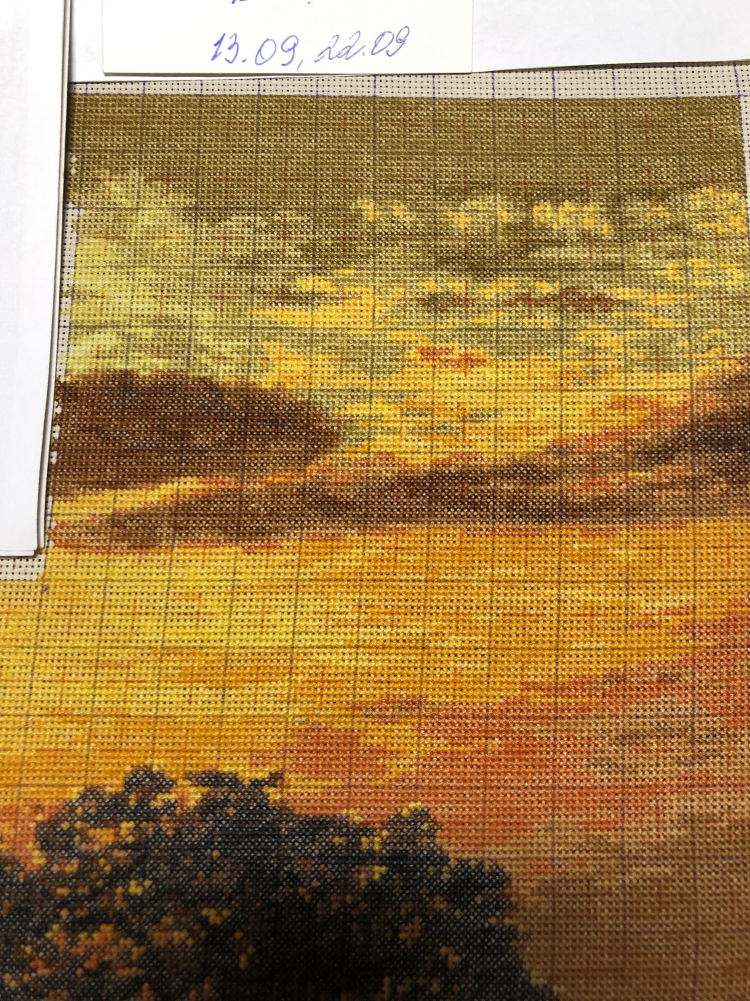 28 октября 2021 Привет, девочки. Промежуточный отчет еще одного листика я пропустила, зато мне сейчас есть что показать. Я закончила Золотой Закат(именно так, с заглавной, обожаю закаты-рассветы) Напомню: Goblenset 509 Золотой закат (Golden sunset), 35х26, 22 цвета, гобелен Вышивала полным крестом в одну нить на Аиде Цвейгарт, 20каунта, номер 309 Чему очень рада, размер получился хоть и минимальным в сравнении с затратами 42х31. Почему-то хотелось увидеть больший размах - шучу. И никакого перекоса, как у гобеленов, бр-р. После того как вчера вечером сделала последний крестик, минут пять сидела, тупо на него уставившись - и это сделала я! Сказать, что я в восторге от дизайна и получившегося результата, это ничего не сказать. Работа атмосферная, стоишь на этом берег и хочется смотреть и смотреть. Честно сказать, пока вышивала, не покидала мысль, а вдруг ожидания не оправдаются? Те работы, что есть в Галерее, не очень хорошо для меня показывают всю переспективу, но картинка набора обещала хороший результат. Так и получилось. Эта колышащаяся под тихим ветерком водная гладь, завораживает, носом постоянно утыкаюсь, чтобы поближе рассмотреть ее. А небо! какое там небо! Оно живет, и облака плывут, я вижу как играет с ними ветер! Ну в общем, как-то так. А уж как ЭТО все было интересно вышивать, как пазлы собираешь. Вода вообще на ура у меня шла, потом, когда перешла повыше, очень скучала по ней. Хотя эти нижние три листа вышивались по одному листу в месяц, зато сколько удовольствия я получила. Самое для меня сложное было вышивать светлыми оттенками на небе кучевые облака, сто раз порадовалась, что не на светлой канве. Они настоящие, живые - повторюсь. Ниток по ощущениям осталось , наверное, чуть больше половины. Девочки, у кого есть этот набор в Закромах, вышивайте не бойтесь сложностей там нет никаких! Оформлять сразу поеду. kas_julia, Гало4ка, Lusha73 и 24 других сказали спасибо Поделиться сообщением Ссылка на сообщение