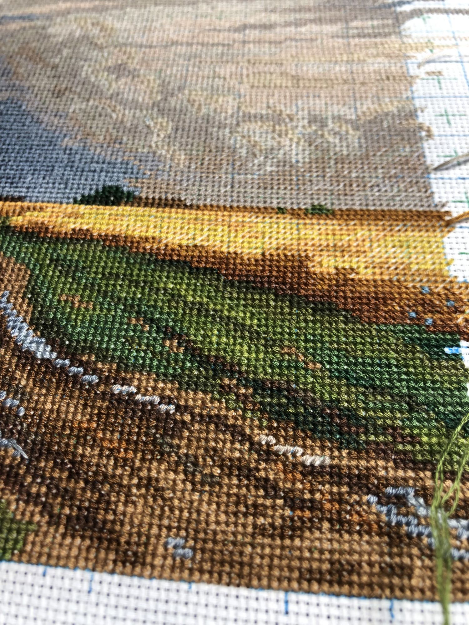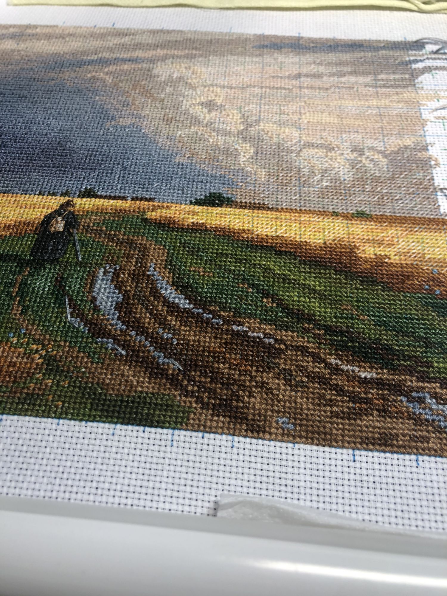 31 марта 2023 1 час назад, Юнона1960 сказал(а): Девочки, спасибо большое за комментарии. Вышивается Панна не сложно, только нужно приспособиться. Ниточки тоже ведут себя по разному, но не запутываются - однозначно, это большой плюс. Немного по ощущениям пересушенные, но не все. Есть некоторые цвета вообще идеальные, мягкие и шелковистые, ими даже полукрест в 4 нити отлично идет, а его здесь больше половины работы. Я во второй части стала чередовать небо из полукрестов с полем крестиком в две нити, и легче стало и интереснее. Однако, вышив уже половину работы, решила намного побэкаться, ну нет, не мое, прямо через не хочу. Сделала один кустик только. Оставила н апотом. И появился странник с котомкой ( по-современному - рюкзак )за плечами его еще плохо видно, но он движется в сторону деревни, которая еще не виднеется вдалеке, у горизонта, пока дождь его не нагнал, грозовая туча с завихрениями, их тоже пока нет (но они есть ) И очень мне нра линия горизонта за ржаным полем . ( про рожь, которая хорошо, поет мы знаем). В общем, повезло мне с набором, как хорошо успел найтись, а Надя вовремя выложила его на день вышивальщицы. Как же красиво! У Нади любовались, теперь к тебе ходим в гости любуемся))) Юнона1960 сказал(а) спасибо Поделиться сообщением Ссылка на сообщение