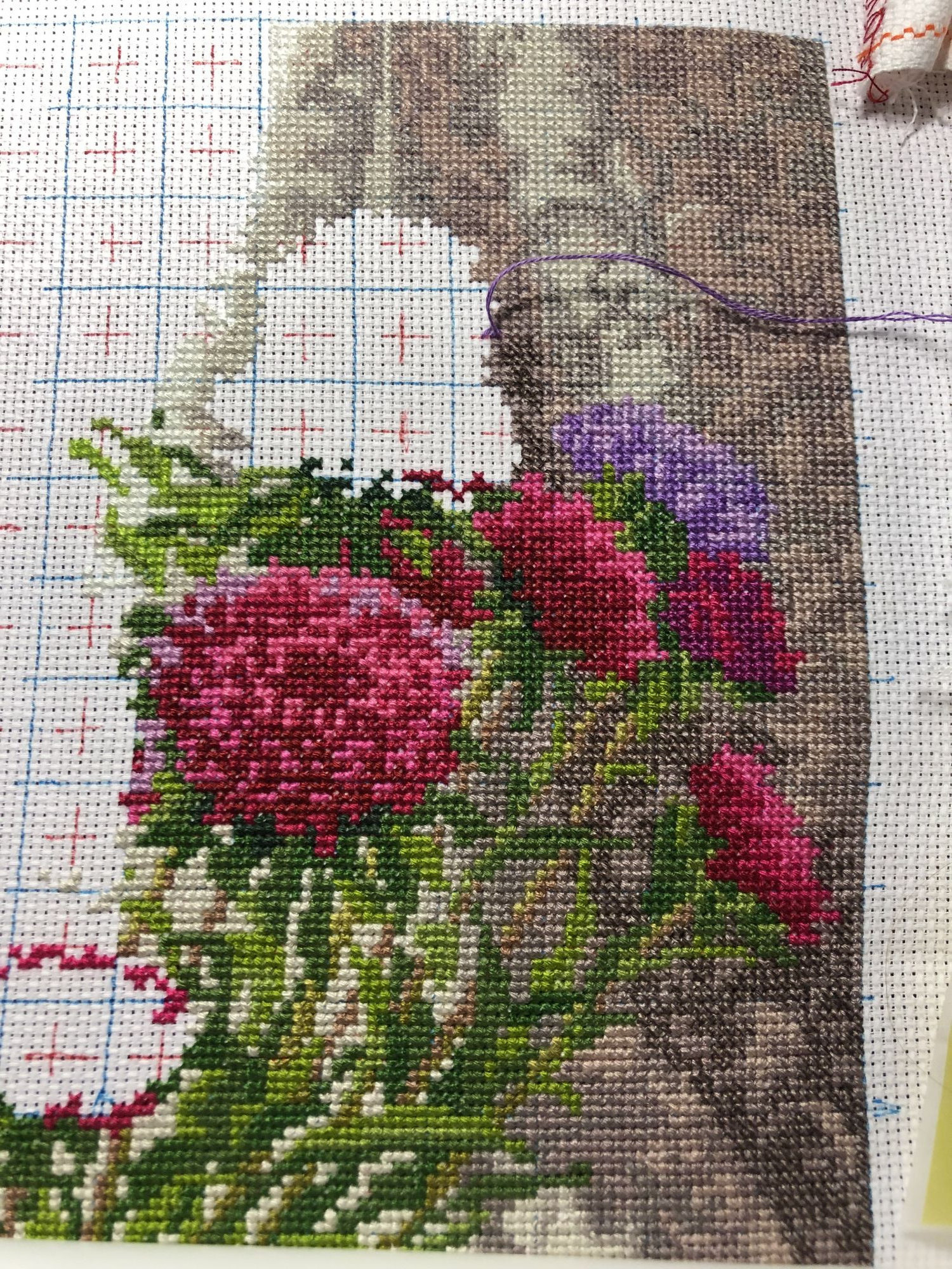 12 сентября 2023 Осталось два листа. На лист ушло целый месяц. Как-то не складывается у меня с этим набором. Вышила целых две пасмы не тем цветом; где-то в другом наборе, может, просто бы поменяла с рядом стоящим цветом, но тут такая катавасия в зелени, и, подумала, она ведь и дает тот эффект первого плана у букета, все эти лепесточки, веточки, тени, что сразу и выпорола. И, хвала ниточкам, они остались в том же первозданном виде, что и на плашке. И еще в этом наборе у меня две претензии к, сама не знаю, кому. Ни к кому. Два цвета на плашке имеют в каждой пасме по 5 ниточек, пять, не шесть. Ошибка на производстве, скорей всего. Когда-то мне уже такое попадалось у ЗР, в белых нитках. Один из значков уже закончился, из 22 пасм осталось две, хватает. Спасибо ЗР за то, что вкладывают запас. И один цвет точно не Мадейра. Второй под вопросом. Скрутка не такая как у Мадейры. Но это ничего, без претензий, ниточки ведут себя хорошо. ОлюшКа, ЛАДОМИРА, Цыпа и 16 других сказали спасибо Поделиться сообщением Ссылка на сообщение