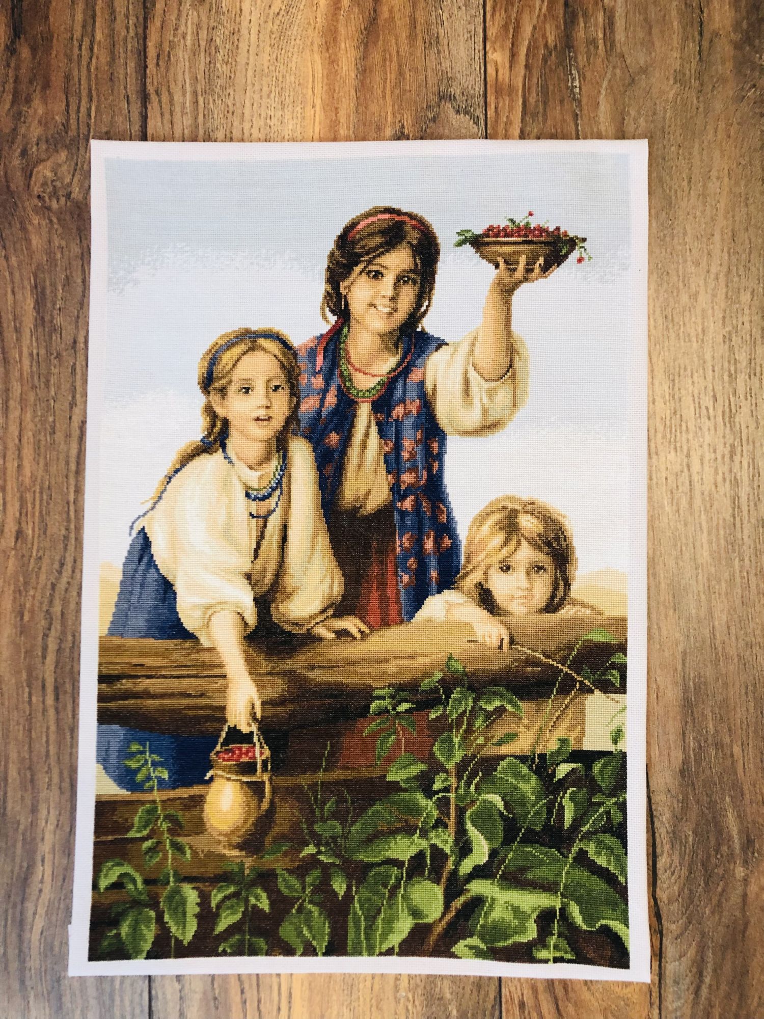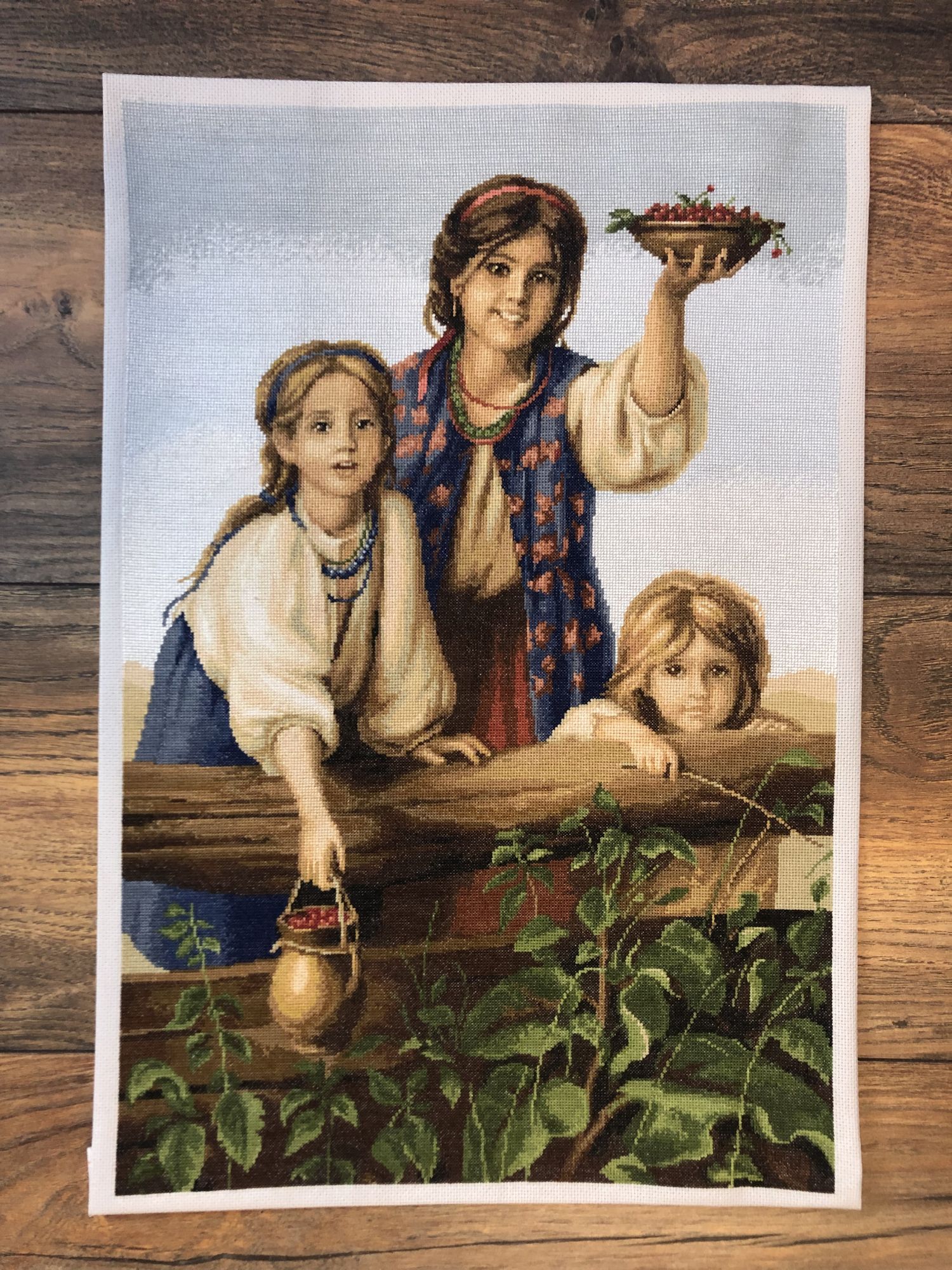 12 февраля 2024 Здесь в гаечку ничего нет, в Сжатые отправила. Вот я довела до приличного состояния, постирала, отпарила, как-то даже сфотографировала, могу теперь показать и немного рассказать о процессе .Это был Лука-с, Купите ягод, по картине русского художника Харитона Платонова. Немного даже почитала о нем и создании картин. Не буду лекции читать, кстати, о нем не так много информации, в общих словах, родился - женился..в Ярославской губернии, Мологский уезд, (сейчас эта территория затоплена, кажется, под Рыбинское водохранилище, ну там другая история). Потом он переехал работать и преподавать в Киев, и, судя по дате создания картины "Купите Ягод", писал он ее уже в южном районе, и девчонки явно южанки, отсюда, возможно, и загорелые лица. Я еще хотела найти фото этой работы в обрамлении и где она сейчас, не попалось ничего, кроме того, что находятся в частном собрании. В основном вот такие фото. и моя скромная вышивка Считаю, что дизайнеры Лука-са отлично проработали все детали, очень кропотливо было вышивать лица, вообще оттенки ниток рядом стоящих значков практически неразличимы. Мне понравилось. А вам? И немного технической информации, вдруг кто-нибудь впечатлится и захочет вышить. Я купила гобелен, не помню почему, а, наверное, в Димшопе не было в крестике, да и на порядок дешевле, если что., и у меня уже есть опыт вышивать гобелены крестиком в одну нить на 20 канве. Это кайф. Канва была припасена, ее как раз, тютелька в тютельку, хватило на размер крестика. Размер получился 44 на 29, в крестиках 380 на 240. Ниток осталось много, вот , родная гобеленовая канва, не знаю, как она называется. Всем привет. А, нет еще. Жажду оформить. Selinta, Охотница, Лена1973 и 17 других сказали спасибо Поделиться сообщением Ссылка на сообщение