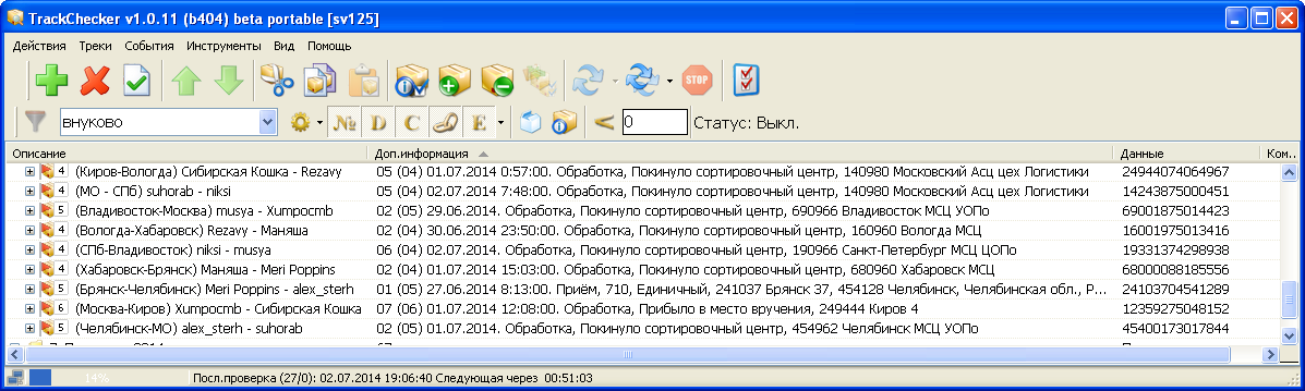 2 июля 2014 как у вас получается вставить таблицу отслеживания? у меня что-то не красиво почается ерация Дата Место проведения операции Атрибут операции Вес (кг.) Объявл. ценность (руб.) Налож. платёж (руб.) Адресовано Индекс Название ОПС Индекс Адрес Приём 28.06.2014 12:20 142438 Буньково Единичный 0,623 - - 193313 Санкт-Петербург Обработка 30.06.2014 16:15 142416 Ногинск Уооп Покинуло сортировочный центр - - - Обработка 01.07.2014 05:23 141027 Мытищи СЦ Покинуло сортировочный центр - - - Обработка 01.07.2014 08:23 140983 Московский Асц цех Посылок Сортировка - - - Обработка 02.07.2014 07:48 140980 Московский Асц цех Логистики Покинуло сортировочный центр - - - Поделиться сообщением Ссылка на сообщение