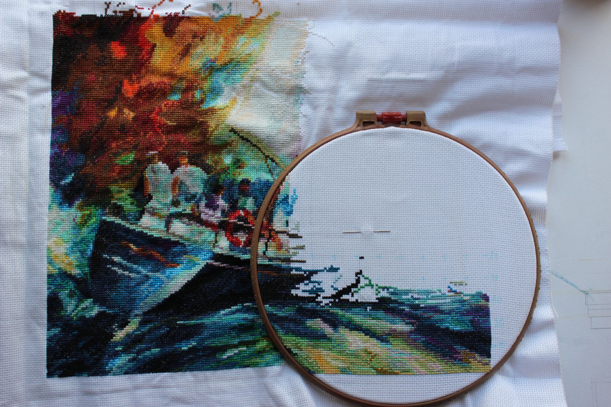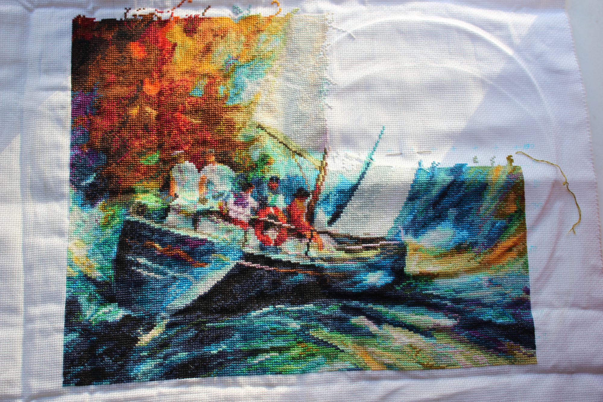 14 сентября 2016 Привет! Почитала с утра сегодня Надин (chana75) отчет, вдохновилась и вспомнила, что неплохо бы и самой отчитаться. Вышивальное. 1. Изабелла. Было/стало: Бокальчик живьем просто офигенно смотрится) Осталось немного листиков, виноградинок и кусочек стола. 2. Риолис Курцхаар. Было/стало: Это за пару дней, появился третий угол. Травка не выбешивает пока, нравится вырисовывать травинки. Ну да, одиночки там попадаются, но немножко совсем. По логике вещей эти две работы к концу сентября будут готовы. 3. Традиционно в поездке в Питер вышивался Парусник по Афремову от ЗР. Довольна продвижениями, закончен третий лист из шести! По крестикам это точно больше половины, потому что листы левые шире, и два нижних тоже больше верхних...хотела посчитать по клеткам дома, какая часть вышита, но не успела. Было/стало: Конечно, если он будет шиться только в поездках в Питер, то это еще пару лет...не теряю надежды взяться за него плотнее. Путешественное. Провела 5 чудесных дней в Питере с дочкой. Погоду привезли с собой) Один день только было дождливо, все остальное время - яркое солнце, восхитительно разнообразные облака, пасмурно совсем местами и довольно тепло. Гуляла по городу в свое удовольствие, пока ребенок учился, фотографировала просто то, что нравится...там каждый дом можно фотографировать. Фотографии покажу скорее просто для того, чтобы показать, как нам повезло с погодой! А то ведь не поверит потом никто, особенно питерцы))) Здания: Растительность. Весь город и пригороды засажен шиповником, которого я никогда не видела - у нас, по крайней мере, такой не растет. Цветет все лето, и ягоды висят одновременно и красные, и зеленые...ягодки не длинные, как я привыкла, а кругленькие, как маленькие яблочки. Вот такая красавица-калина растет на Марсовом поле: Нашим проводником по пригородам была Надя chana75. Побывали с ней в Пушкине. Она у себя фотки показывала, но я повторюсь, потому что английская дача, куда она нас вела партизанскими тропами - самое яркое впечатление в Пушкине, куда там дворцам! Там снимали Шерлока Холмса и доктора Ватсона, очень хочется пересмотреть фильм...Место заброшенное, домики заброшенные, хочется надеяться, что из приведут в порядок, пока английская черепица не совсем съехала с крыш...но место потрясающее, хотелось ходить кругами и фотографировать с разных ракурсов...фотик подвел, на ярком солнце утратилась четкость, но впечатление и настроение вполне передано. Стоя на этой аллее, ожидаешь услышать стук копыт...кэб, или просто всадник.. Соседний домик в том же стиле, но выглядит более ухоженным. В общем, мы с Надей решили, что непременно будем жить в таком доме... Ну и пару кадров из парка - погода-то, погода-то какая!!! Запомните ее такой) В день отъезда Надя повезла меня в Линдуловскую лиственничную рощу, которую начали сажать еще при Петре и продолжают до сих пор...двухсотлетние, уходящие в небо лиственницы, в два обхвата...Надя считала кольца на спиленном дереве - около 200 насчитала.И шумная река с порогами...казалось, нас перебросило куда-то в тайгу)) во всей роще - ни души, только белку встретили - да и слава богу...когда смотрела на поваленные деревья, думала, что явно не хватает мишек...но потом решила, что и так вполне себе ничего))) Этот муравейничек всего лишь по пояс, в интернете видела фото в рост человека... А какой там воздух...не уходила бы оттуд