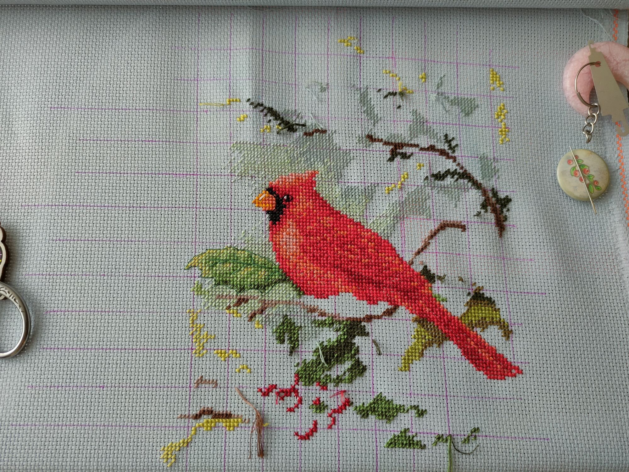 3 апреля 2022 Привет, дорогие! Ну что ж, у нас опять выпал снег, чур это не я виновата)))) Мережка К-152, Robins На канве появилась первая веточка, а я продолжаю кайфовать от процесса. Dimensions 8738 Early Snow Cardinals Вы посмотрите на этого красавца, не смогла я шить зелень пока он не появился на канве))) И это уже 20% работы, пошла наверх вышивать свое имя)) А еще я наконец приклеила вышитый в прошлом году гранат на картон и пришила к нему задник. И целый день гордо ходила с ним на работе)))) Вот такие новости на данный момент, надо начать что-то весеннее, вдруг весна одумается и наконец придет к нам насовсем))) Из домашнего, ребенок вырос, идем в 1й класс этой осенью, поэтому наша спальня превратилась в его комнату, и я позавидовав ему, заказала стол с креслом еще и себе, теперь у меня есть свой рукодельный, любимый уголок. На этом все, всем хорошего настроения и весны! Дикая белочка, ole4k@, Lakis и 6 других сказали спасибо Поделиться сообщением Ссылка на сообщение