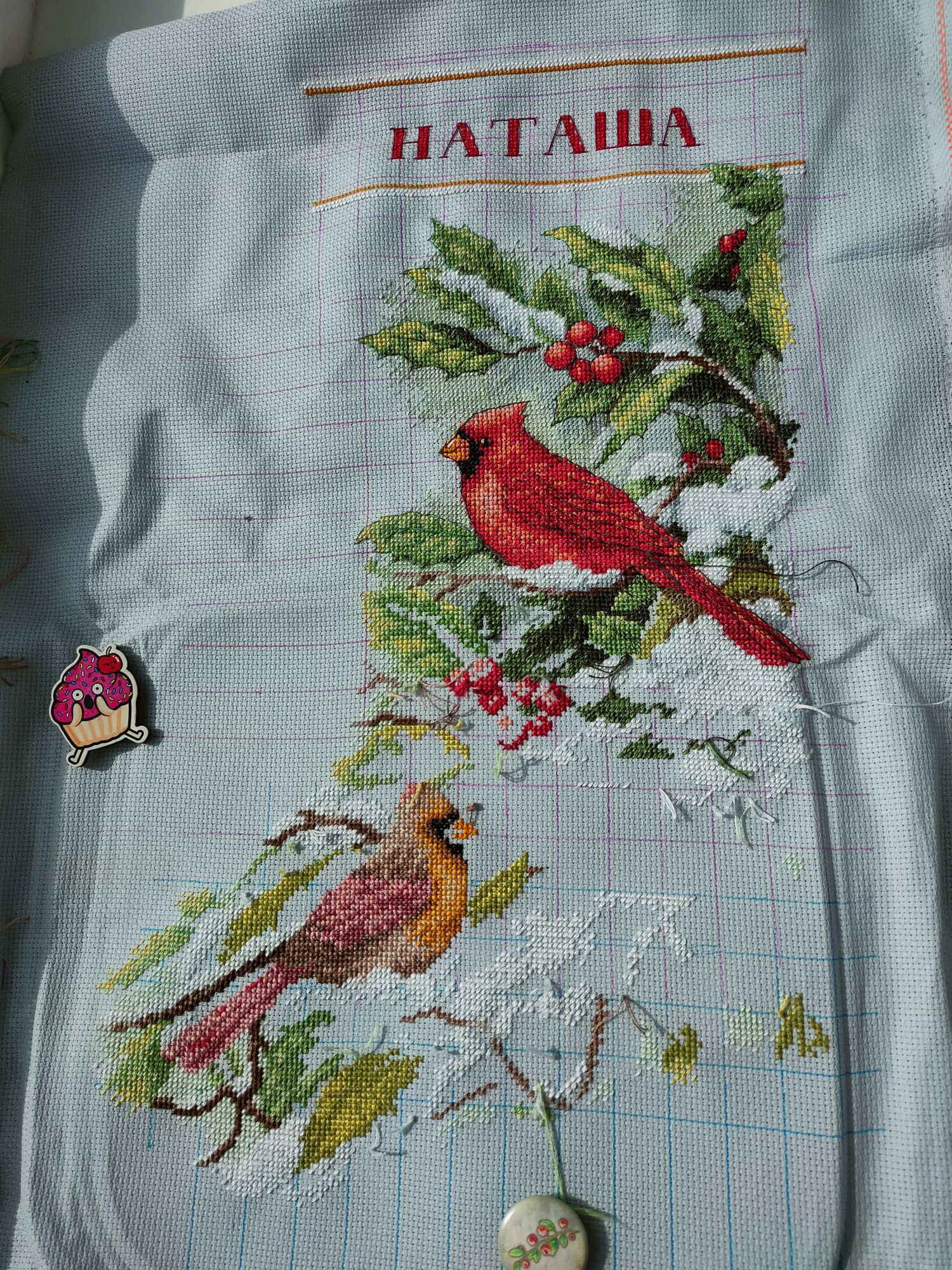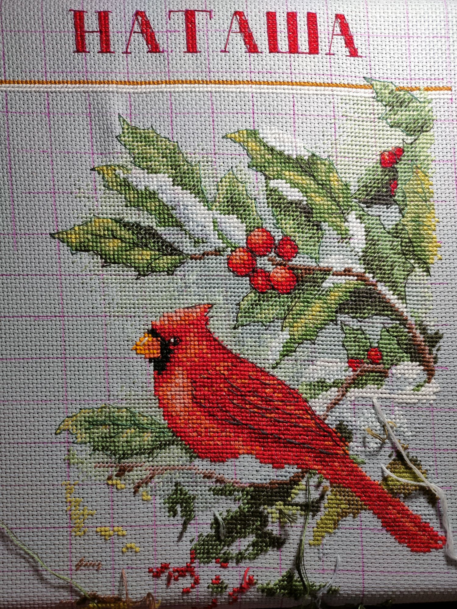 13 апреля 2022 Привет, довочки Dimensions 8738 Early Snow Cardinals у кардиналов появилась верхняя половина и мое имя. Одного цвета я нашла катастрофически мало, поэтому зелень получилась сборной, но как это выглядит, мне нравится. Красные оттенки кончились на самом кардинале, поэтому ягодки частично подбором нитками анкора, они более сочные и яркие. Мне кажется это также работу только улучшило. Процесс достаточно простой, не скажу, что зелень вышивать очень интересно, поэтому я уже перешла на самочку, но она уже в следующем отчёте)))) Всем добра и тепла! Egelia, ole4k@, Каори и 6 других сказали спасибо Поделиться сообщением Ссылка на сообщение