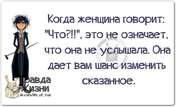 23 сентября 2014 1. Еду на машине по Москве, а меня пешеход обгоняет... 2. Эмоции – как лошади: либо ты ими управляешь, либо они несут тебя куда-то вдаль галопом... 3. Нецензурная брань никогда не украшает женщину, но всегда делает понятными её требования! 4. Можно вытерпеть кучу испытаний, а потом сорваться из-за того, что чай недостаточно сладкий. 5. - Простите, что так поздно звоню... - А вы не поздно, вы вообще зря. 6. - Дорогая, что-то мне хреново уже с этой жирной пищи… Давай перейдём на что-нибудь полегче? - Как скажешь! Давай, конечно! - Отлично! Пойду лимончик и коньячок куплю. 7. - У вас есть книги по бессмысленным диалогам? - Конечно. - Хорошо. 8. Анастасия Волочкова прокомментировала появление в Сети пикантных фотографий со взломанных страниц знаменитостей. "Надеюсь, что пароль к моему аккаунту, Zkf1495aSb, достаточно надёжен..." - заявила она. 9. Каждый студент знает, что нельзя сложить лист бумаги пополам более семи раз. А вот тюбик зубной пасты можно. 10. - Абрам, что это у вас за бланш под глазом? - Да представляете, Сема, вчера сидели всей кафедрой филологии в ресторане, спокойно отдыхали. Все — интеллигентные люди. И тут пришел муж Аллы Васильевны, бывший военный, и влез в разговор. Говорит: "Был у меня один х@# в роте...". Я, конечно же, поправил: "Не в роте, а во рту"... 11. Здравствуй, добрый молодец! Здравствуй, птичка-невеличка! Здравствуй, деревце зелёное! Дико перед всеми извиняюсь – первый раз за рулём... 12. В пятницу люди уходят с работы пораньше, чтобы подольше постоять в пробках. 13. Реклама в аптеке: "При покупке двух тестов на беременность одновременно – успокоительная микстура в подарок. А при покупке трёх – бутылка шампанского!" 14. Воспитательница детского сада полчаса натягивала рейтузы на маленькую девочку. Когда она со вздохом облегчения выпрямилась, девочка сказала: - Это не мои рейтузики… Внутренне рыча, воспитательница 15 минут стягивала рейтузы обратно. Когда она закончила, девочка сказала: - …это рейтузики моего брата. Мама иногда надевает их на меня. Маняша, Bellatrix, Griffiti и 16 других сказали спасибо Поделиться сообщением Ссылка на сообщение