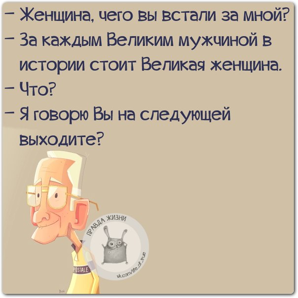 31 октября 2014 - Дорогой, до свадьбы ты всегда брал для меня такси, а сейчас считаешь, что можно ездить на метро. - Это потому, что я очень горжусь тобой, дорогая. В такси тебя видит только один шофер, а в метро - тысячи людей. Надежда Ста, герда28, Клопшик и 2 других сказали спасибо Поделиться сообщением Ссылка на сообщение