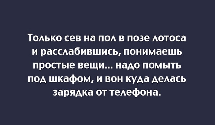 9 апреля 2015 Ой, девочки мне тааааак понравилось, спешу поделиться=) 60 цитат, подслушанных на Уолл-стрит Самые меткие высказывания, подслушанные в лифте самого знаменитого инвестбанка, от людей, которые владеют почти всеми деньгами мира На Уолл-Стрит есть человек, который, работая в одном из крупнейших и авторитетнейших инвестиционных банков в мире Goldman Sachs, ведет твиттер-аккаунт, где собирает цитаты, подслушанные в лифтах офисов Уолл-Стрит. Хотя они порой высокомерные и смешные, однако раскрывают правду жизни. Итак, вот 60 самых метких высказывания людей, которые владеют почти всеми деньгами мира: 1. Научи человека ловить рыбу, и он снова проголосует за того, кто ему пообещает дать эту рыбу. 2. Если меня уволят — это будет хорошей проверкой моей жены на верность, если же меня повысят — то проверкой меня. 3. Если у вас хороший метаболизм, голова полна волос и хорошей работы, не женитесь молодым, Подождите 10 лет и делайте выбор. 4. Статистически тебе нет смысла волноваться, как выглядит мама твоей первой жены. 5. Я бы с тобой согласился, но тогда мы оба будем неправы. 6. Каждый телефонный разговор я начинаю со слов: «Мой телефон почти сел и может отключиться, так что давай по-быстрому». 7. У соседа трава зеленее, потому что удобрена дерьмом. 8. Музыка была лучше во времена, когда разрешали петь некрасивым людям. 9. Новый признак крутизны — встретиться с друзьями и ни разу не заглядывать в телефон. 10. Тот факт, что есть уродливые проститутки, исчерпывающе показывает суть мужчин и свободного рынка. 11. У большинства знаменитостей нет даже университетского образования — так какого черта вообще с ними советоваться по какому-либо серьезному вопросу? 12. Только неандерталец опускается до физического насилия. Я же предпочитаю унижать морально, ломать дух и лишать надежды. 13. Одна из моих любимых вещей — когда кто-то размещает свою селфи, и никто ее не лайкает. 14. Когда слышу «Есть минутка?» — понимаю, что сейчас потеряю полчаса, которые никогда не смогу вернуть. 15. Слушание собеседника на половину состоит из ожидания своей очереди сказать, а на половину из напоминаний себе менять выражение лица каждые 10 секунд. 16. Будь собой — отличный совет примерно для 5% людей. 17. Тату - это не мое — я же не вешаю наклейки на бампер своего Ламборгини. 18. Скоро ты поймешь, что тишина — лучший способ послать на хер. 19. Когда ты травишь свои истории — я думаю только, насколько же короче они могли быть. 20. Когда мне говорят «Надо нам как-нибудь встретиться», я отвечаю «Конечно, я позвоню тебе». Это ложь в ответ на ложь. 21. Бедняки едят столько фаст-фуда, что, кажется, их время стоит безумных денег. 22. Я просто хочу быть достаточно богатым, чтобы не быть зацикленным на деньгах. 23. 98% людей, комментирующих в сети смерть Манделы, не смогут ответить на простейшие вопросы о его жизни. 24. Одна подруга спросила меня, что я буду делать, если у меня будет 10 миллионов баксов. Я ей ответил: «Спрошу, где все мои остальные бабки». 25. Мне не нужен чехол для Айфона — я, что, безответственный или нищий? 26. Прежде чем люди могут высказывать свое мнение по Сирии, они должны сперва показать ее на карте. 27. Как жаль, что тупость не причиняет боль ее носителю. 28. Цветы и извинения в разы проще, чем что-то менять в себе. 29. Карабкаясь на вершину пищевой цепи, мы ведь не были вегетарианцами. 30. Большинство людей даже в фильме п