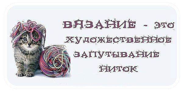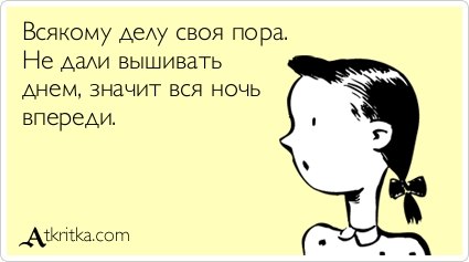 29 марта 2015 Чем занимается ваша жена, если ?.. 1. Глядя на картину, вы разбиваете ее на маленькие квадраты. 2. На вашем домашнем столе всегда прикручены пяльца. 3. Дома, когда нет жены, вы читаете через лампу с увеличительным стеклом. 4. Вы чаще бываете на почте, получая очередную посылку из интернет-магазина, чем посылаете родным открытку. 5. Вы знаете все магазины, продающие нитки в вашем городе, и стараетесь их тщательно обходить. 6. Ваша кошка уже давно разборчиво перестала есть китайские нитки, предпочитая им английские или немецкие. 7. Бывая в гостях, вы не обращаете внимания на картины, написанные маслом, тем более – на фотографии. 8. Вы подписаны на море журналов с непонятными для вас схемами, которые постоянно накапливаются в вашем шкафу, вытесняя оттуда на дачу любимые вами автомобильные журналы. 9. Ваш рабочий ксерокс постоянно используется для увеличения схем, а ваши коллеги думают, что вы увеличиваете план помещения, где звездочки, уголки и квадратики обозначают сотрудников и их компьютеры. 10. Вы различаете цвета только по каталогу DMC, причем, можете при желании вспомнить номер цвета. 11. Вы просматриваете графические файлы на вашем компьютере программой WinStitch. 12. На рабочем столе вашего домашнего компьютера разбросаны файлы шаблонов. 13. Вы боитесь поставить чашку кофе на скатерть, где только недавно появился новый узор. 14. На вашем носовом платке вышиты ваши инициалы. 15. Вместо бумажек для записей вы используете обрывки канвы. 16. Приглашая новых гостей к себе домой, вы подолгу мучаете их походами от стены к стене, прежде чем сесть к столу, рассказывая и показывая вышитые картины, а по их реакции вы решаете, открыть тот или иной напиток. 17. У вас никогда нет проблем с подарками для жены. 18. Вы стали более терпеливым и можете подождать полгода, прежде чем вбить в стену новый гвоздь, однако вы постоянно подумываете об увеличении жилой площади, т.к. стен уже катастрофически не хватает. marysolga, Фро-J, Mushuk и 18 других сказали спасибо Поделиться сообщением Ссылка на сообщение