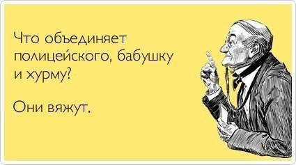 9 июня 2015 Муж возвращается домой после работы, на столе записка: "Дорогой, я ушла к подруге, на ужин рыба, удочка в коридоре." Если посадить один саженец, то будет больше на одно дерево. Если посадить одного лесоруба, рубящего незаконно, то будет больше на сотню деревьев. А если посадить одного чиновника, позволяющего рубить деревья незаконно — будет больше на тысячи деревьев. Сажайте правильно! С Крымом вроде уже все понятно. Другое интересно: когда Москва русским вернется? irinka-mandarinka, VitaVivien, aleksaA и 9 других сказали спасибо Поделиться сообщением Ссылка на сообщение