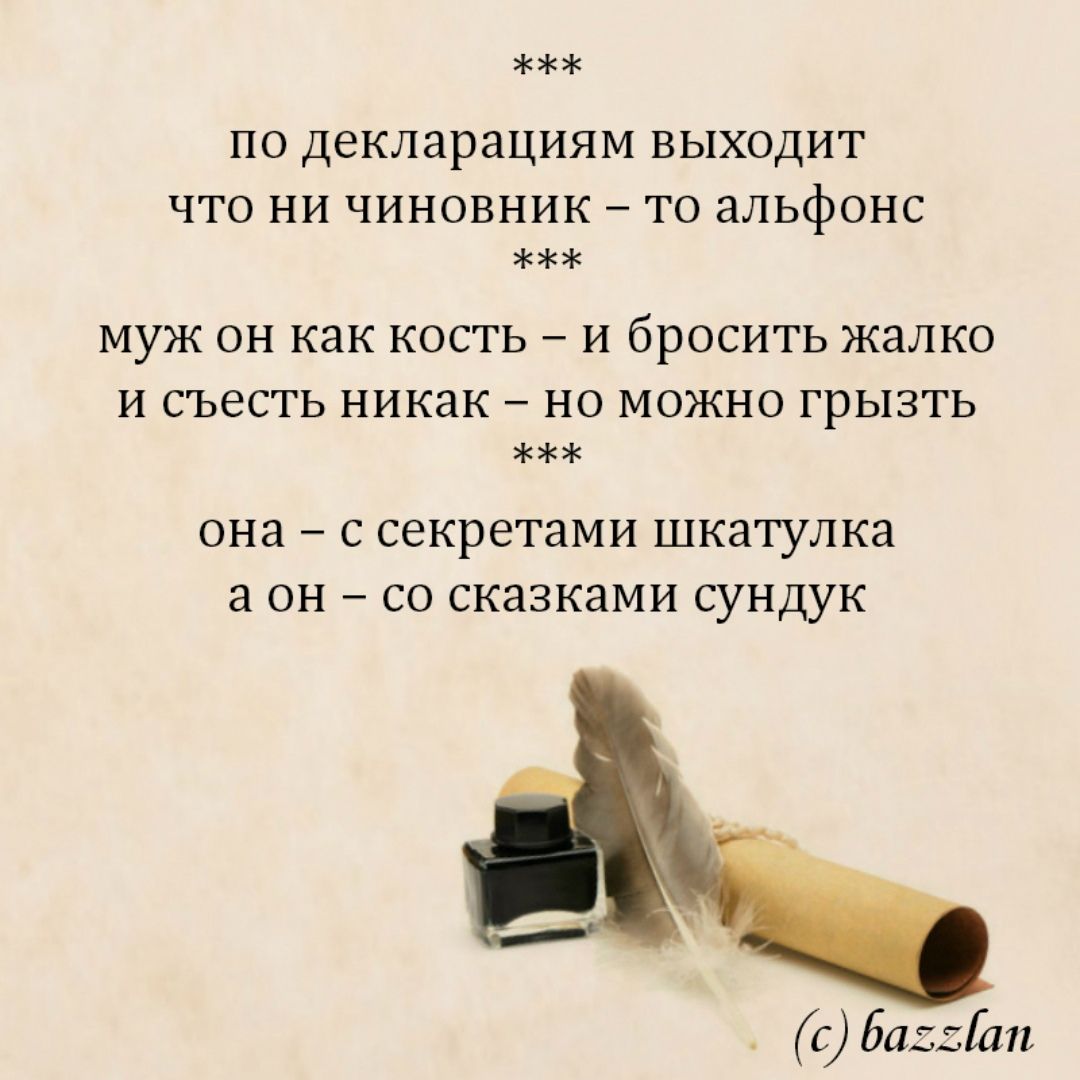 1 ноября 2019 *** Таксисту, нашедшему забытые в салоне документы с грифом «совершенно секретно», предлагается застрелиться самому. *** Хочу познакомиться с женщиной. Больше о себе ничего сказать не могу. ***. Собака, натасканная на наркотики, в аэропорту "Внуково" несколько раз взглядом давала понять пассажиру из Голландии, что дело можно уладить килограммомг! овядины. *** Вашими бы устами да помолчать *** У каждой женщины помимо ребёнка, которого она родила, есть ещё ребёнок, которого родила свекровь! *** - Ну что, по чуть-чуть - и за работу?! - Не-не-не!! За работу - по полной! *** Время не терапевт, время - анестезиолог. *** Грешившие россияне после смерти попадут снова в Россию. *** Бедность не лечится. Доказано бесплатной медициной. *** Глупый лентяй изобрел колесо, умный лентяй – диван. *** Сексуальные революции проходят без жертв. Жертвы рождаются после. *** Воспринимай критику окружающих с высоко поднятым средним пальцем. *** Жизнь нужно прожить так, чтобы об этом знал Google....и не знал YouTube. *** Плохо, когда смеются над мужчиной... Еще хуже, когда смеются под ним! *** Пропала собака! Очень умная! P.S. Шарик, если ты читаешь это сообщение—отпишись мне на e-mail, дети переживают ! *** Останавливает гаишник машину, а за рулём—собака. На заднем сиденье сидит мужик. Гаишник: — Мужик, ты что вообще с ума сошел, собаку за руль посадил — А я здесь при чём!? Я проголосовал, она остановилась... *** Скоро техника дойдёт до такого совершенства, что человек сможет обойтись без себя. *** Вышла новая книга Дэйла Карнеги «Как избавиться от друзей, приобретённых с помощью моей предыдущей книги». *** Термин <чёрная дыра> американцы посчитали неполиткорректным и предложили заменить на <афроотверстие>. *** Товарищи, имейте же совесть! - А что, по-твоему, мы с ней делаем? *** Жители метеорита с ужасом наблюдали приближение Челябинска. *** Фирма ищет нового бухгалтера! И старого тоже ! *** Интим не предлагать! Но не терять надежды. *** Если женщина с недоуменным выражением лица обмеряет себя рулеткой в разных местах и периодически радостно вскрикивает "Не может быть!", значит, она по ошибке. взяла рулетку с дюймовой шкалой. *** Если на празднование 25-летия окончания школы вы решили собрать одноклассников, вам нет необходимости разыскивать их всех. Найдите одного - последнего двоечника и хулигана, а он по своим депутатским каналам найдёт всех остальных. *** С вас штраф 200 рублей за оскорбление сотрудника полиции!!! - Возьми тысячу и слушай дальше... *** Очень полезный совет мужчинам: Если ваши глаза закрыли мягкие ручки, в спину уперлась пышная грудь и пухленький животик, а сзади послышалось: «Отгадай кто?»... В любом случае отвечайте: «Серега, ты что ли?». Поверьте, так будет лучше . *** Вышла версия Камасутры для евреев.На всех картинках присутствует МАМА и таки даёт советы. Фро-J, Majena, nogres и 28 других сказали спасибо Поделиться сообщением Ссылка на сообщение