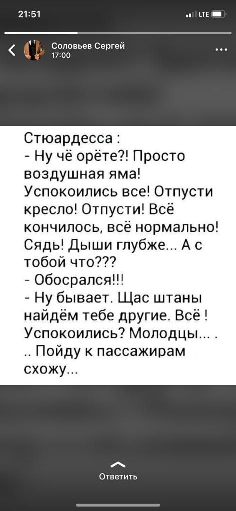 9 июня 2021 ***** Продолжают поступать тревожные сообщения о побочных эффектах вакцины Sputnik V. На этот раз беда случилась с 40-летней женщиной-врачом. Через неделю после 1-й прививки от нее ушел муж к 25-летней сестре. Прочитав это сообщение, сантехник Михалыч привился 3 раза... Но жена так и не ушла. ***** VID-20210601-WA0008.mp4 Юла, alen_73, reyjeff и 22 других сказали спасибо Поделиться сообщением Ссылка на сообщение