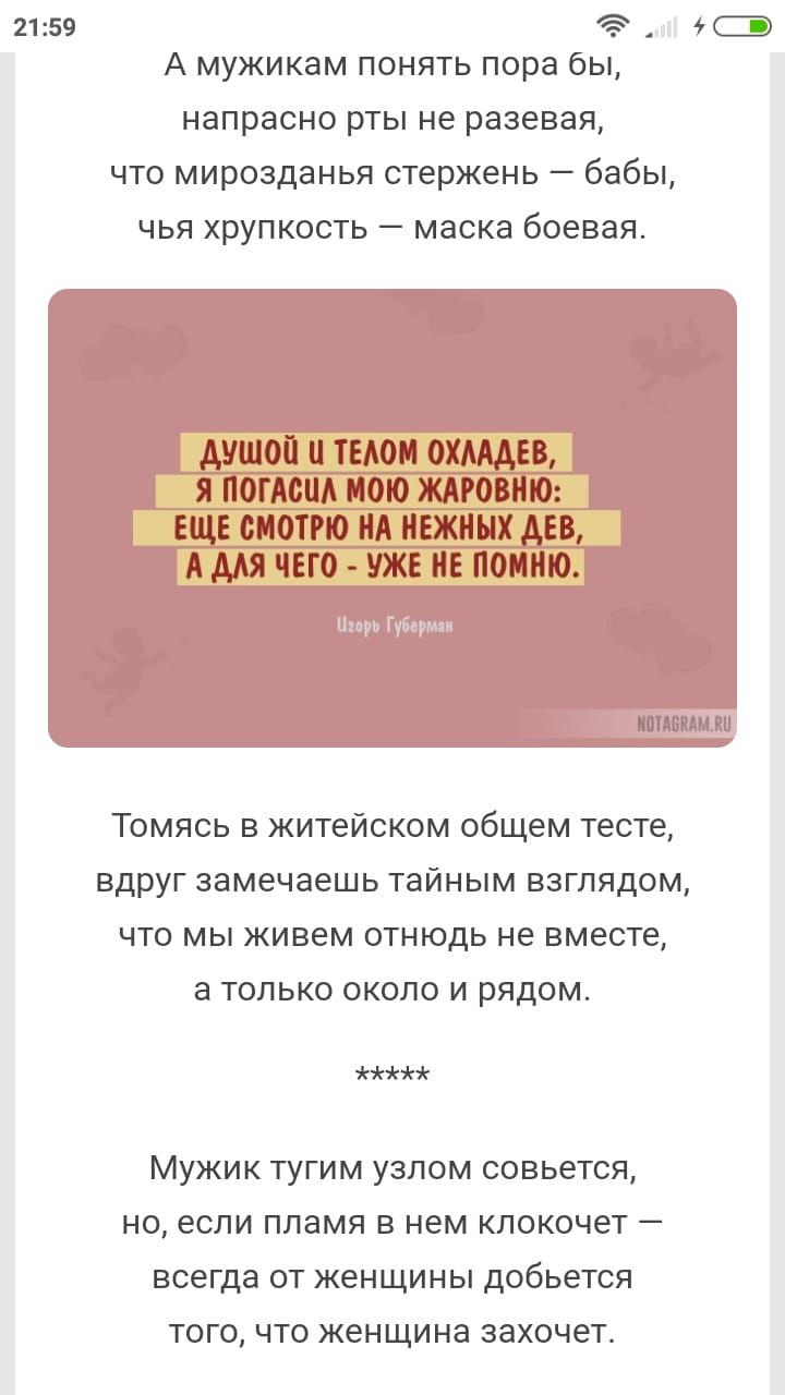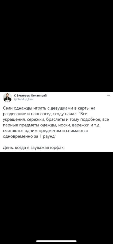 11 февраля 2022 Немного свежего Полякова: зарос укроп весь коноплёю теперь не знаю что полоть чтоб город стал ещё нарядней мы свёклой кормим голубей без водки в гости мы не ходим а с водкой смысла нет идти обычно первым засыпает тот кто сильнее всех храпит как ни забавно но вначале вы умным показались мне проснувшись рвусь одновременно и в туалет и в интернет он слыл сантехником от бога но этим богом бахус был да как же в питере лукашин подъезд с парадной спутать мог? шагнули цены за «однако» почти достигнув «охренеть» муж опекать супругу должен её задача – допекать нет - про политику не будем а то не хватит литра нам о пользе пальмового масла расскажет нам мутант петров да - русский человек талантлив к тому же если он еврей во время первой брачной ночи сатирик испытал сарказм не откажусь – сказал дедуля услышав слово «инстаграм» наш шкаф похоже заразился чихнул под вечер пару раз когда есть счётчик трехтарифный ночами выгодней сверлить аркадий кроме удовольствий себе отказывал во всём зачем мне спящая царевна? да я её в гробу видал пятёрки исправлял на двойки настырный школьник-мазохист к зиме она из кожи лезла чтоб поскорее влезть в меха жевал шашлык ещё бы долго но вспомнил – маску надо снять ведь всё равно цирроз угробит тех кто ковид переживёт смешно что интернет придуман чтоб время экономить нам а идеального мужчину пришлось самой себе рожать и приласкать умел он матом и объясниться мог в любви смотреть на это всё противно но поучаствовать не прочь а мы себя ещё покажем сказал эксгибиционист хочу в разлуке потомиться давай проваливай скорей мэр видно честен -даже перстни это обычное тату какой подонок на спектакле суфлёра в будке щекотал? муж закатил скандал сегодня грозился что к отцу уйдёт спасибо за вчерашний вечер так классно что ты не пришла когда помойку увозили бомж закричал – я разорён и было знанье мифологий моей домокловой пятой привёз жену из таиланда теперь лечу ей простатит она разделась и сказала ну что? -уламывай давай пока он был в командировке ей пару раз пришлось скучать а вот в палате геморройных сегодня ужин при свечах закончив курсы оригами он лихо скручивал косяк а ты и правда сильно хочешь? спросила мужа разбудив за двойки ставим сына в угол где хуже ловится вай фай танцора из меня не вышло могу причину показать для дураков есть телевизор для шибко грамотных - омон хоттабыч двадцать раз на матче случайно шлюху вызывал по кучам у дверей сортира я понял - нужен куар код рамзес от кариеса помер ведь моисей увел врачей с гаранта толком и не спросишь ведь гарантийный срок истёк соседка ночью позвонила спросила - не нужна ли соль земля кругла – сказал джордано на чём серьёзно погорел портрет раскольникова нужен на входе в пенсионный фонд застой мы пережили как-то ну и отстой переживём ушли с соседом в партизаны взяв самогон и огурцы поведал дед что мол в россии другой был раньше президент на память женщине любимой зэк фоторобот свой прислал как точно будущее наше малевич нам нарисовал по данным переписи вышло что печенегов пол страны механик убедил блондинку что масло в шинах поменял от неудач и от ошибок меня всегда спасала лень пришли наследники с прогулки и наследили на ковре ответь мне откровенно –любишь? или насильно милой быть? ты нарядилась так как будто возглавить хочешь бунт крестьян в конце 