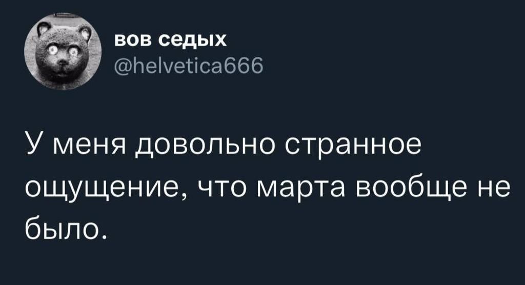 13 апреля 2022 1 час назад, Tatiana Ch. сказал(а): Совсем не смешно Это вы про мой пост или про настроение в целом? Iharu сказал(а) спасибо Поделиться сообщением Ссылка на сообщение