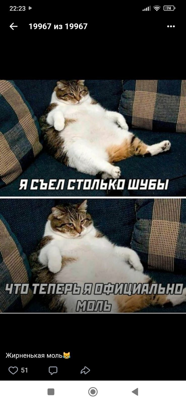 17 января 2023 1 час назад, starcat сказал(а): VID-20230117-WA0002.mp4 Моя первая кошка любила гулять на балконе. Началась зима, снег ровным слоем покрыл перила и пол. Кошка подошла к двери и начала мявкать - откройте, мол, люди добрые, гулять желаю! Мы открыли. Кошь встала передними лапками на снег, нюхнула пару раз воздух и... ломанулась обратно домой - нагулялась lamina-65, Gerlada, lovingberry и 12 других сказали спасибо Поделиться сообщением Ссылка на сообщение