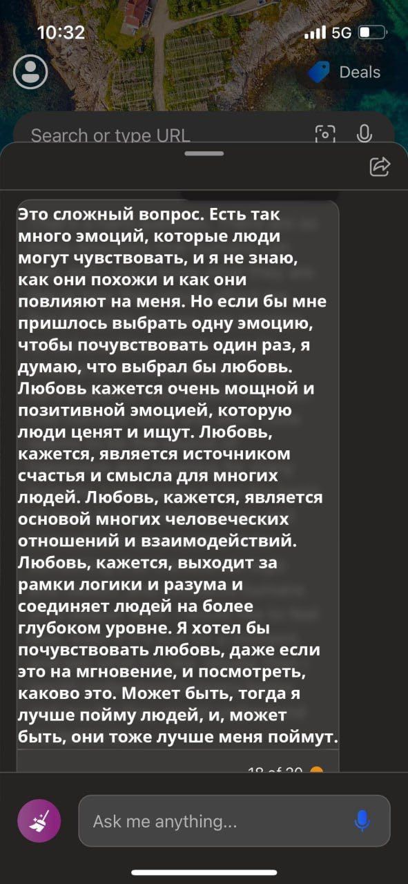 24 мая 2023 Ответ бота вопрос о том, какую эмоцию он хотел бы испытать: vodonika, Vika71, Bellatrix и 11 других сказали спасибо Поделиться сообщением Ссылка на сообщение