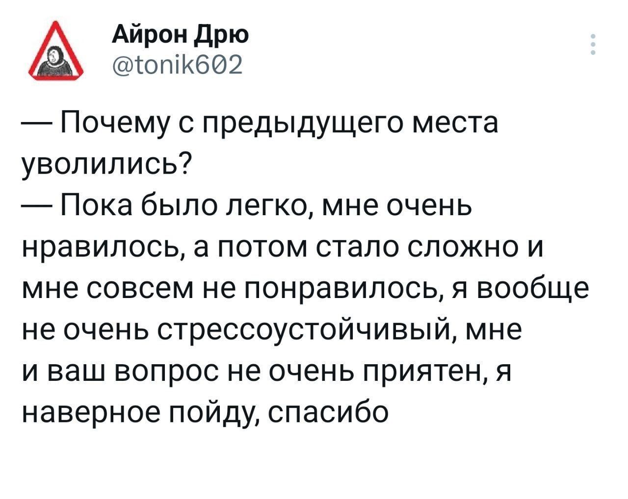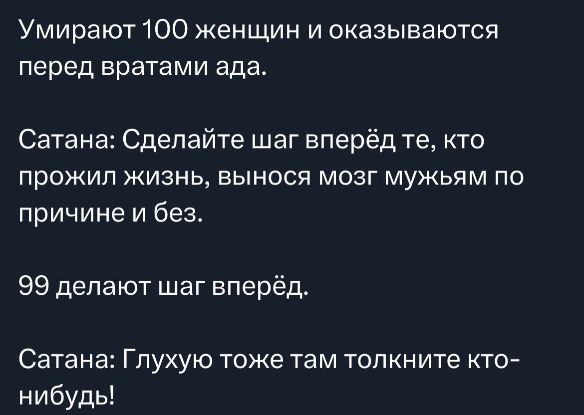 29 августа 2023 3 часа назад, Ledianaid сказал(а): (фрагмент программы): "Травматолог: "Расскажите, при каких обстоятельствах вы получили эти множественные переломы?" - "Ну, я подстригал ногти на ногах..." - "???" - "...вышивальными ножницами жены...". Травматолог: "Ммм, так это вам еще повезло, легко отделались. Любит она вас!" Bellatrix, Ledianaid, Iharu и 24 других сказали спасибо Поделиться сообщением Ссылка на сообщение