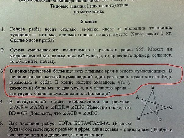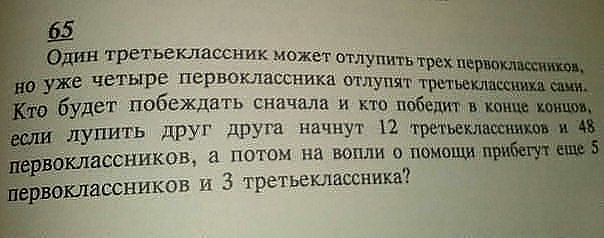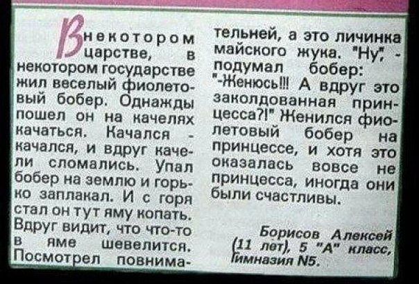 12 декабря 2012 а я бы еще и учительнице 2 поставила. НЕ перевеЗти дух,а перевеСти.*хотя может и пожалела и так ошибок завались* Верунь, а я б не была так категорична. Видимо, учительница была *пацталом* от такого сочинения ))) Я тоже, бывает, замечаю пропущенные ошибки у нашей учительницы. Но отношусь к этому лояльно. Ибо это могла быть у нее как раз 28-я тетрадка из 29. И глаза уже замылены. Да и каждый раз как вижу, сколько отчетов она пишет и сколько статистик заполняет, волосы дыбом. Учить детей некогда. Бывает даже в 20.00 свет в кабинете включен. Поделиться сообщением Ссылка на сообщение