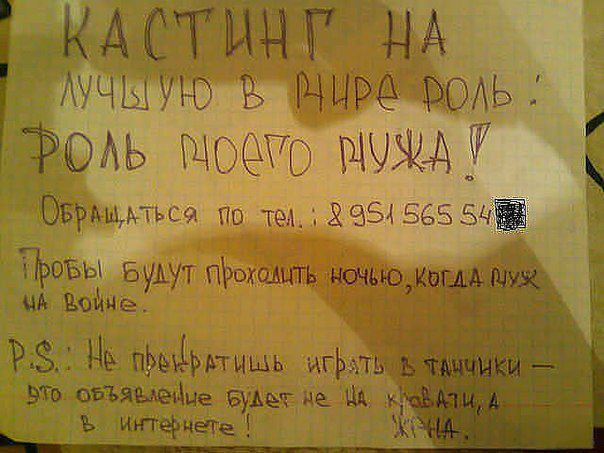 10 января 2013 Звонит телефон.Хозяйка снимает трубку: -Алло! -Скажите,я с вами по телефону говорю?-спрашивает заплетающимся языком мужской голос.. -Нет,бл...По телевизору! -Ёёё..Прямой эфир,а я в трусах! реальная история. когда-то давно я работала в службе поддержки одного известного всем сотового оператора. часто, самых прикольных выводили на громку связь. у многих специалистов в линии слух обострялся настолько, что они слышали многие вещи, на которые обычные люди внимания не обращают. такой диалог у коллеги состоялся: звонит женщина. что-то начинает быстро говорить, спрашивать. мой коллега отчетливо слышит, как у нее закипает чайник, и говорит ей, чтобы разнообразить общение: отойдите, пожалуйста, от чайника. на что женщина начинает в параллель орать своему мужу: Вася!! быстро принеси мне халат!!! они нас видят!!!! весь отдел рухнул Vestenra, Валерия, Лена1973 и 14 других сказали спасибо Поделиться сообщением Ссылка на сообщение