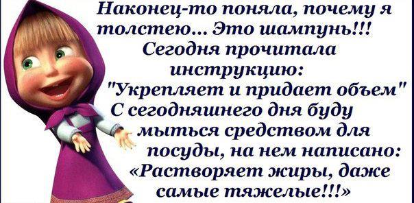 28 января 2013 Плохая новость: в 2013 году каждая пятница будет пятница тринадцатого. Если ты живёшь в России - значит, при рождении ты выбрал сложный уровень. Жизнь после пятидесяти только начинается... - подумала женщина и попросила налить еще пятьдесят... Если при изготовлении суши вместо рыбы взять мясо, а вместо риса - тесто, то получатся пельмени. - Вовочка, ты кого больше любишь: папу или маму? - У нас в семье все по-другому: папа любит маму, а я не вмешиваюсь.( знаю, что старый анекдот, но очень его люблю) dolli7, Sweta, pifiya и 9 других сказали спасибо Поделиться сообщением Ссылка на сообщение