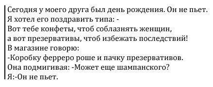 1 февраля 2013 — Алло! Сашу можно? — Он спит. — Если проснется, скажите, что Вова звонил. — Что значит "если..."?! Быть мальчиком — вопрос пола. Быть мужчиной — вопрос возраста. Быть джентльменом — вопрос выбора. Быть мудаком — вообще не вопрос. Загадочные все-таки девушки существа - то банку с помидорами открыть не могут, то после трех рюмок пиво глазом открывают. Тот, кто видел срач в моей комнате автоматически переходит на следующий уровень дружбы. Сантехник Сидоров дунул на торт, и свечи загорелись! Насмотревшись фильмов для взрослых, сантехник Сидоров подал заявление о переводе в мюнхенский ЖЭК. - Мамаша, скажите своему сыну, чтобы он меня не передразнивал! - Вова, перестань корчить из себя идиота! Она была настолько верной женой, что не давала даже мужу! В пищевой промышленности Советского Союза тоже применялись усилители вкуса. Они назывались "дефицит" и "очередь". - Девушка, кем это вы себя мните? - не ваше это дело, кем я себя мну! Лена1973, irina.butarova@yandex.ru, чеба и 7 других сказали спасибо Поделиться сообщением Ссылка на сообщение