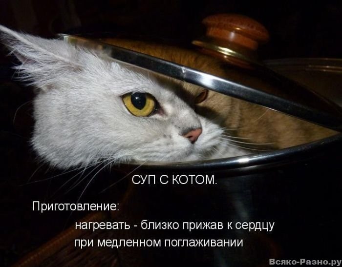 8 февраля 2013 А вы заметили, что самые ужасные слова заканчиваются на"-льник": начальник, будильник, понедельник? Настоящий интеллигент никогда не скажет - "как была дура-дурой, так ею и осталась", он скажет - "время над ней не властно". Не расстраивайтесь, если вас жутко тянет жрать в темное время суток – может вы просто жрица ночи! Пришёл в гости, приняли как родного: покрыли матом, отправили в магазин за хлебом, а потом заставили мыть полы. Говорят, если съесть шоколадку - сразу поднимется настроение. Но если ещё и шампанским запивать, эффект будет намного выше! Успешно продается новая модель мыши для компьютера - с открывашкой для пива - Скажи, великий князь, а почему тебя называют Владимир Ясно Солнышко ? - Та–а–ак… Чтобы сегодня ночью как штык была у меня в опочивальне. Ясно, солнышко ? Чтобы капусту не погрызли зайцы, её рекомендуется выращивать на открытой, хорошо простреливаемой местности. Ищу спутника жизни для своей тещи. Она: шумная, вредная, наглая. Он: подлый, безжалостный... Rina, Lapyshok, vishivka и 14 других сказали спасибо Поделиться сообщением Ссылка на сообщение