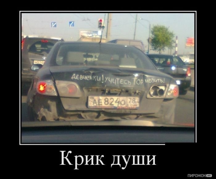 15 февраля 2013 Ситуация на перекрёстке. Далее со слов очевидца... Стою на перекрёстке в знойный летний день. Окна настежь. Ситуацию разруливает одиноко стоящий по середине дорог ГАЕЦ. Скука. Вдруг с визгом, мне на встречу летит мерин, с красивой блондинкой за рулём. Милая мадам оттормаживается с дымом от колёс, заметив чудом данного "специалиста по организации движения во всех направлениях"и с жалостью в голосе и лёгким негодованием произносит феноменальную по сути фразу: "Да ты чё, ох@ел, тя ж здесь кто нибудь собьёт". И дав такое грамотное резюме срывается с места и уходит в точку. ГАЕЦ секеунд 40 не мог рот закрыть, после чего, опомнившись начал дуть в свисток. Я думал он его надует... Из объяснительной в отделе кадров: Я, М*****на Ирина, , работающая в ООО "М****с" кассиром, 01/08/12г. вовремя не пришла на работу т. к. нарощенным ногтем правой руки случайно оторвала при умывании нарощенные ресницы правого глаза. У меня есть знакомая, так она водит следующим образом - когда подъезжает к нерегулируемому перекрёстку, говорит страшное заклинание - "Чур, я на главной! " - и едет. Странно, но за три года ни одного ДТП. - А я одной знакомой девушке однажды показывал брелок автосигнализации с обратной связью, когда только они появились, где машинка на таком экранчике нарисована. Я и говорю - вот смотри, когда дверь открыта - вот тут на экранчике дверца мигает, когда машину заводишь - вот тут такие облачка из машины идут, типа она работает. А девушка смотрела, смотрела, и говорит: А когда машину угоняют, она с экранчика уезжает, да? Sweta, bakino4ka, Татуся и 11 других сказали спасибо Поделиться сообщением Ссылка на сообщение
