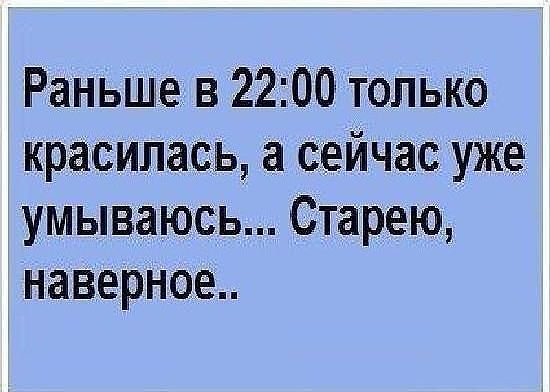 21 февраля 2013 забавная реклама Жена мужу: - Зря мы с тобой ругали дочь за пирсинг. Теперь, когда у нее кольцо в носу, поднимать в школу ее стало намного проще. Я - взрослый, состоявшийся мужчина, и мне нужен этот радиоуправляемый вертолет! Молодая мама перед 1-ым сентября: - Уф-ф-ф, вроде бы всё для школы купила: букварь, тетради, ручки, валерьянку, ремень... Димa выкуривал 20 сигарет в день, Коля выкуривает 15. Вопрос: не настораживает ли Колю, что о Диме говорят в прошедшем времени? Как сделать недорогой, но оригинальный подарок шефу на 23 февраля: купите тест на беременность, аккуратно нарисуйте 2 полоски, положите ему на рабочий стол с запиской "Угадайте кто?" Татуся, bakino4ka, Ёла и 11 других сказали спасибо Поделиться сообщением Ссылка на сообщение