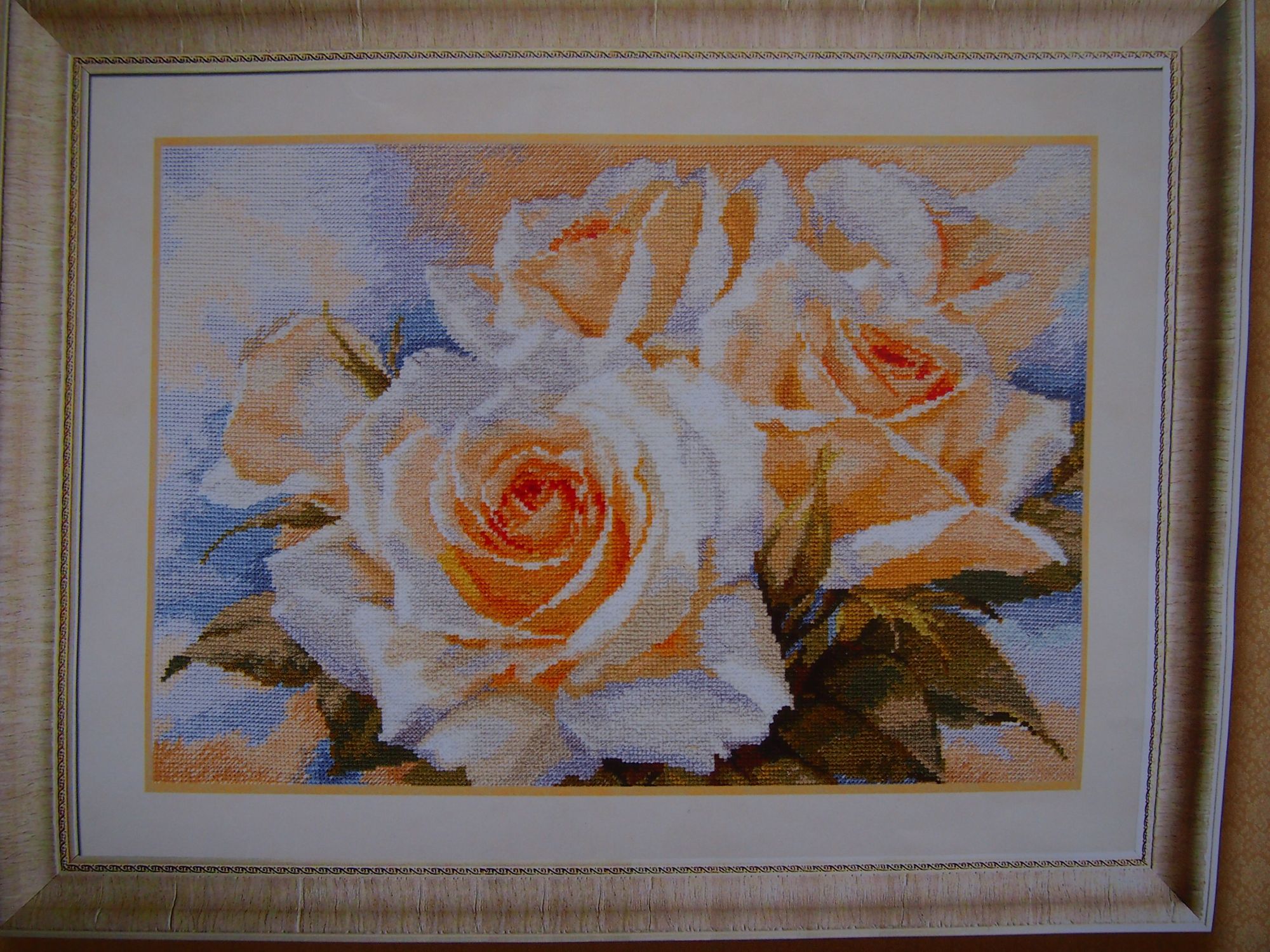31 августа 2017 Всем большой привет! Решила не ждать 1-е число, а показать, что навышивалось. Завтра начало учебного года и чувствую, что времени на вышивку станет в разы меньше, т.к. мой сынуля кажется забыл за лето все Я начала новый процесс в пару к Белым ирисам. Конечно это Белые розы. Хоть эти розы я думаю всем давно знакомы, все же напомню, что должно получится и что навышивалось за неделю. Алиса 2-32. Ну и конечно хочу поделится впечатлениями. Сначала о хорошем. Схема, как всегда у Алисы - отличная. Крупная, понятная, легко читаемая. Нитки по качеству значительно лучше тех, что были в Ирисах. А теперь немного поворчу. Вышила я быстренько уголок полукрестом. Ушла недалеко вверх, потому что очень хотелось самой изведать, что за зверь такой - "чудесатые" крестики, где нижний стежок вышивается одним, цветом, а верхний - другим. Ну что я могу сказать - мне совсем не понравилось. Лично для меня вышивать неудобно, отсюда - долго. Плюс как я не стараюсь, крестики получается далеко не такие ровные, как обычные крестики. Вот посмотрите на крайний лепесток в серых тонах рядом с листом - в нем 10 (!)разных значков, включая 5 этих самых крестиков, от серого до белого. Фото не для гаечки!!! Вы видите 10 оттенков? Я - нет. На мой взгляд слишком много усилий для такого не очень впечатляющего результата. А еще я заметила такую странность - нитки одинаковой длины, но при этом у меня получается на 8-10 стежков больше при вышивании нижних полукрестиков, чем при вышивании верхних И скажу честно, пока я не дошла до яркой сердцевины, мне совсем не нравилось, что получается. Но теперь все стало на свои места и мне уже нравится и хочется вышить побыстрее, чтобы вместе с Ирисами оформить одинаково и подарить дочке, а то она все жалуется, что стены у нее голые. Всех с наступающим началом нового учебного года! Детям - легкой учебы и отличных оценок . Мамам - терпения и понимания!!! ОльгаВл, Кисуля, olnikva и 27 других сказали спасибо Поделиться сообщением Ссылка на сообщение