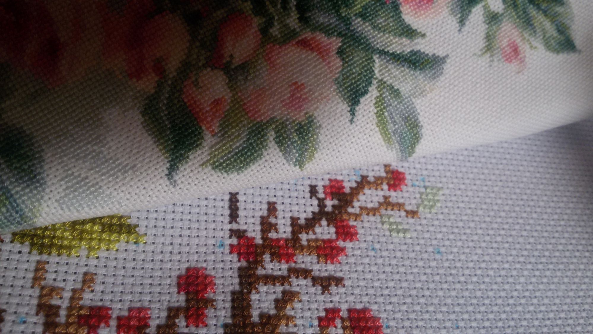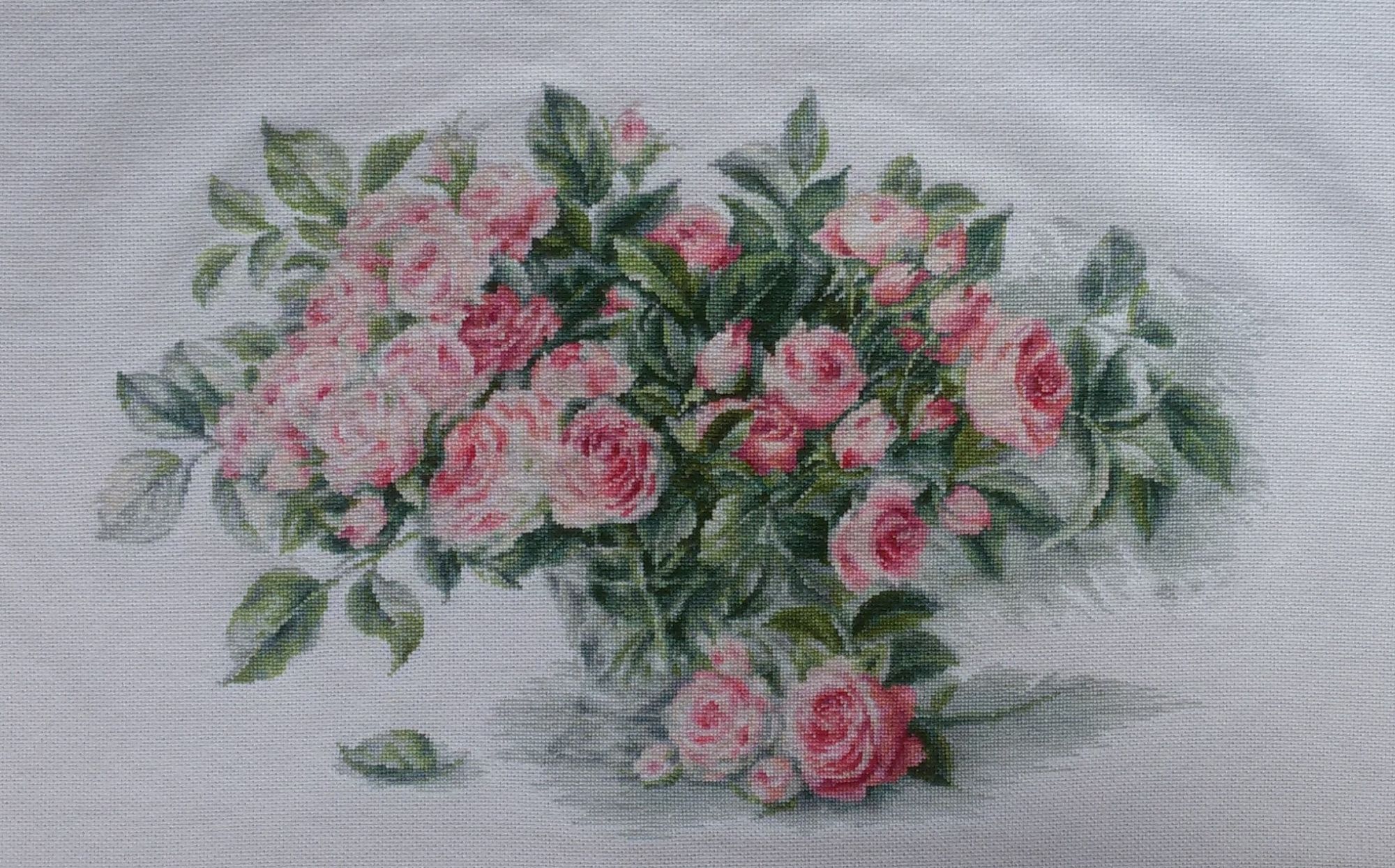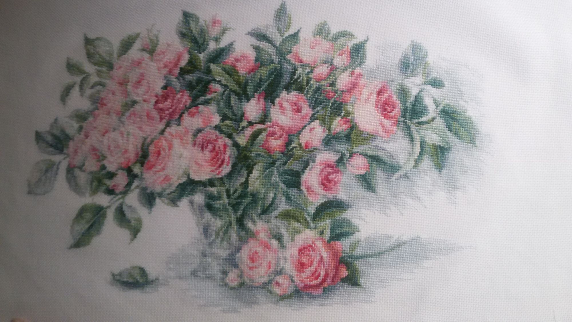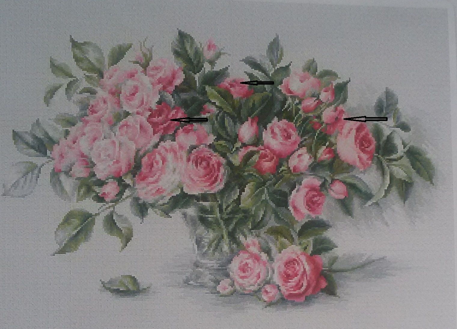 9 июля 2016 А я Лукасины розы притащила! Все-все, до последнего цветочка и листочка! первое - при солнечном, второе - при электрическом свете Эмоций нету, только осознание - я ЭТО сделала! Ощущения? Сложно, крайне сложно. 1. Очень мелко, в одном кв.см 100 крестиков (для сравнения - на аиде 14 всего 27 крестиков) Если бы этот дизайн был на аиде 14, то размер был бы 62*40см. То, что шьется не через 2 нити основы, а через одну, для меня оказалось полной неожиданностью. Считаю, что производители должны о таких "особенностях" на обложке и в рекламных проспектах упоминать. 2, Много цветов с практически незаметными отличиями по оттенку. Когда оставляешь хвост нитки на вышитом, потом опознать его крайне трудно, пришлось "изобретать" мобильную систему идентификации. 3. Очень много вышивается крайне светлым, практически белым по белому. 4. Схема - прыжки бешеного зайца. Практически все - по 3-5-7 крестиков и больше этого цвета поблизости нет. Островки в 30-40 крестиков - редчайшее явление. Качество набора - отличное. Нитки вели себя примерно, хватило их с хорошим запасом. Стирку пережили хорошо, никаких намеков на линьку не обнаружено. Схема черно-белая символьная, очень комфортная для глаз, на 8 огромных листах. К концу отшива внутри меня окончательно созрело ощущение некоей халтурности дизайнера. Как будто один листочек зачищали до полного правдоподобия, а соседний оставили как есть после обработки программой. Должна сказать, что снизу вверх и слева направо (направление, в котором я шила) концентрация этих мелких халтурок растет, например, кусок листа на заднем плане частично перекрывает лист переднего плана. Не исключено, что я придираюсь. Но проживая и общупывая каждый крестик этих роз , очень часто возникало непонимание - почему так? Самые нелепые я убрала Вот показала стрелками - на лепестках, где ну никак не должно быть зеленого, откуда-то темные зеленые пятна. Я их заменила хоть и тоже на серо-зеленый, но гораздо более светлый. Вобчем, ощущения сложные. Советовать хомячить не буду, ну, если только у вас орлиное зрение и адово терпение. А я молодц! Медаль мне во всю хрудь! solnishko-ym, bukina88, Каори и 52 других сказали спасибо Поделиться сообщением Ссылка на сообщение