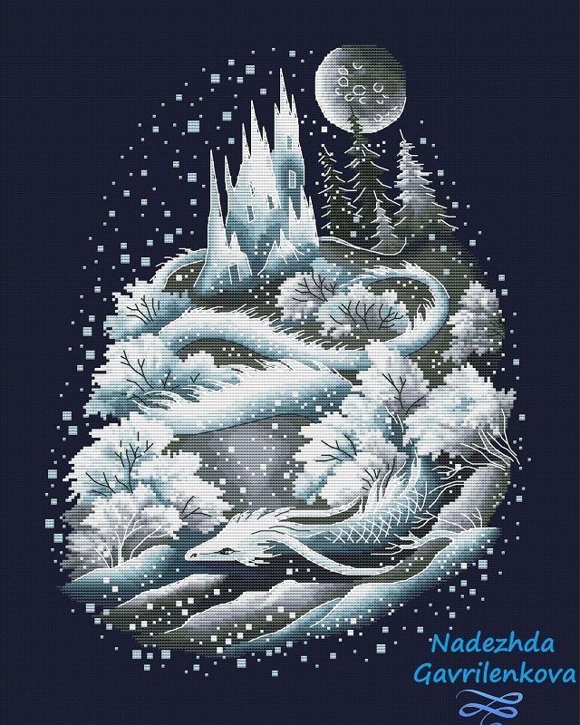 8 февраля 2020 Я сегодня с обещанным новым процессом. Предыстория. Довольно давно сын заказал мне дракона. Причем с суровыми условиями - чтоб дракон был серьезный, не мультяшный и не восточный, а европейский (то есть тело не змеи, а ящера). Неоднократно были пересмотрены базы наборов и схем и забракованы ВСЕ драконы, включая Химерины. В результате за два года подходящего дракона так и не нашлось, и тут я ему отправила очередную порцию картинок. И каково же было мое удивление, когда тот выбрал таки, практически мгновенно. И хотя дракон таки оказался восточным, мне было сказано "одобрямс". Дизайнер Гавриленкова Надежда Ледяная драконица (только не говорите заказчику про гендерную принадлежность заказанного ) Размер 167х217 крестиков, 17 цветов+ 4 бленда из них. В качестве основы выбрала черную аиду 14-го каунта. Любой другой цвет предпочла бы равномерку, но черный просто не потяну. Дизайнер предлагает несколько вариаций блестящих ниток, У меня запланированы крейник, ДМС Диамант и этуаль, но не исключаю, что по ходу что-то и переиграю. Что имеем на момент отчета Шьется отлично, схема очень вменяемая. Пока еще не приспособилась укладывать ДМС диамант, он скорее мягкая проволока, чем нитки. Но смотрится очень интеллигентно, поблескивает затаенно, а не светит в глаз галогеновой лампочкой. И в целом дизайн нравится своей торжественной сдержанностью, благородными серыми и сиянием белого. Засим отчет считаю состоявшимся. Овен шила, но не сфотографировала, поэтому в следующий раз. vasileva70.vika, АриЯ, Хельга и 46 других сказали спасибо Поделиться сообщением Ссылка на сообщение