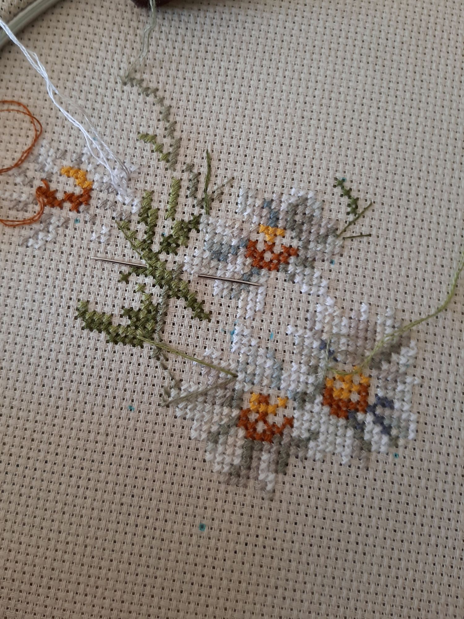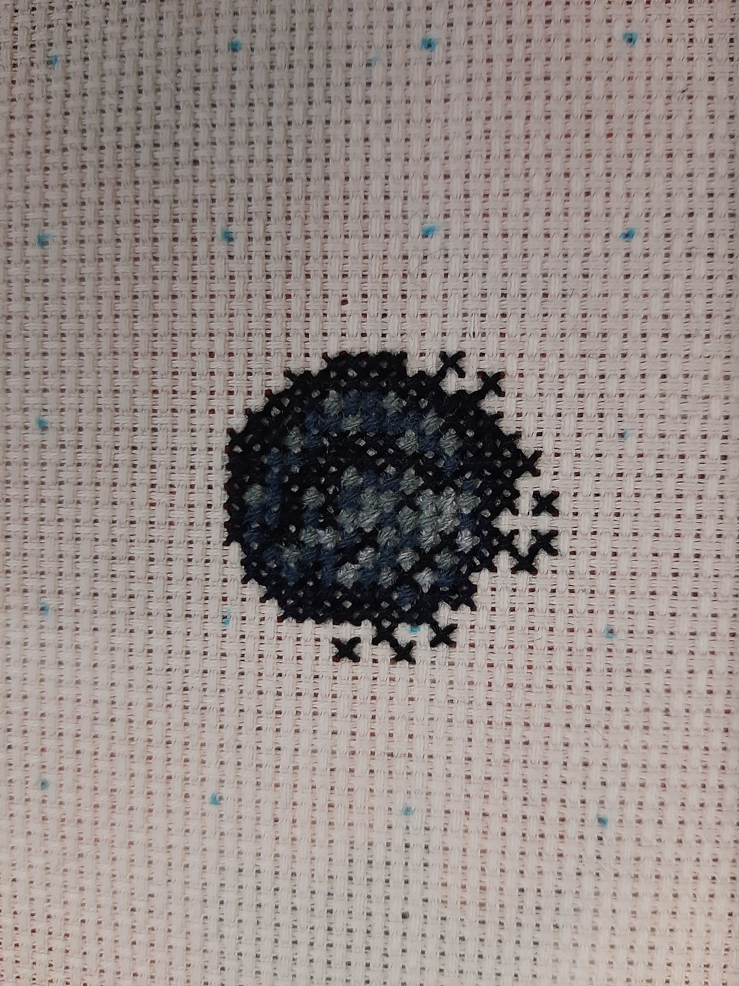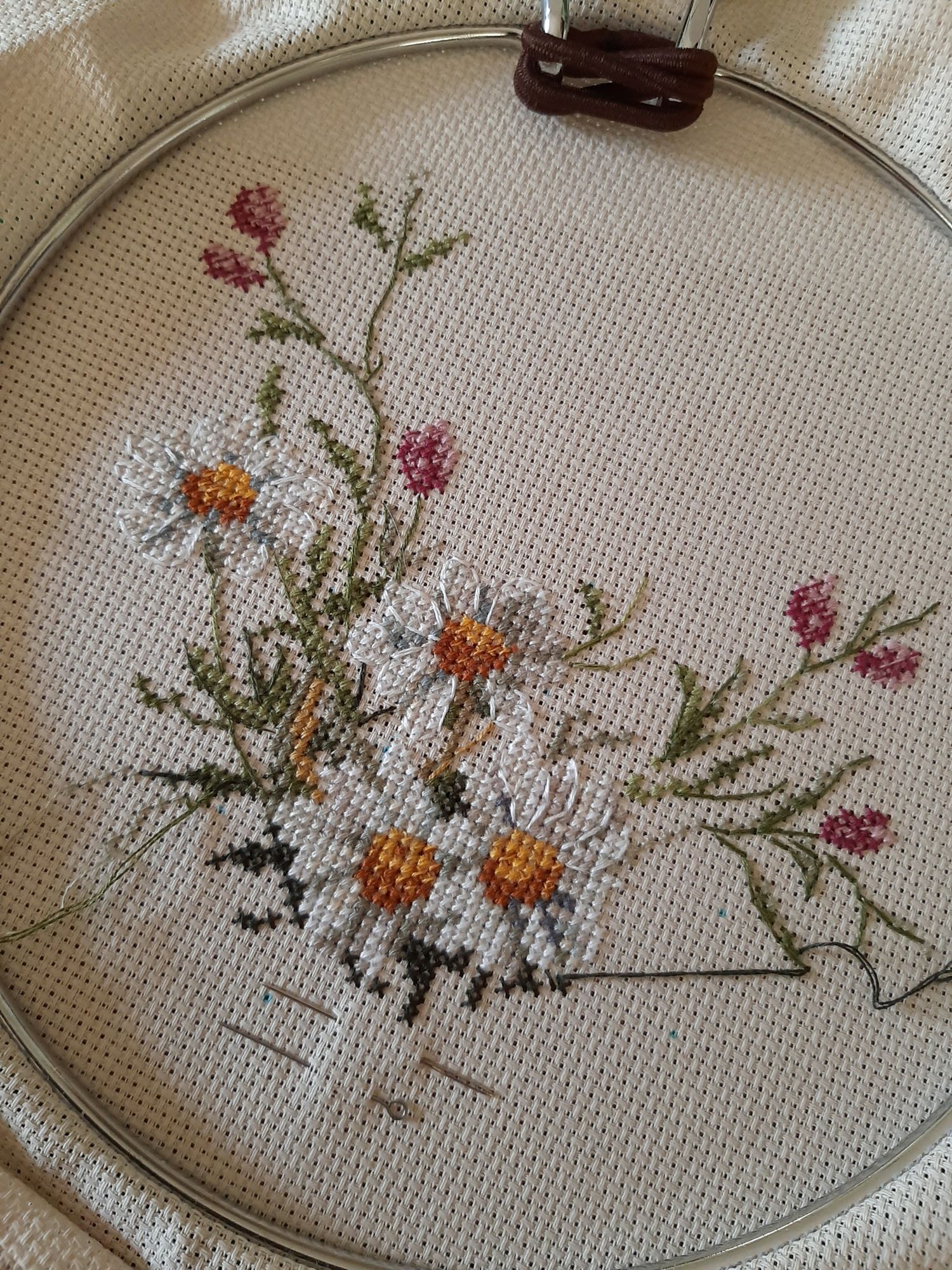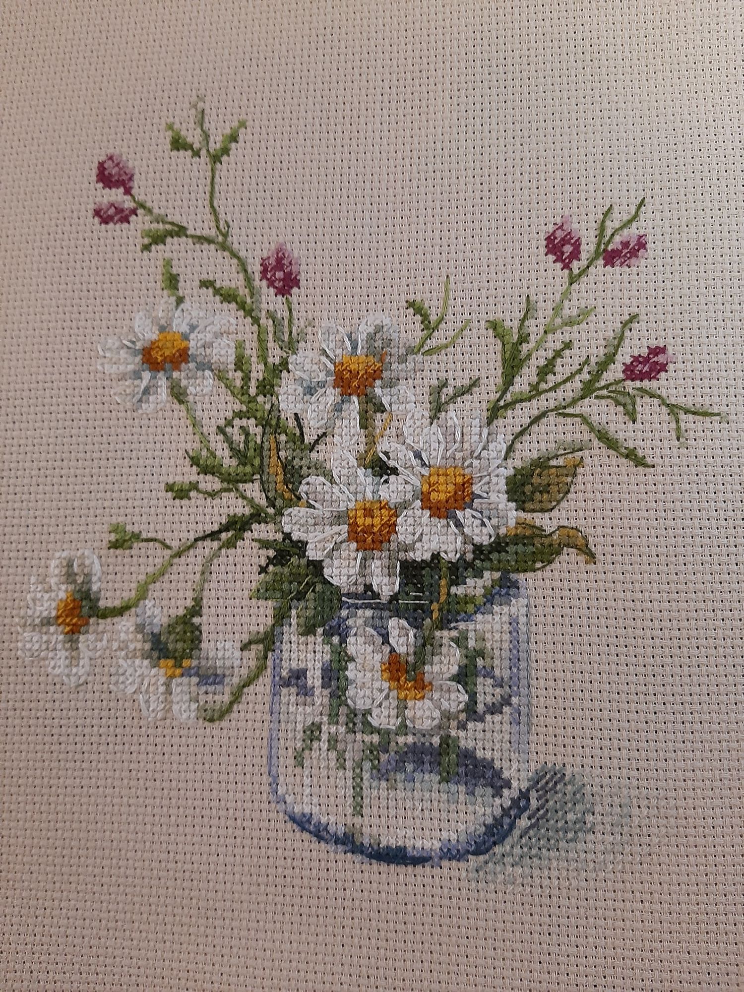1 августа 2020 Забавный парадокс вышивки – если пропустить еженедельный отчет, то почему-то следующий отчет оказывается обширным и разнообразным. Сегодня минус 2 плюс 1. То есть два процесса завершенных и один новый. Кто хотел злобную МарСанну? Нате! Итак, распил разбор набора РТО Хотела тетенька отдыхалочку и выбрала простенькую миленькую картинку от проверенного производителя. Что я попала, я поняла в момент распаковки. 32 цвета ДМС плюс 8 блендов. 55 символов. Бэк в 17 вариантах - варьируются цвет и сложение нити - от 1 до 3. Я готова шить нечто заморочное, если на выходе получу результат, который будет если не поражать, то хотя бы вызывать восхищение. Я готова шить простенькое, не ожидая воплей «вау» от полученного итога, но только если я не стану затрачивать на это несоразмерное количество времени, энергии и мозгов. Тут сошлось – заморочки сорокового уровня и миленький, но весьма простенький результат. Я считаю, что дизайнером использовано: избыточное число оттенков. Нет претензий к изображению стеклянной банки, но в крошечных зеленых листках, которые все состоят из двух десятков крестиков, использовать 10 цветов, из которых 2 бленда, нерационально. непонятная мне работа с оттенками. При использовании в ромашках комбинации белого с голубым, серым, желтым, розовым, зеленым оттенков добились только того, что ромашки получились чумазым. чрезмерное увлечение блендами. Я всегда за бленд в качестве инструмента создания перехода или эффекта пестроты, как например, в желтых сердцевинках ромашек, но когда бленд и исходные для него цвета очень близких друг другу оттенков и при этом насыпаны хаотически, не вижу в этом смысла. бэк мимо клеток. Практически полностью. Основная часть бэка обозначена полупрозрачными линиями и когда привыкаешь к тому, что символы под бэком видно, внезапно натыкаешься на линю, под которой, оказывается, прячутся три крестика (цветом, который ты естесстно, давно вышила и закрепила). равнодушие к удобству вышивальшицы. Например, крошечная веточка – 3 крестика одним цветом, 2 вторым, 2 третьим. К этому 3 стежка бэка вторым цветом и 2 – четвертым. И все это в разных вариантах сложения нити. И все это надо как-то крепить. Я шпарила в одну нитку, проходя два раза крестики и стежки, которые надо в два. И все это не подряд – дошил нитку и отрезал. Тут почти все приходится бросать недошитыми, потому что надо всунуть парочку другого цвета. Уж на что я любитель оставлять хвосты рабочих ниток, но борода такой густоты у меня бывает редко. А потом чешешь репу, какой хвост к кому относится – они все, например, зуленые. Ситуацию усугубили вышиваемые мной параллельно Тея -квинтэссенция простоты и удобства при замечательном результате – и Хью – изумительная работа с цветом и виртуозный крайне легкий в исполнении. В схеме есть ошибка – символ, которого нет в ключе. Метод исключения не помог, вышила как глаз увидел. РТошники, кстати, ответить не соизволили. Итог: не нравится ни процесс, ни результат. Дошила из спортивного интереса – случится чудо али нет. Не случилось. То, что получилось, весьма далеко от обложки, которая. как видно, сильно высветлена. С учетом того. что на органайзерах и так 4 цвета привязаны в 2 гнезда и бленды девать некуда, не стала делать промежуточный органайзер, и привязала остатки блендов прям на бумажку с ключом. Кстати, я жеж бе