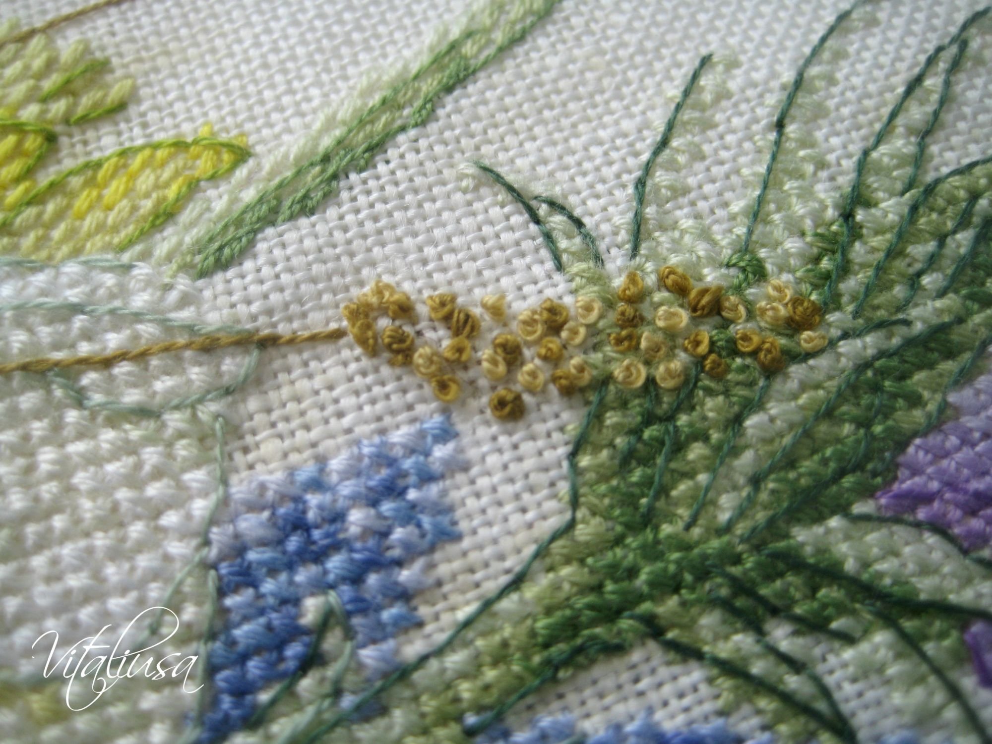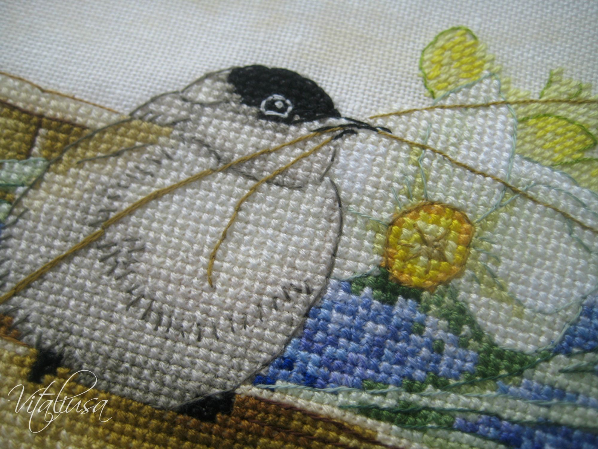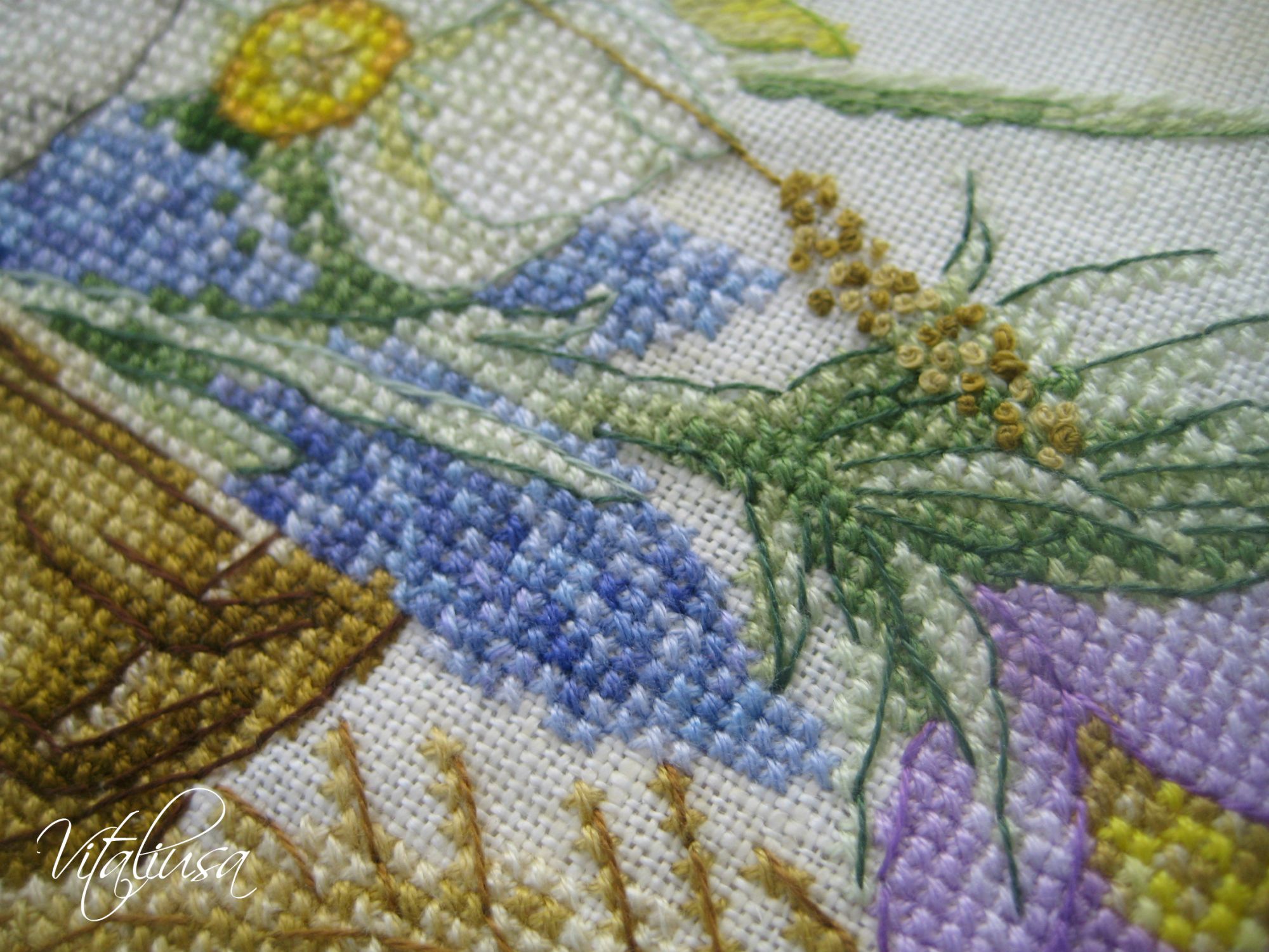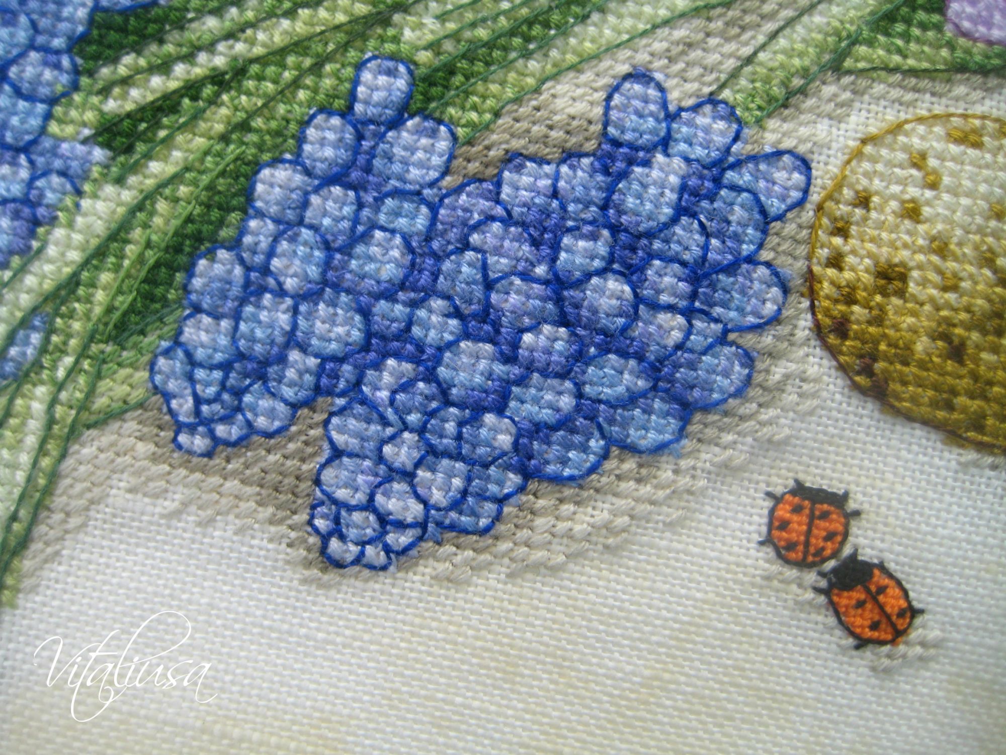 4 мая 2016 Всем привет! С прошедшими и наступающими праздниками! Все-таки хорош месяц май - праздники не только в душе, но и на календаре практически каждый день) Да и как не радоваться, когда всё цветет и такая красота вокруг? Сегодня по дроге на работу встретила вот такую клумбу Фиолетового и всех его оттенков сейчас очень много, ведь цветет и сирень. Но я покажу кое-что пооригинальней, а именно - цветение краснолистой яблони. Эти красавицы высажены на моей работе и каждый май радуют своим необычным цветением. А у меня завершилось цветение на вышивке! В весенних цветах от Натальи Черепановой я поставила последний крестик и сделала последний штрих бэка. Ура! Как всегда много фоток и деталек. В божьих коровках и шмелике используются петиты, получились прямо-таки ювелирные козявки. От шмеля просто балдею! Да и вообще вся работа несказанно радует. Немного о впечатлениях. Это не первая авторская схема, вышитая мною, так вот, общий недостаток всех таких схем (лично для меня) - обилие дробного бэка, зачастую неоправданного. Если брать того же шмеля, то тут да, он маленький, много плавных переходов, плавность линий необходима, поэтому дробный бэк - ОК, норм. Но вот в тех же стеблях или гнезде, вполне можно было бы обойтись счетным. Еще момент по бэку - он суперразноцветный! 23 цвета бэка, Карл! К тому же на схеме он также разноцветен, т.е. на моей хоть и цветной распечатке цвета естественно искажались, поэтому отличить зеленый и оливково-зеленый бэк было практически нереально. Только схема на мониторе была в помощь, а я ведь вообще-то не у монитора вышиваю... Во всем остальном у меня нет никаких нареканий, схема "вылизана" идеально, цвета подобраны деликатно. Но опять же - здесь более 60 оттенков, это много (и в финансовом плане тоже), особенно для тех, у кого нет хотя бы половины палитры дмс. Но именно благодаря этому было интересно вышивать, т.к. никакой цвет не приедался, цветотерапия, конечно, шикарная! Недавно увидела в галерее отшив по набору Ланарте, разработанный по этому же исходнику и поняла, что все мои труды не напрасны. Опять же на мой взгляд - разработка Н. Черепановой смотрится намного выигрышней. Никого не хочу обидеть, но Ланарте уж очень простенько смотрится, если сравнивать. Короче, результат меня вдохновил! Ну и напоследок покажу небольшое продвижение клейтоновского круга. Вот уж где я оторвалась! Шей себе небо и ни о чем не думай) Желаю всем отличного майского настроения! IDEN, Хельга, Wian и 35 других сказали спасибо Поделиться сообщением Ссылка на сообщение