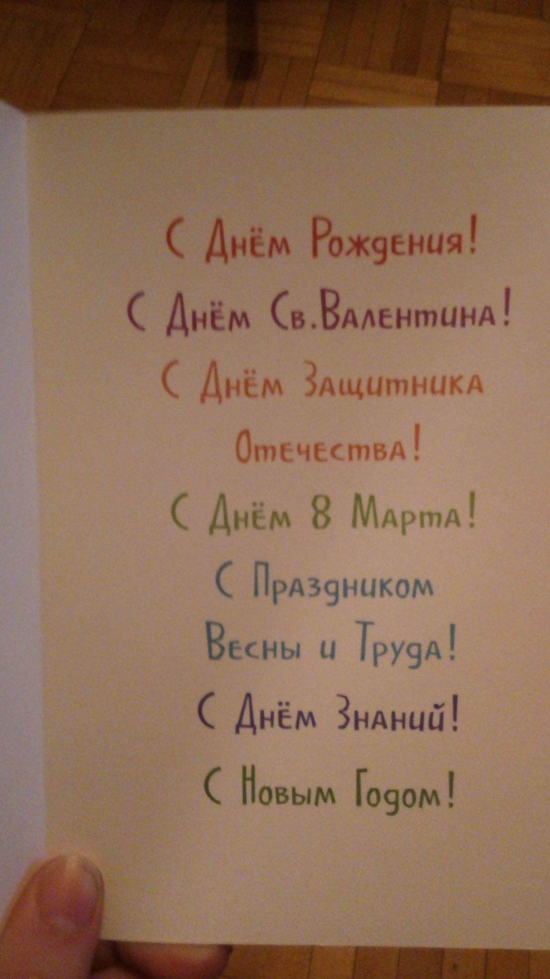 5 мая 2017 Наташк) принесла открытки) Первая, я покупала для брата, но потом передумала ее дарить и внутри . А вторая меня просто радует) на столько она "смешная" и внутри . оленек, Камма80, kiliska и 9 других сказали спасибо Поделиться сообщением Ссылка на сообщение